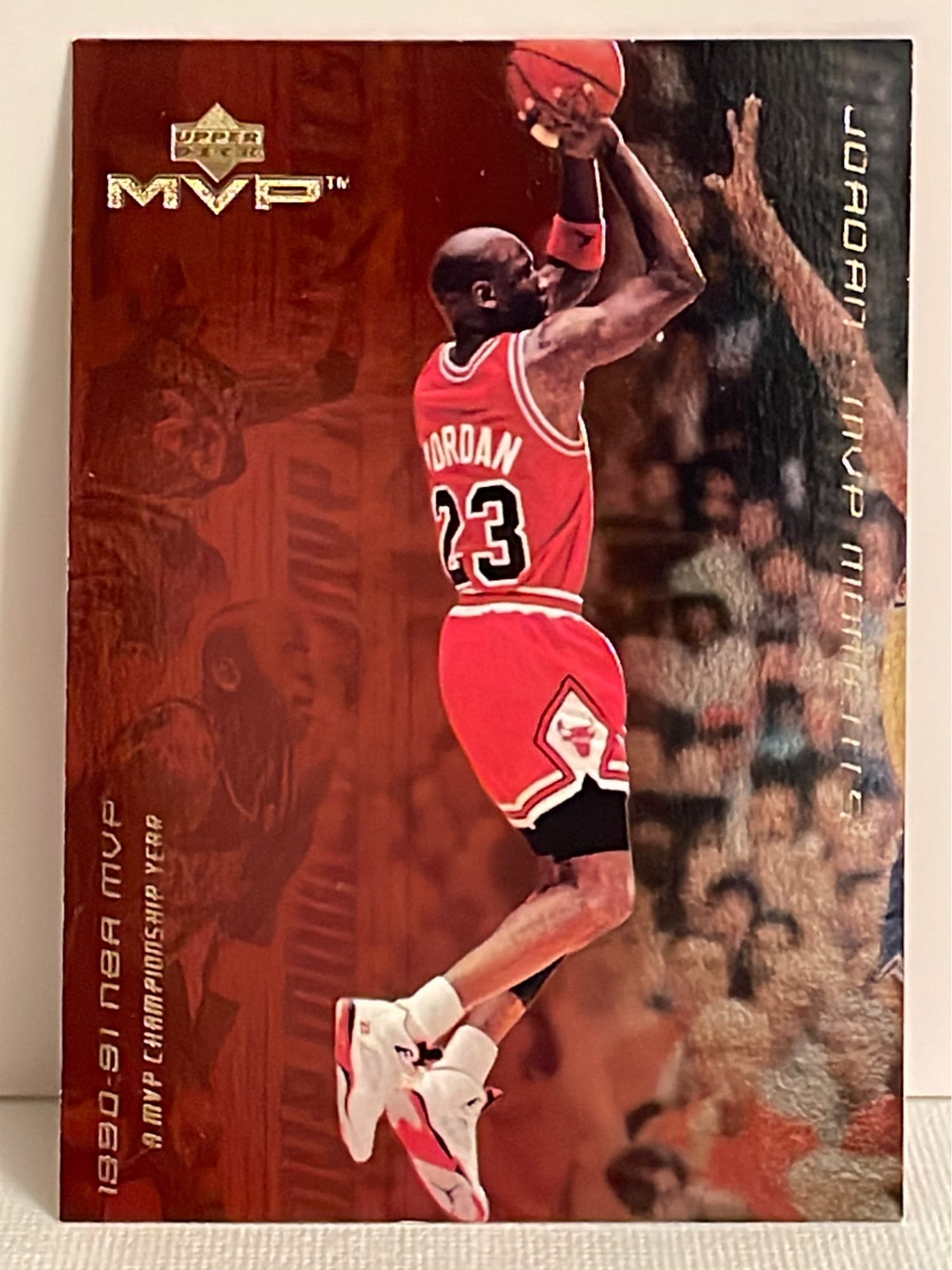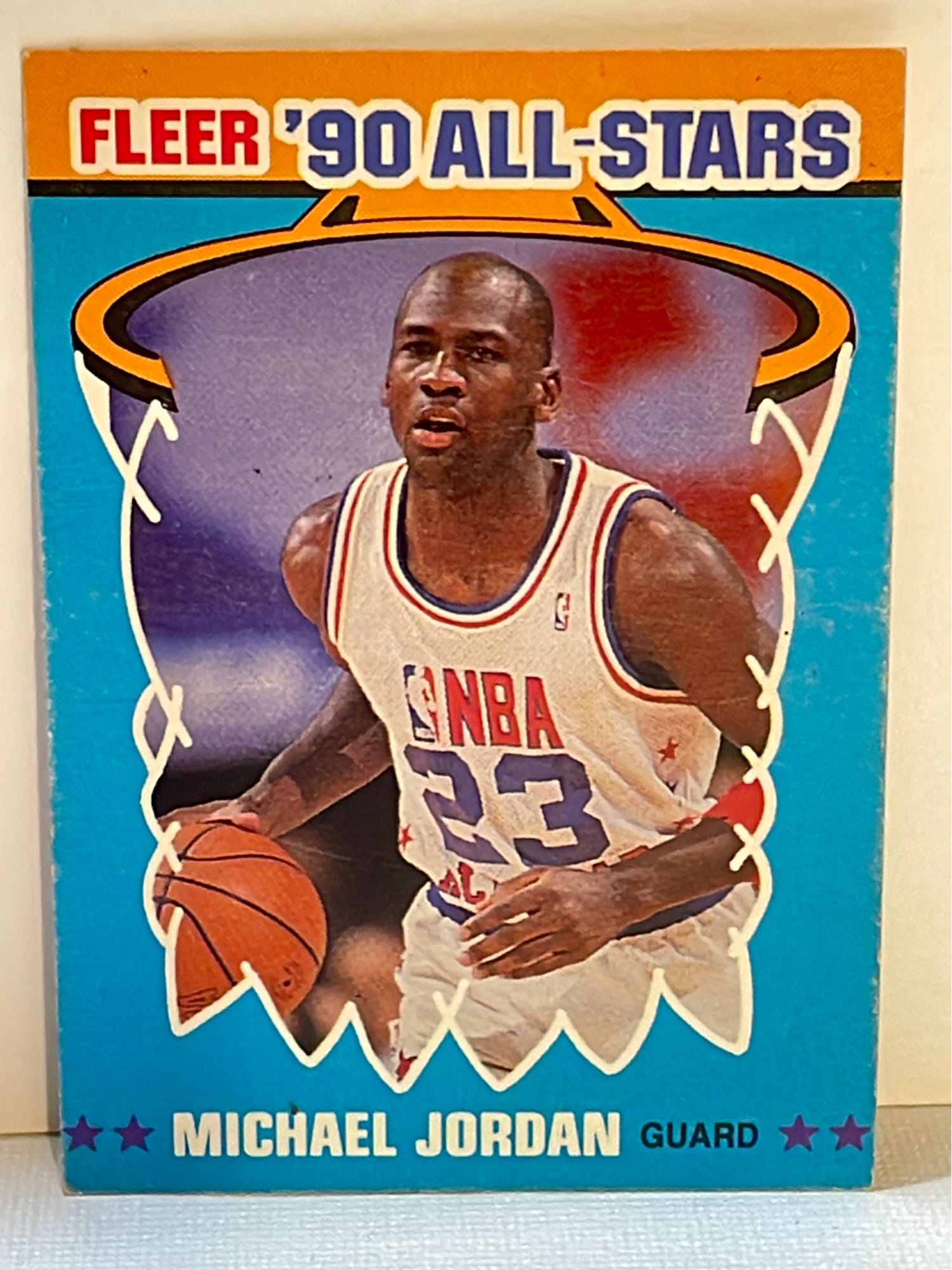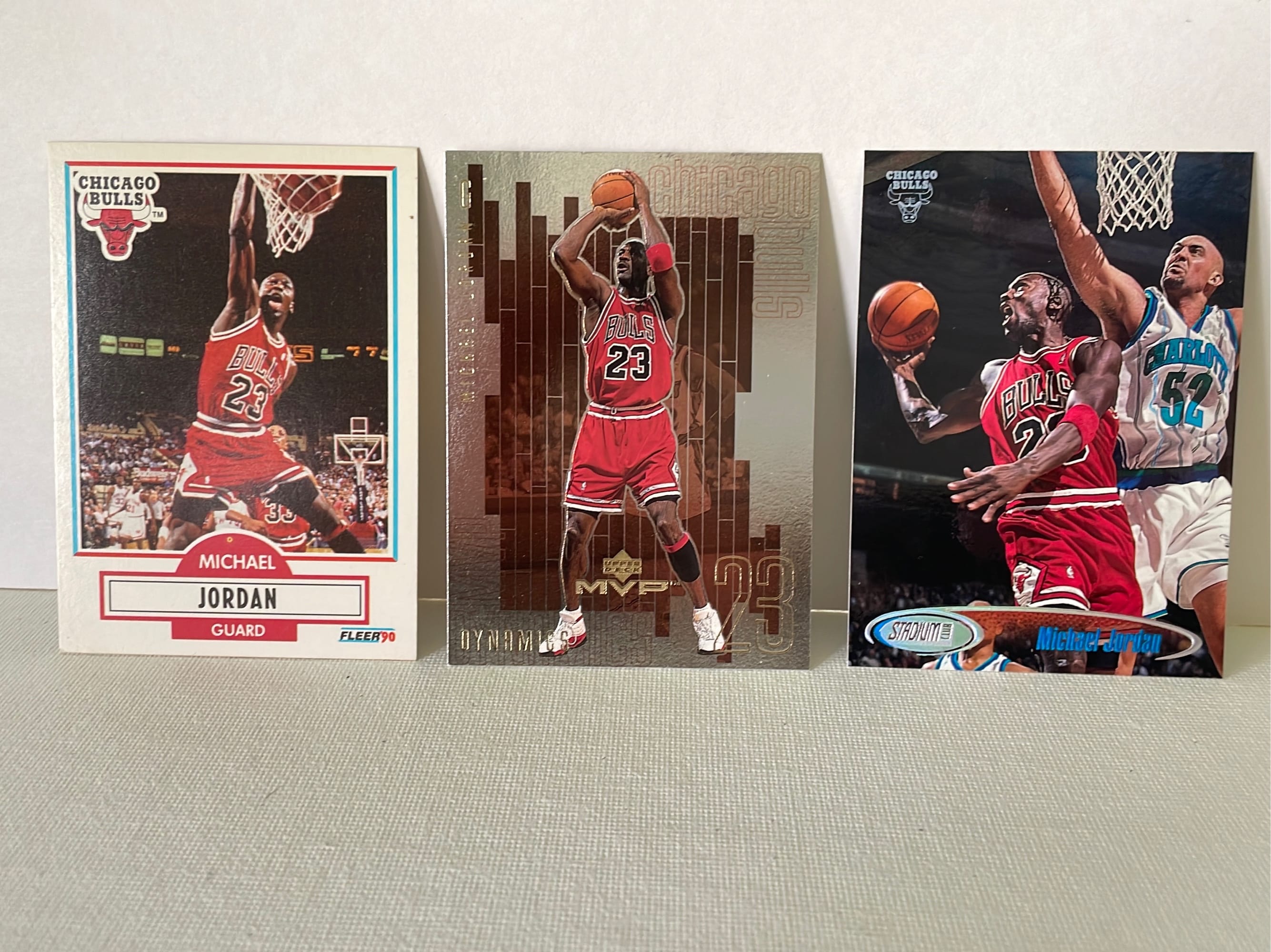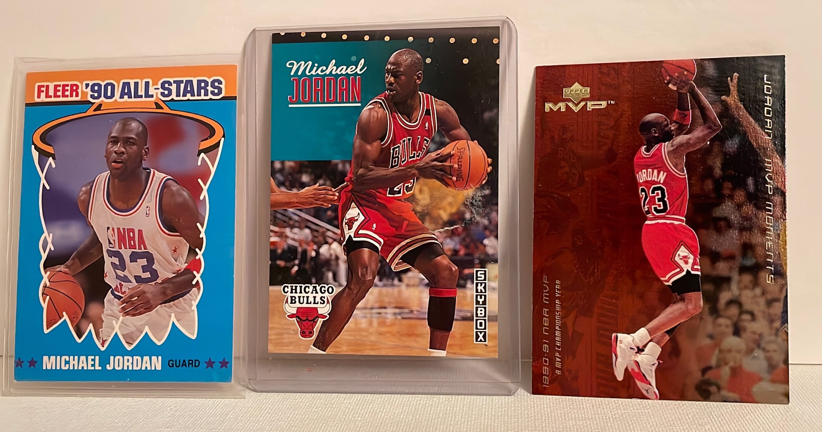 107 (3) Michael Jordan Basketball Cards: Fleer ‘90 All-Stars No.5 of 12, SkyBox 1992 #31, Upper Deck 1999 MVP with red metallic background