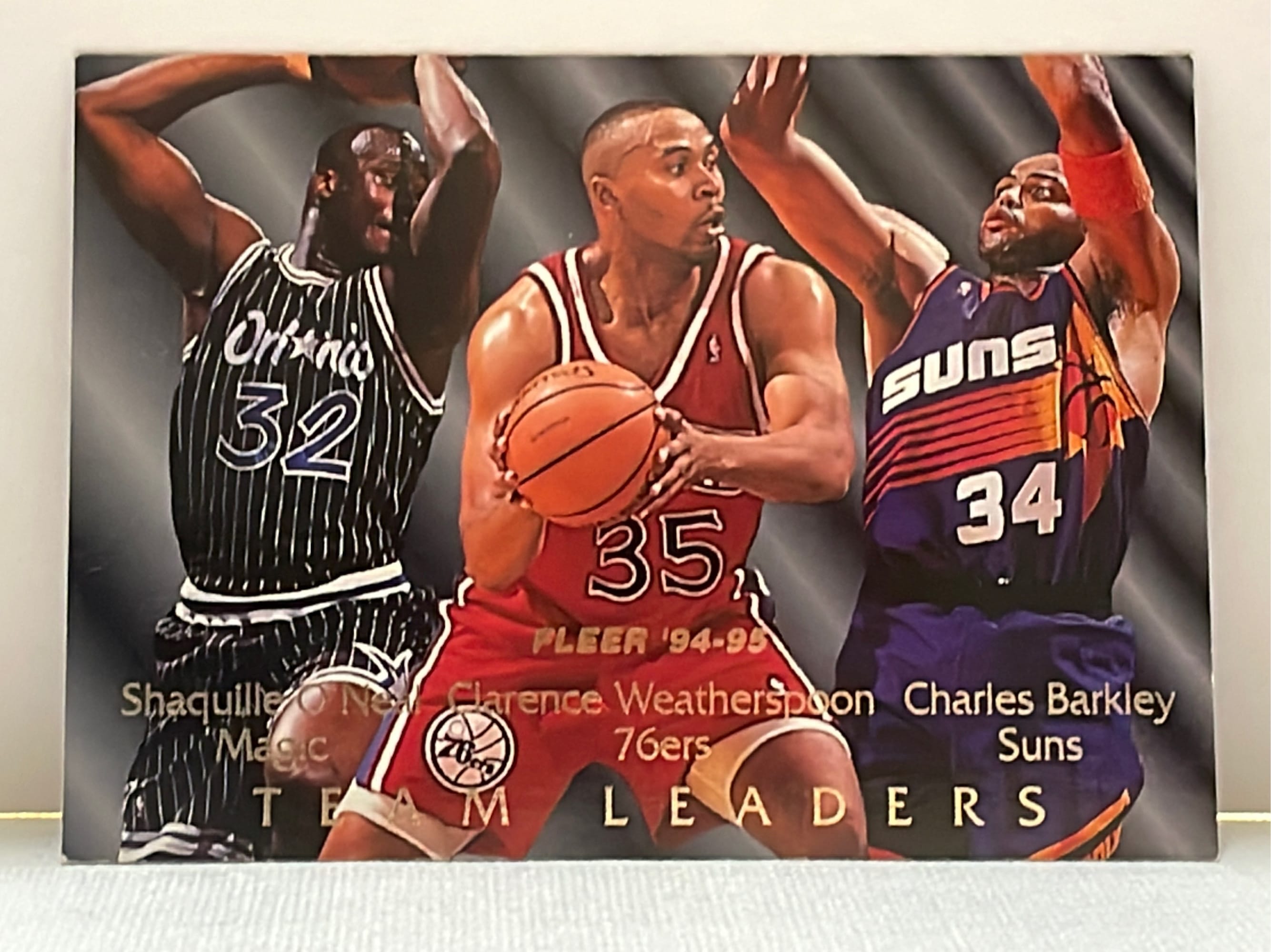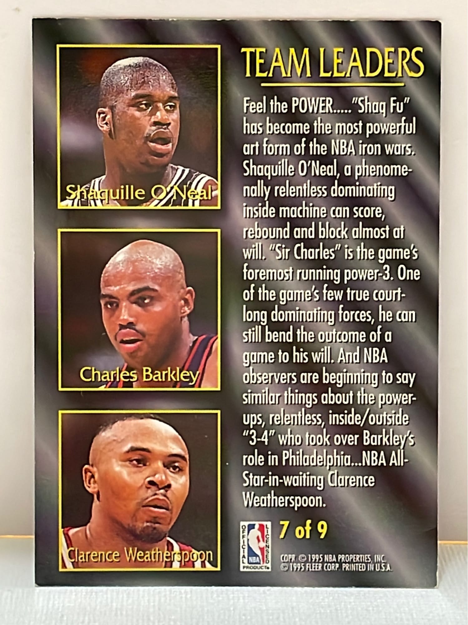 123 1995 Fleer Basketball Card 7 of 9: “Team Leaders” Shaquille O’Neal, Clarence Weatherspoon, Charles Barkley