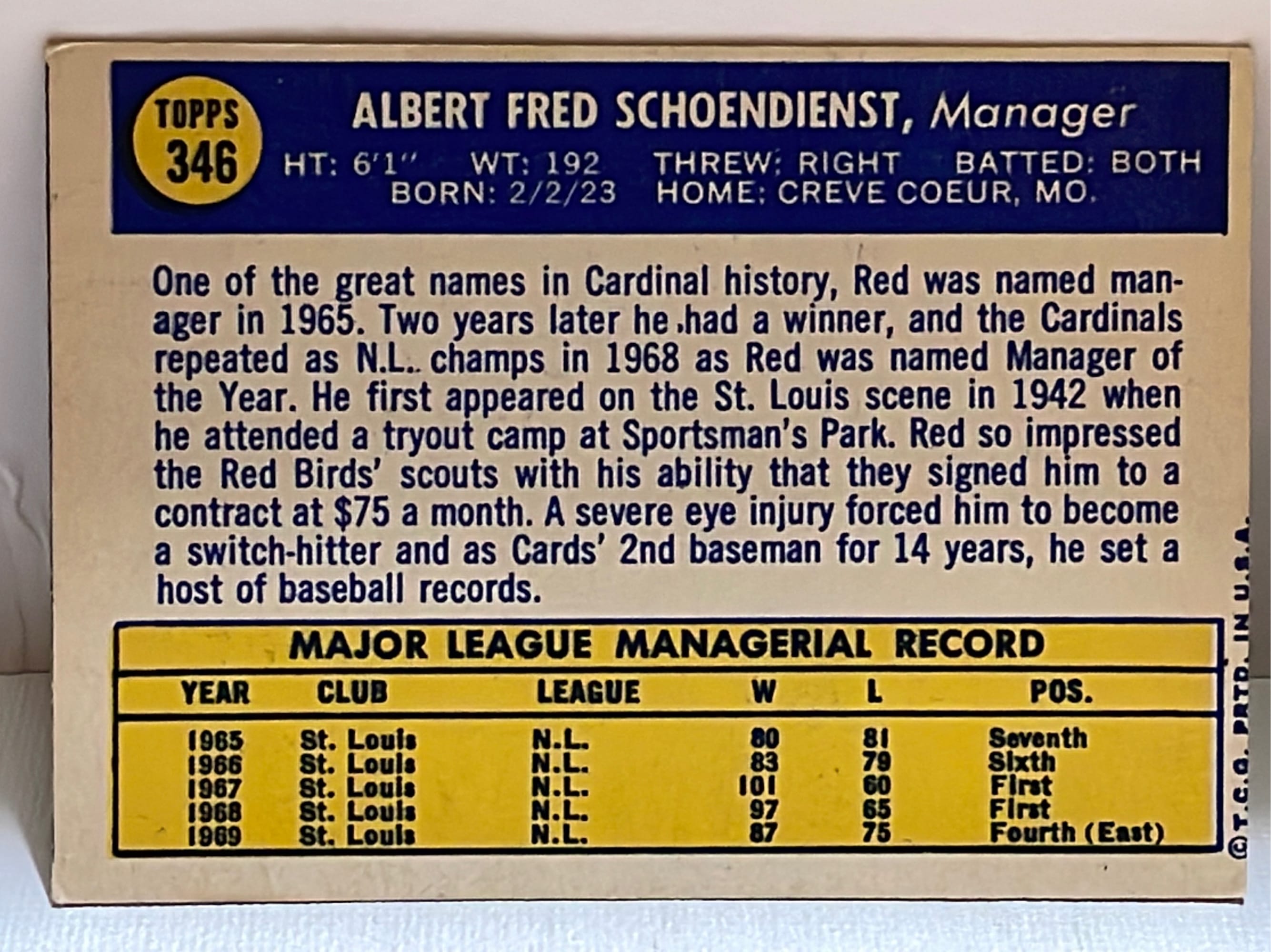 299 1969 TOPPS Baseball Card #462: Red Schoedienst, Manager