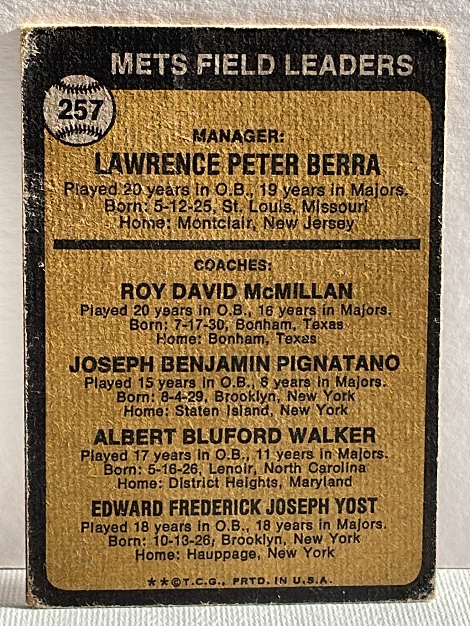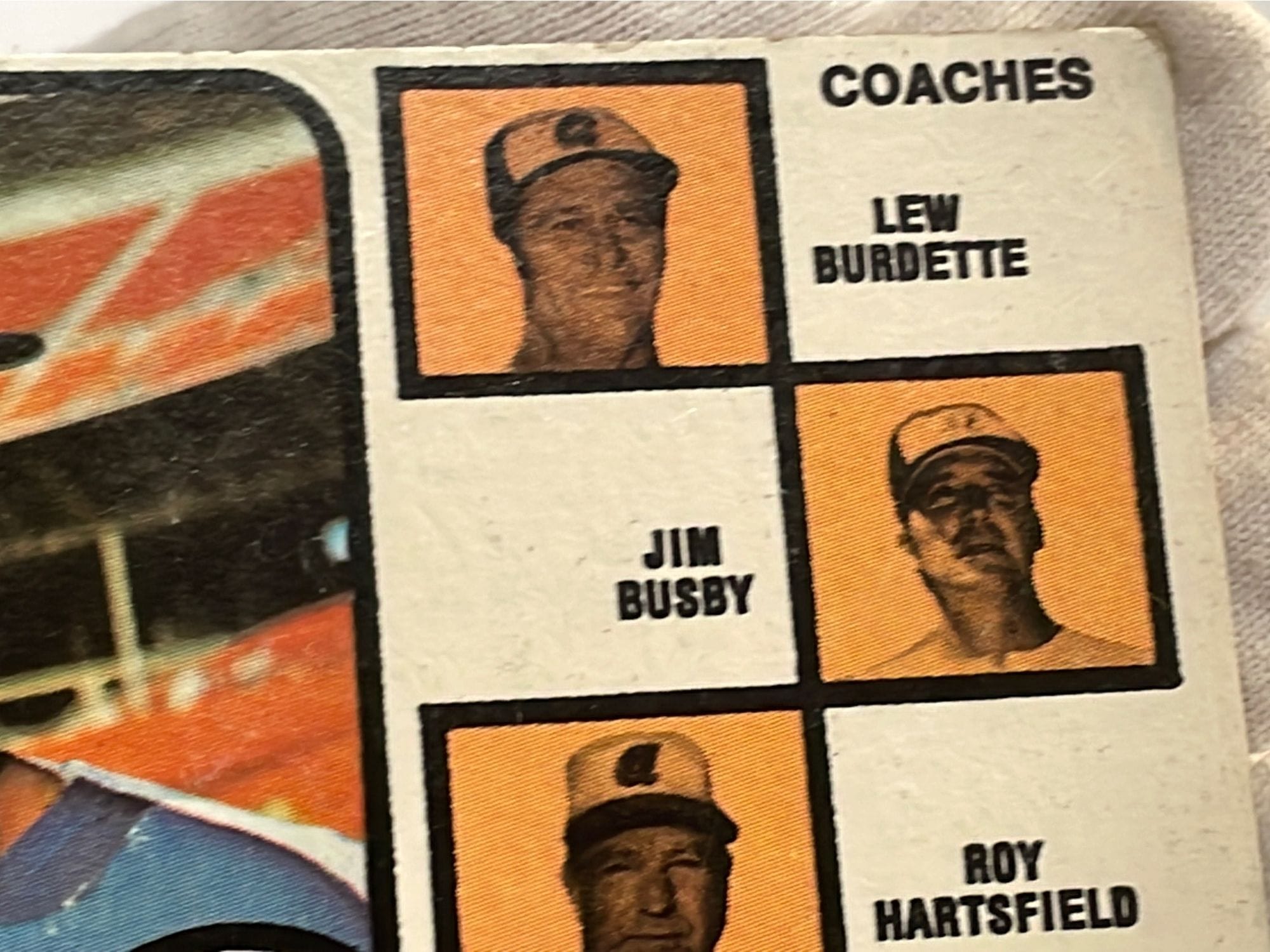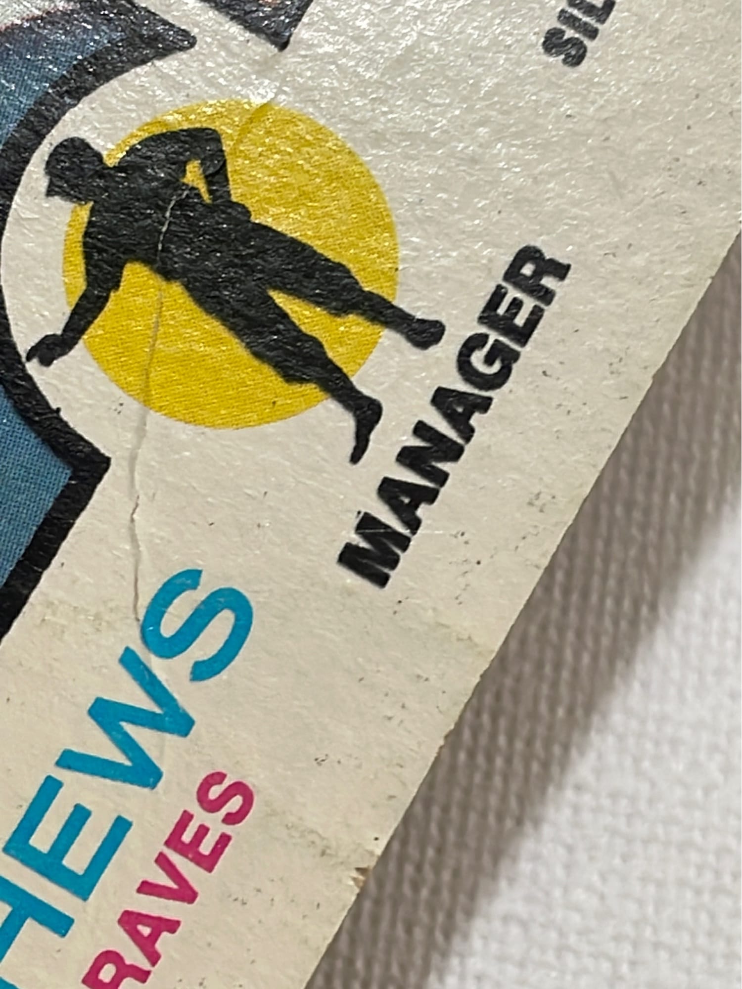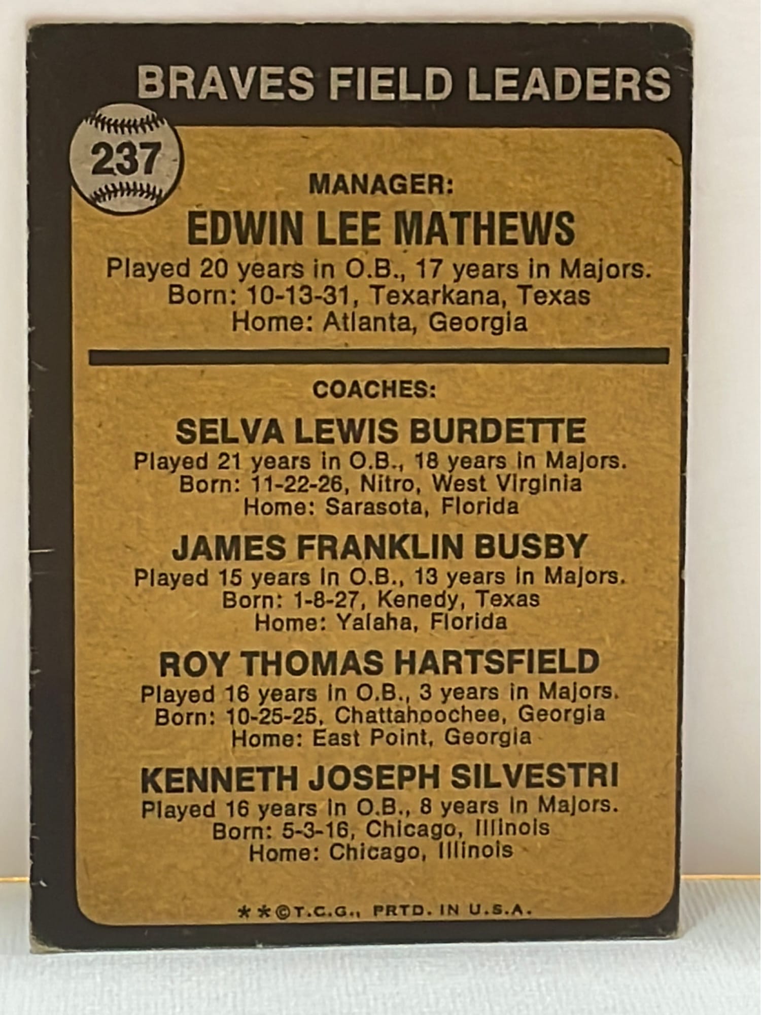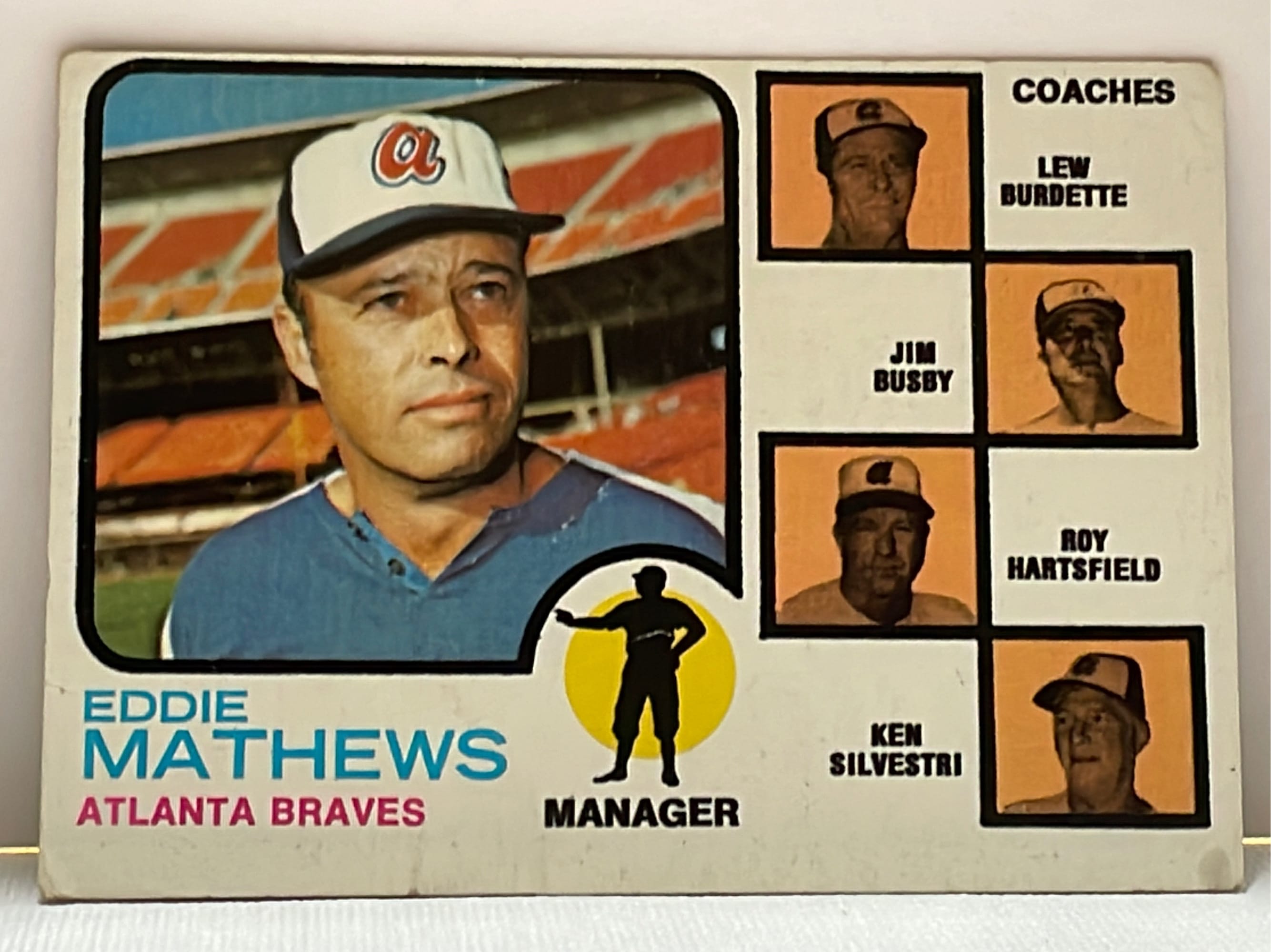 237 1973 Topps Baseball Card: MANAGER Eddie Matthews with COACHES Burdette, Busby, Hartsfield, Silverstein - used