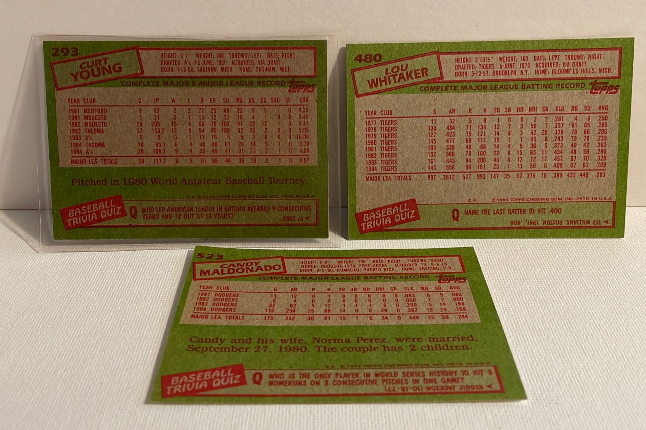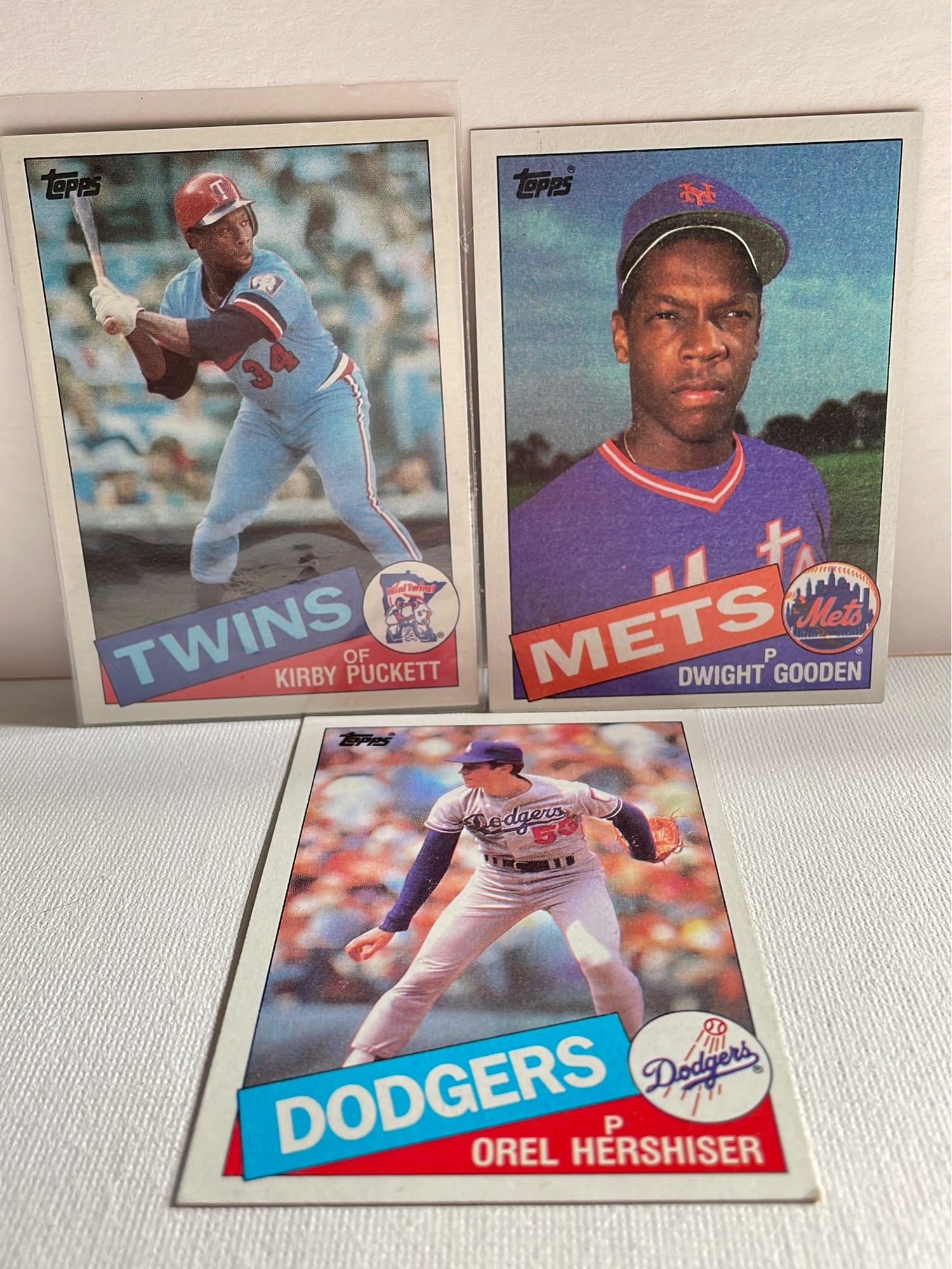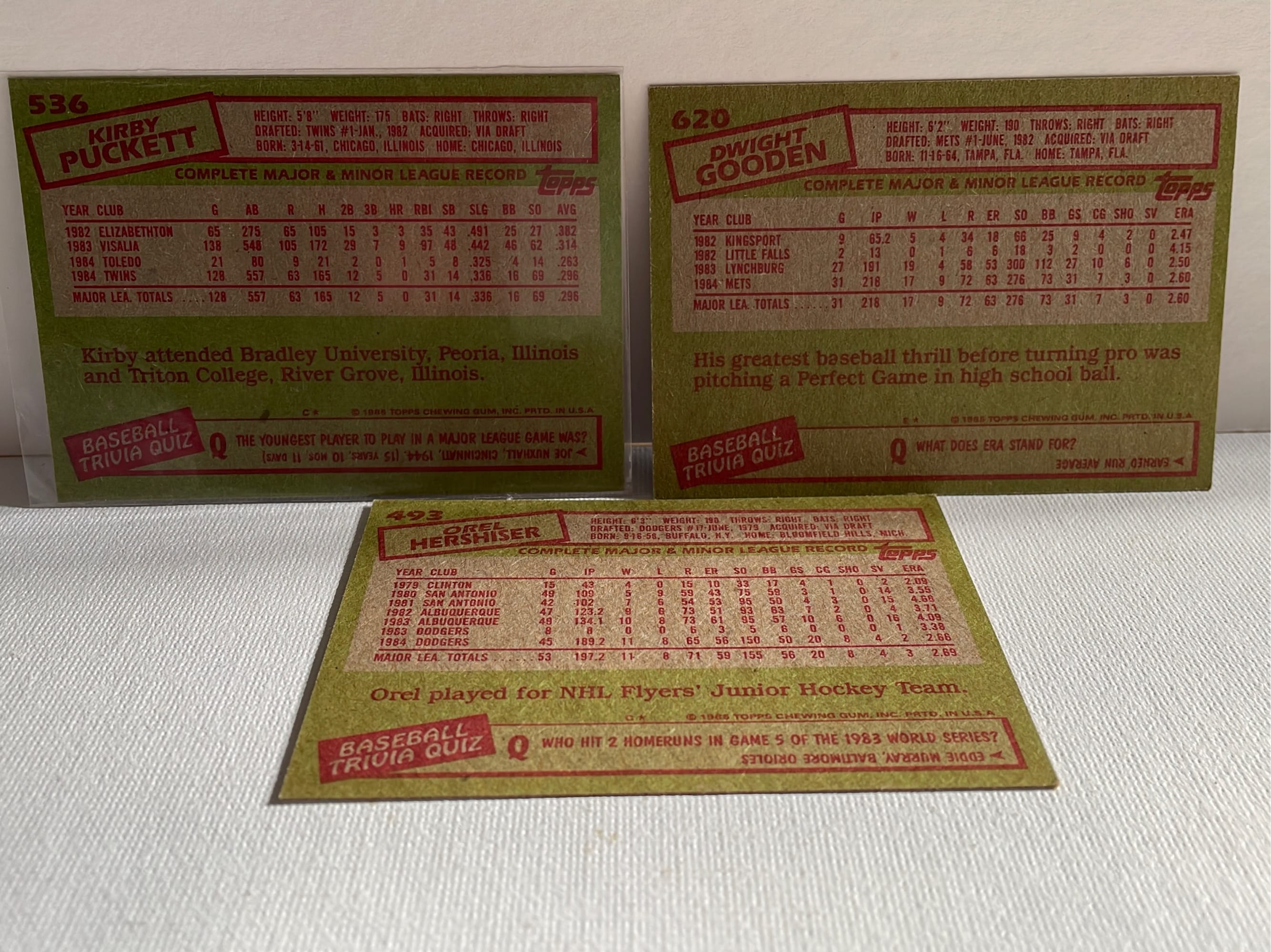 265 3 - 1985 Topps Baseball Cards: Hershiser #493, Gooden #620, Puckett #536