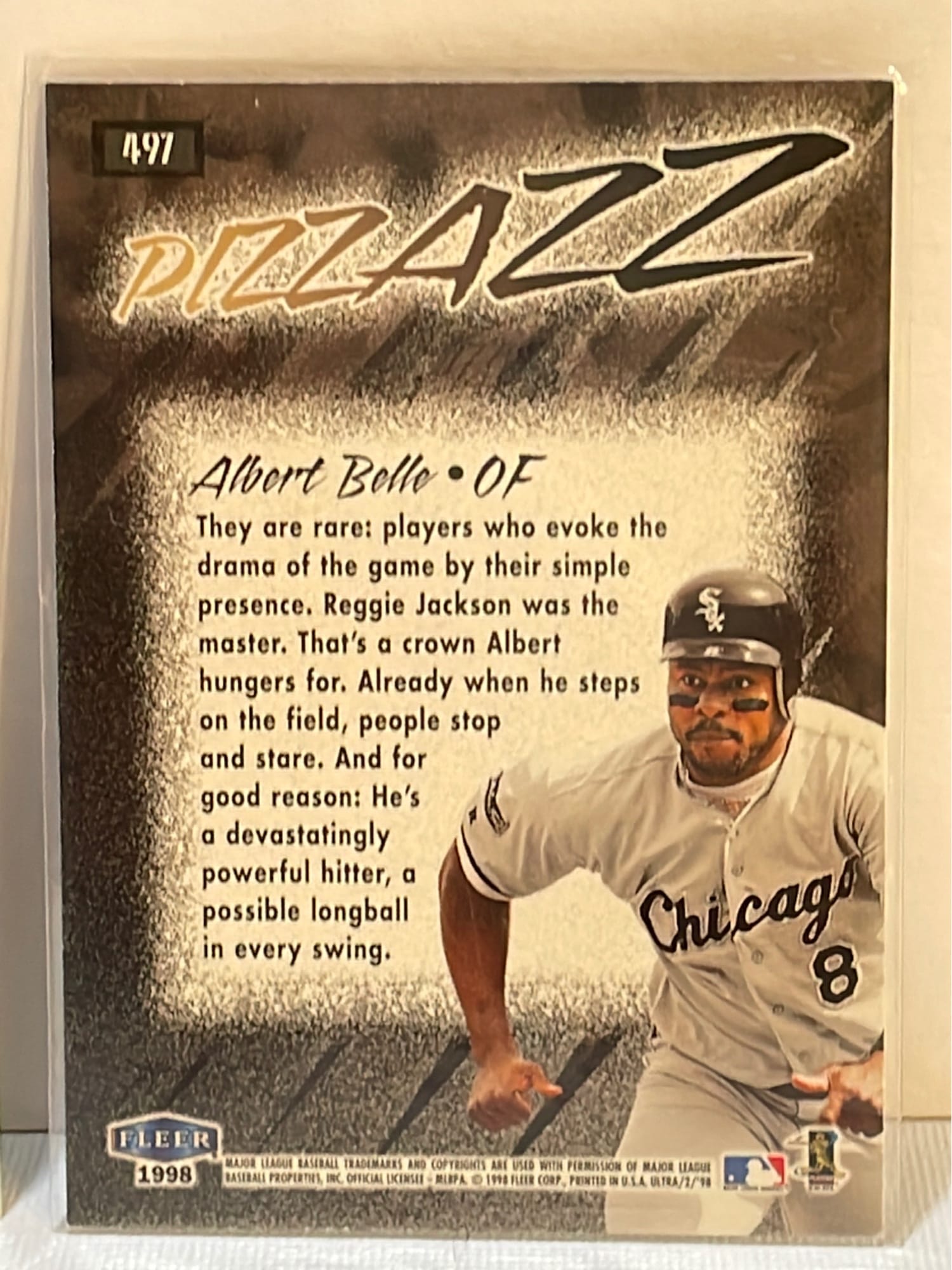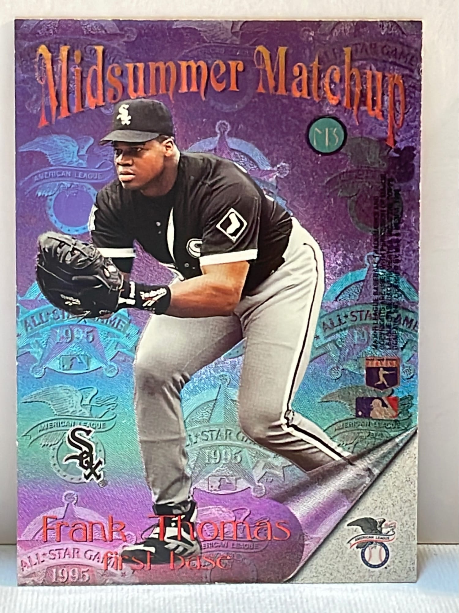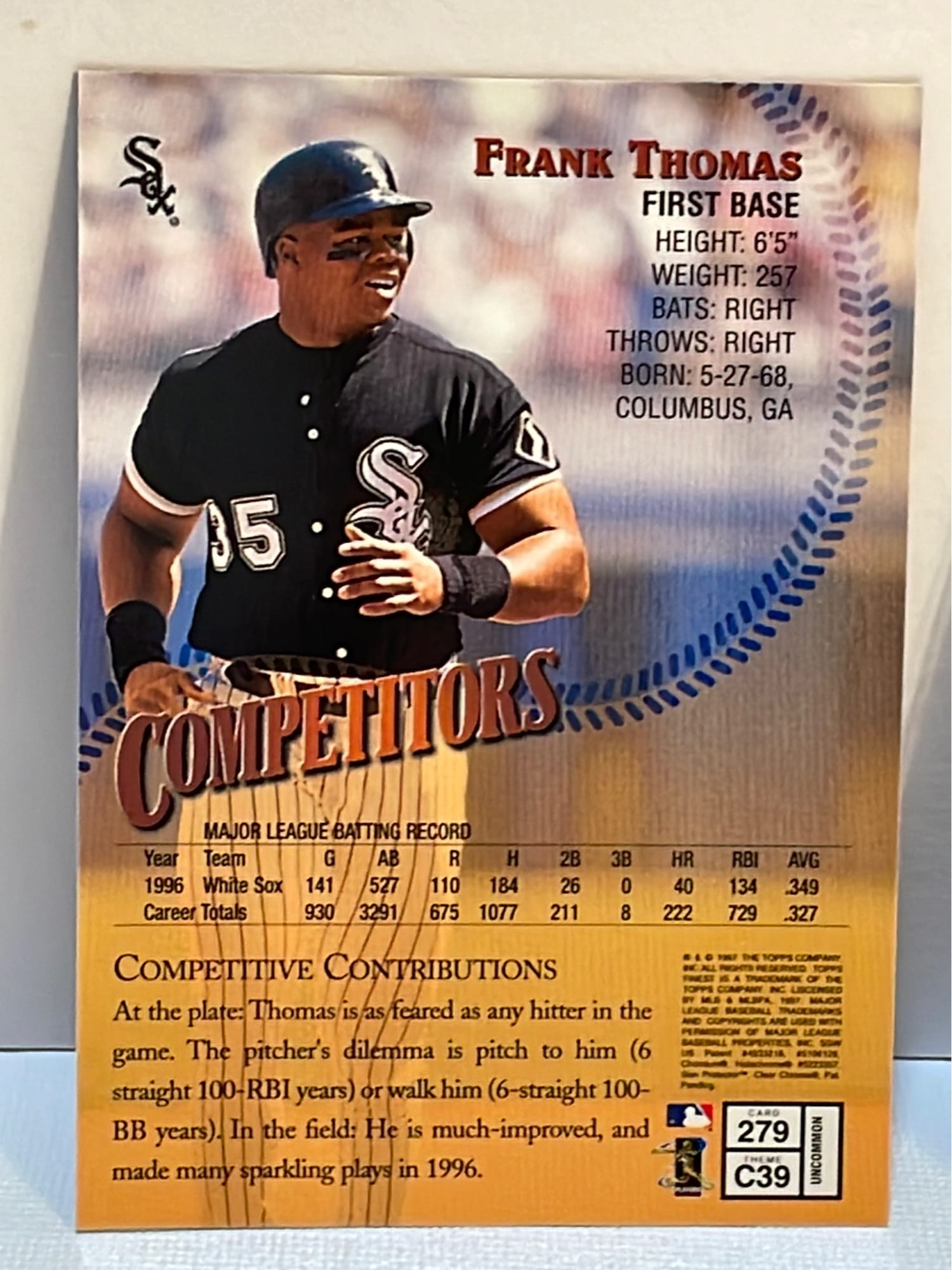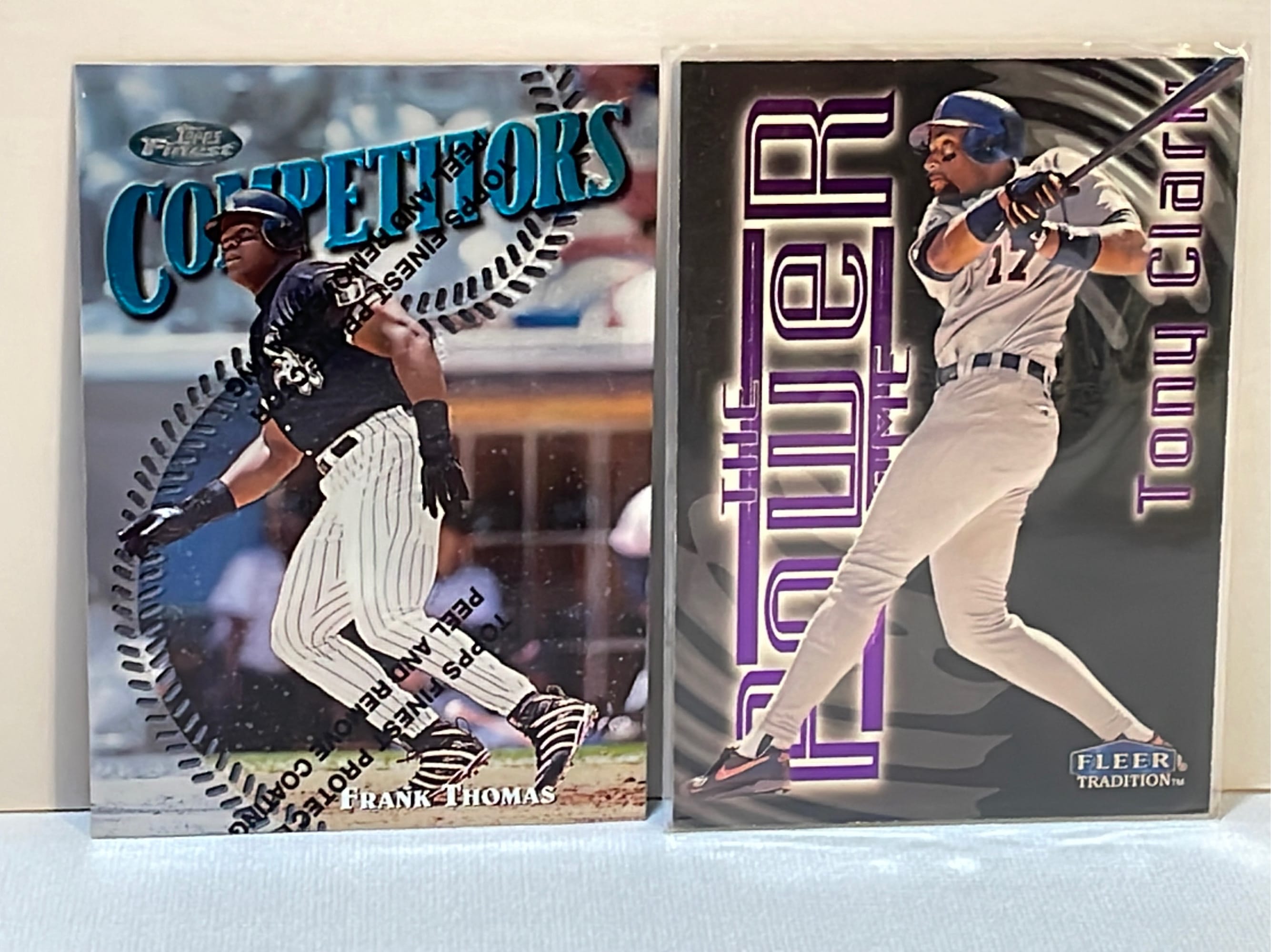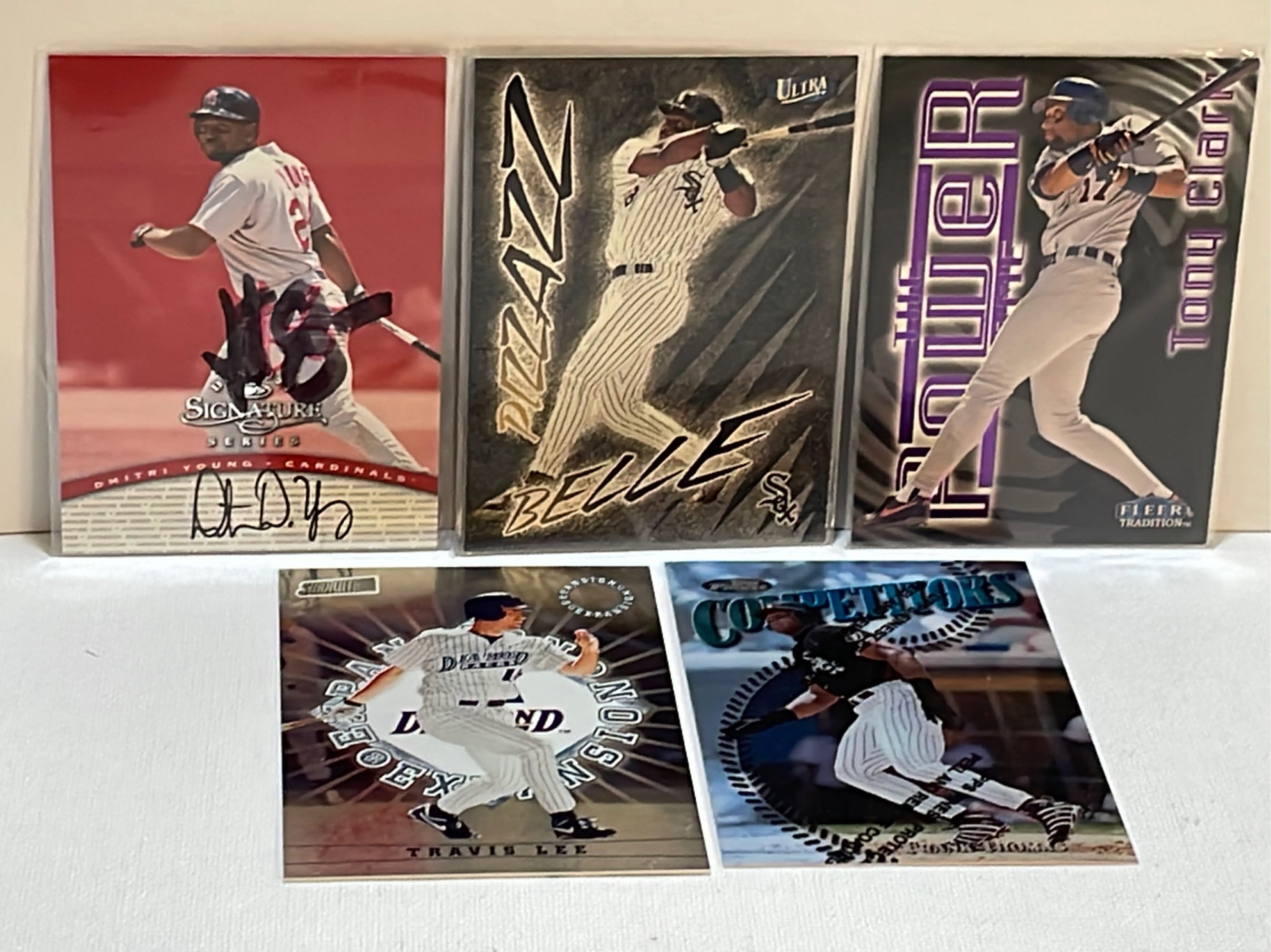 257 5 - 1997-‘98 Baseball Cards: Frank Thomas (peel and remove coating), Young, Belle, Clark and Lee