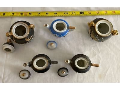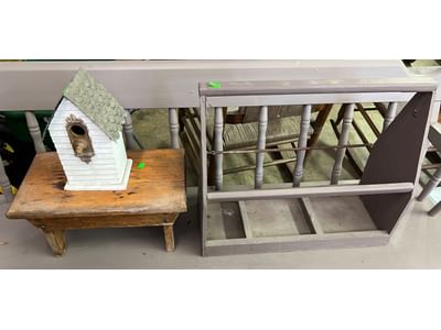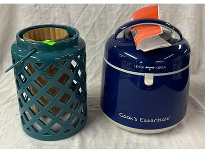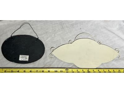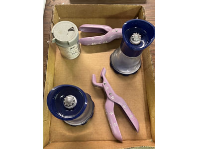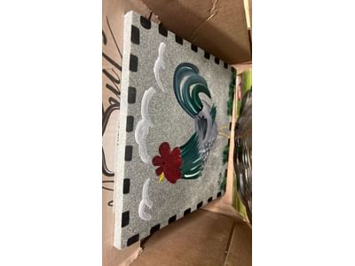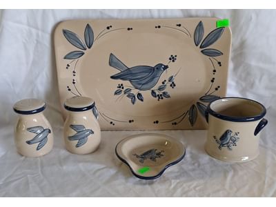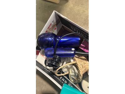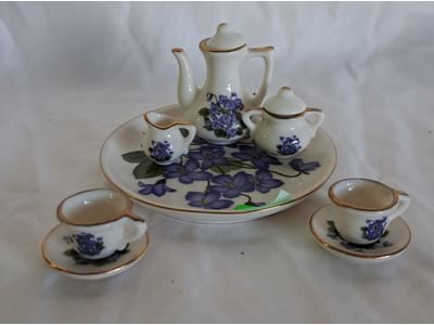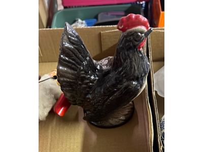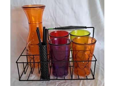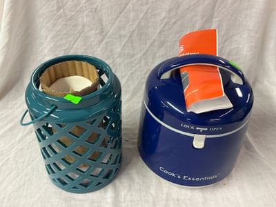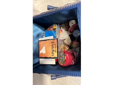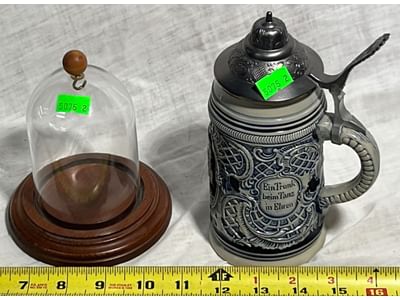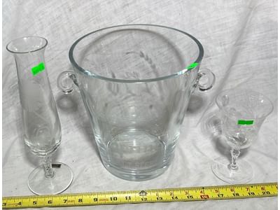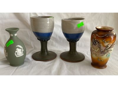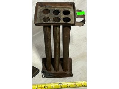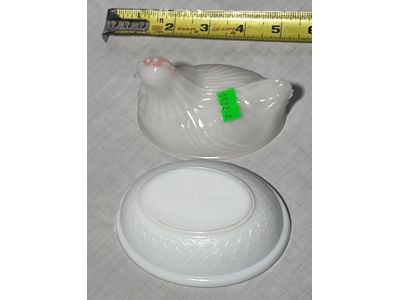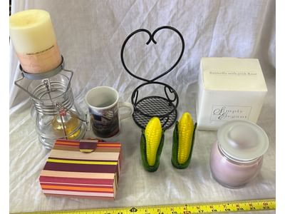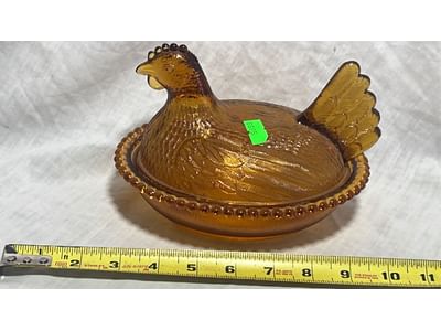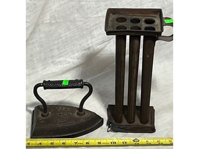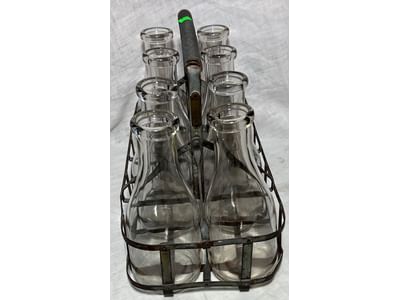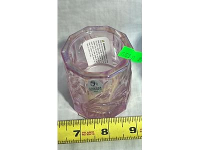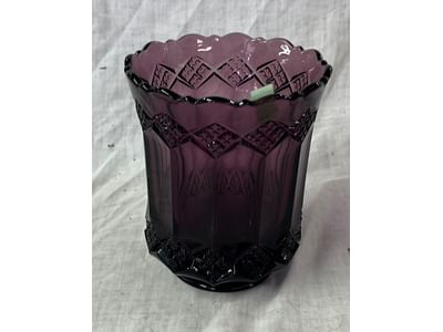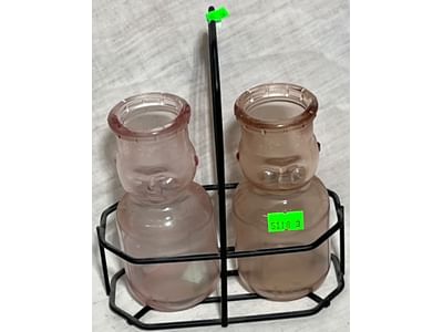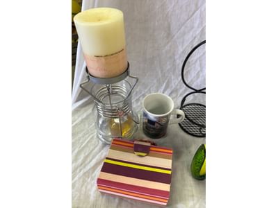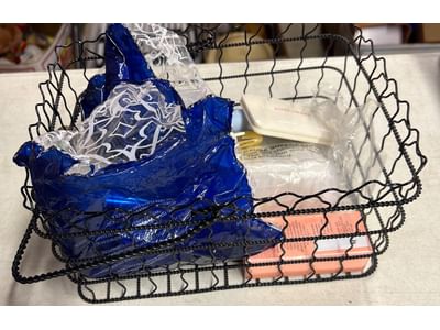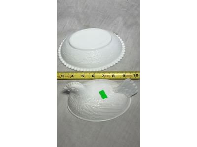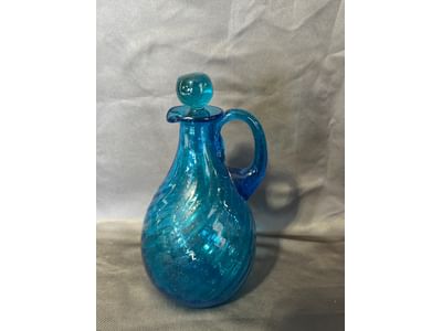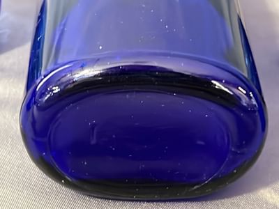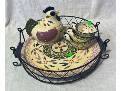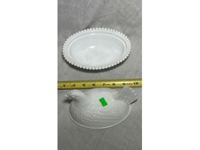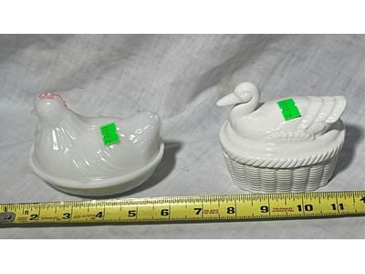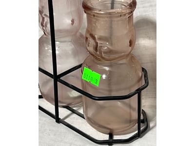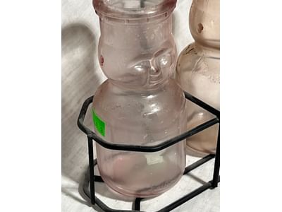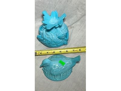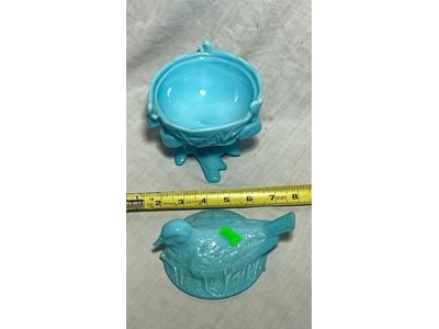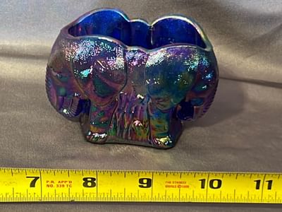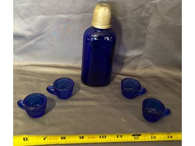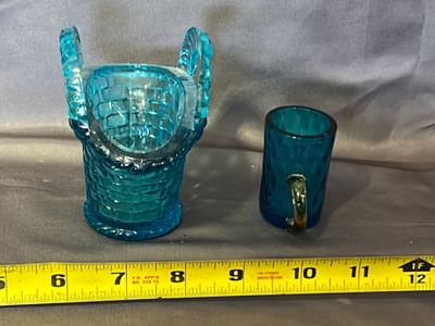 6715 Vintage Blue Cobalt Bottle 6.5” • Purple Double Elephant Head Carnival Glass Toothpick Holder 3.5” • Miniature Mug & Cobalt Blue Miniature Cups • Chicken Design Trivet 7.5” • Ice Blue Glass Basket 4”