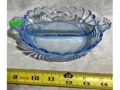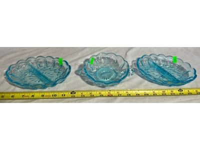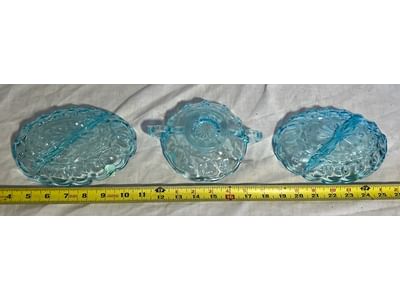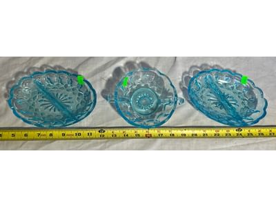 6703 Fairfield Aqua Blue by Anchor Hocking Nappy Bowl with Double Handles 5.25” • Two - Aqua Blue Oval Divided Dish Indiana Glass Scalloped Edge Thumbprint Pattern 7”
