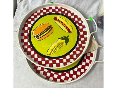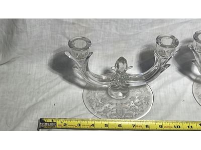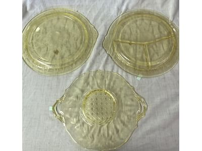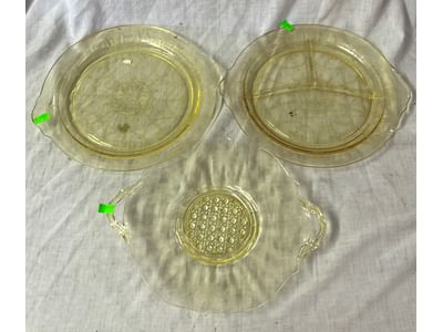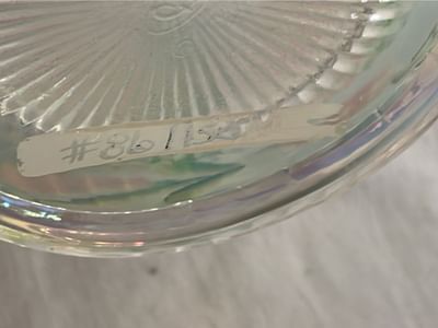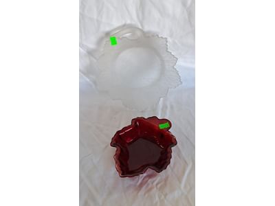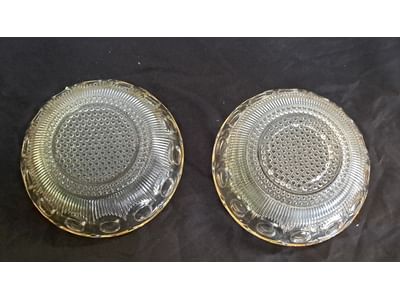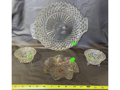 6716 Two - Clear Daisy & Buttons Footed Ashtrays 3.75”x2” • Ruffle Edged Bowl with Cherry Design 6” • Vintage Glass Clear Cake Plate Diamond Handles Round Serving Tray Platter 10”