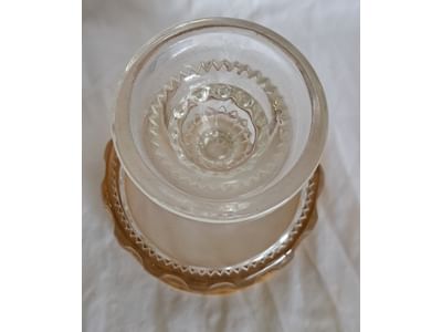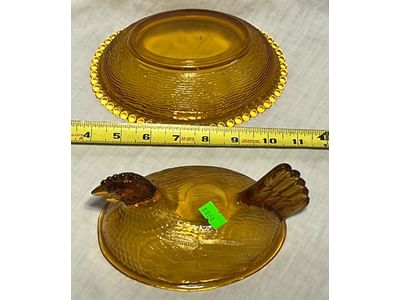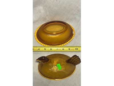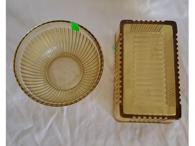 6694 Amber ribbed bowl 4.75" wide, Amber butter dish top 2 1/8" tall