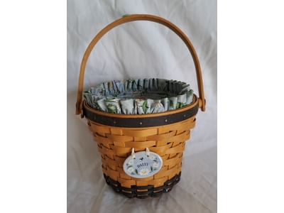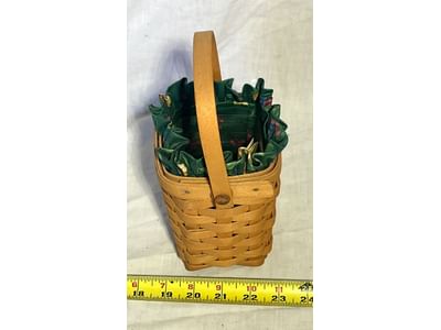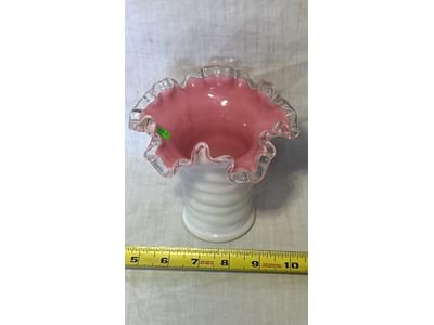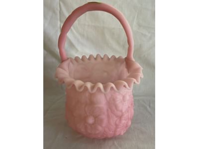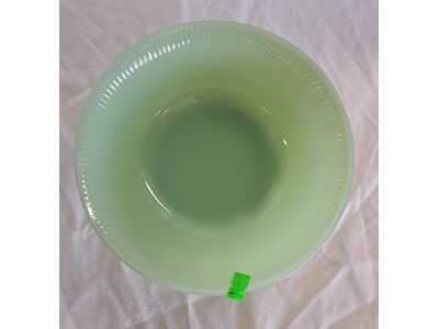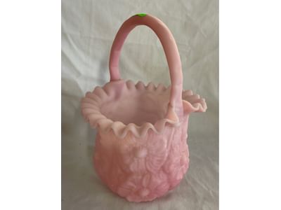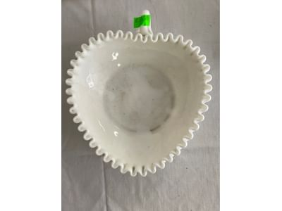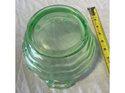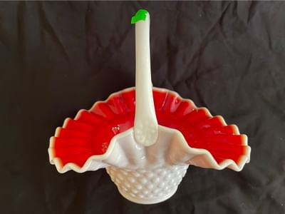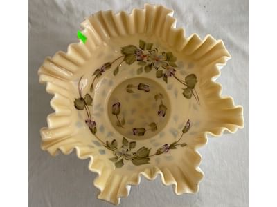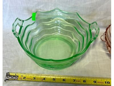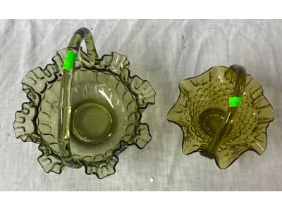 6754 Hobnail green glas basket 6”, Green Glass Thumbprint Basket Olivine Double Crimped Ruffle Edge 7”x8”