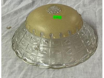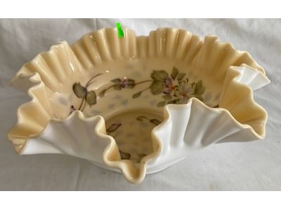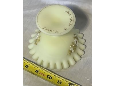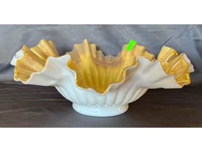 6725 Vintage Yellow Marbled Iridescent and Milk Glass Ruffled Bowl 10.75”