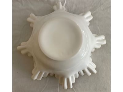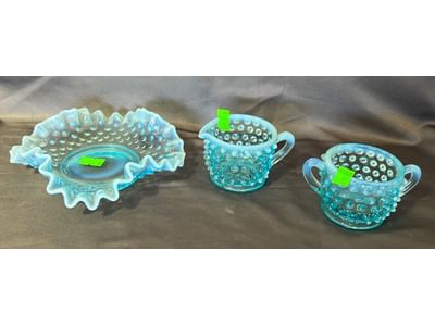 6713 Blue Opalescent Hobnail Crimped Edge Dish 5” • Blue Opalescent Hobnail Miniature Cream 2.25” & Sugar 2”