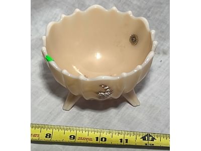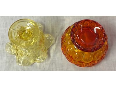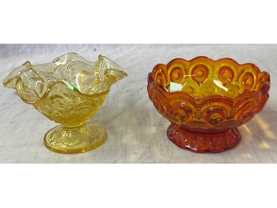 6772 Fenton Strawberry Pattern Ruffled Yellow Glass Candy Dish Bowl 4.5”, L.E. Smith Moon and Stars Orange Pressed Glass Footed Bowl 4.5”