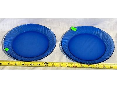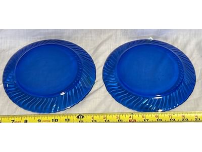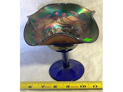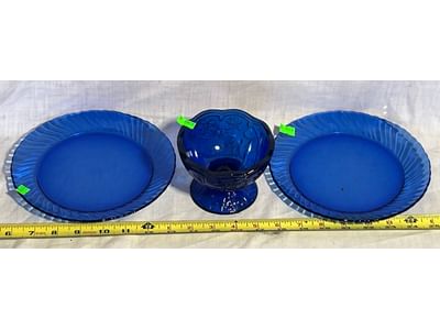 6701 Two - Cobalt Blue Swirl Edge Plates 7.75” & Summit Art Glass Russ Vogelsong Pedestal Fruit Bowl with fish & Flower Design 4.5”x3.25”