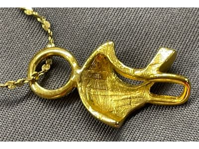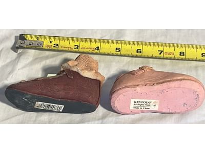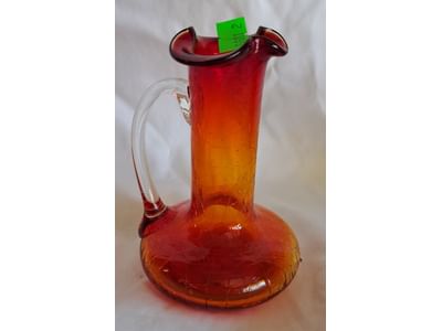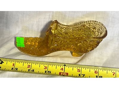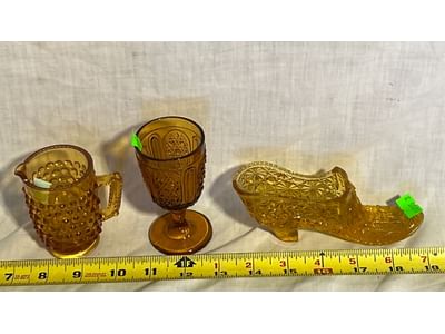 6695 Amber Daisy & Bow Slipper 5.5” • Amber Glass Hobnail Miniature Pitcher 3” • Amber Glass Miniature Goblet 4”