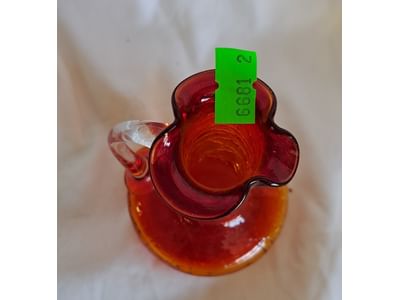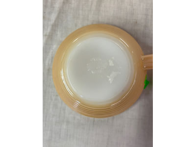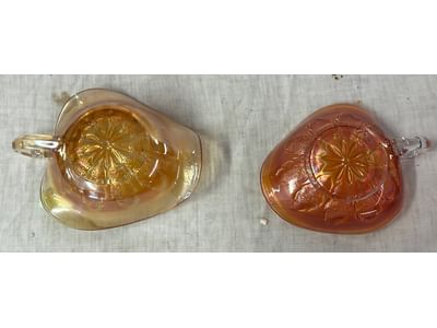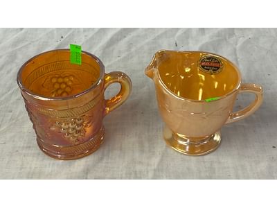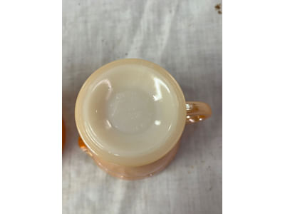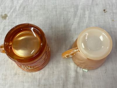 6756 Fire King peach luster anchor glass creamer 4”, Marigold Dugan Carnival Orange/Peach Iridescent Rainbow Depression Glass Mug w/grape vine design and handle 3.5”
