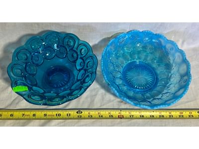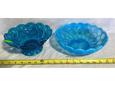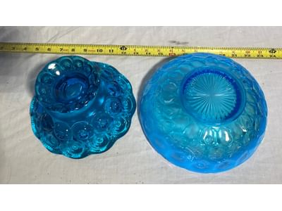 6709 Vintage L.E. Smith Glass Moon & Stars Blue Footed Compote 7.75”x4” • Art Glass Honeycomb & Clover Blue Opalescent Berry Bowl 9"