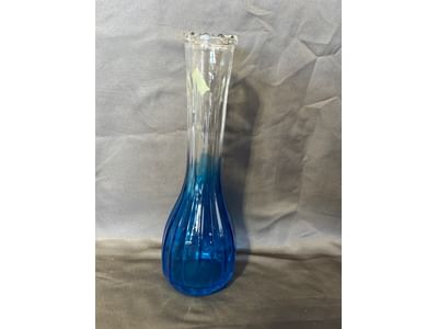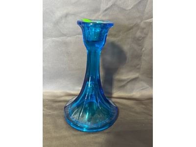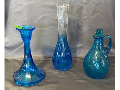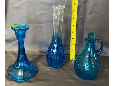 6711 Tall Blue Glass Candlestick 6.5” • Blue & Clear Flower Vase 8.75” • Retro Ice Blue Bubbly Art Glass Cruet 6.25”