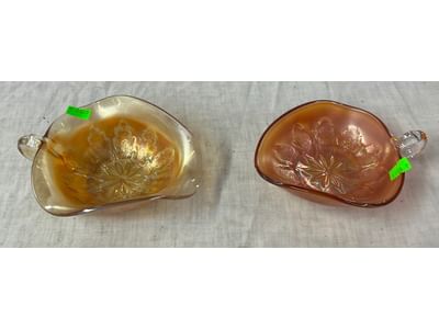 6759 Carnival Glass Dugan Leaf Rays Nappy Dishes Marigold Iridescent Depression Glass 7”x5”, Dugan Carnival Glass Leaf Rays pattern Finger Nappie 6.5”x5”