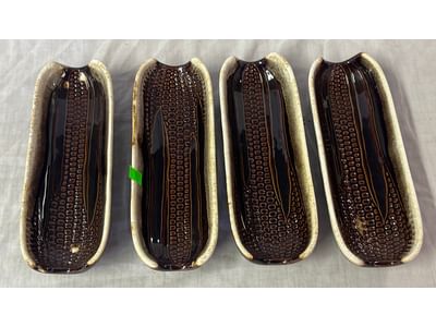 6778 4- Pfaltzgraff stoneware brown drip embossed corn husk pattern corn holder dishes 8.5”