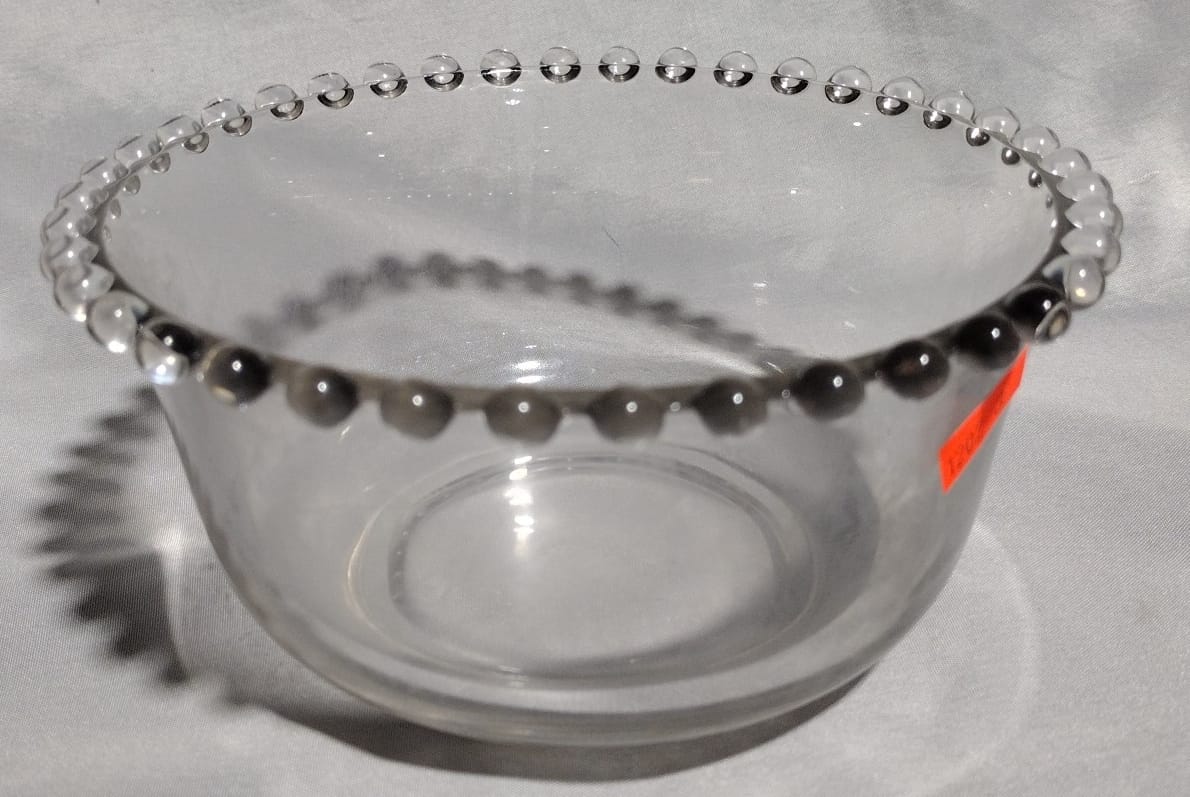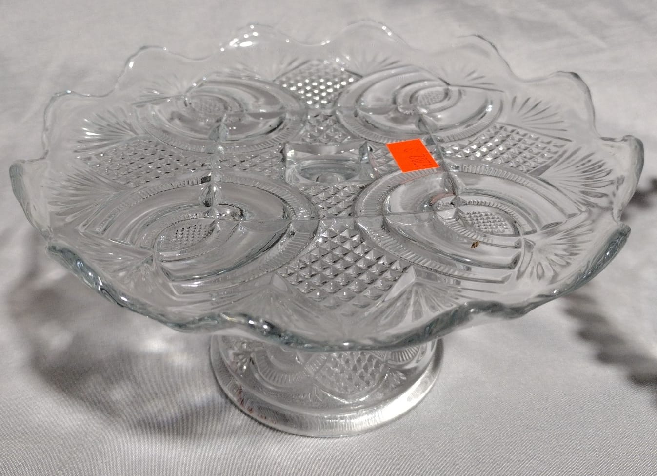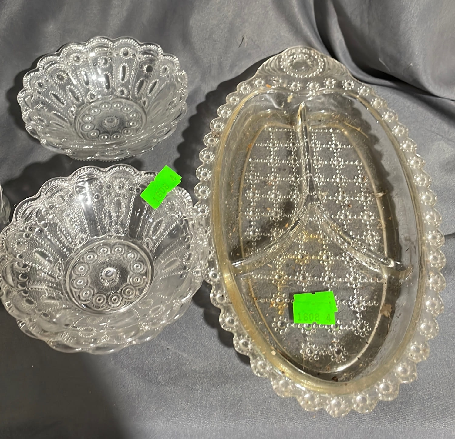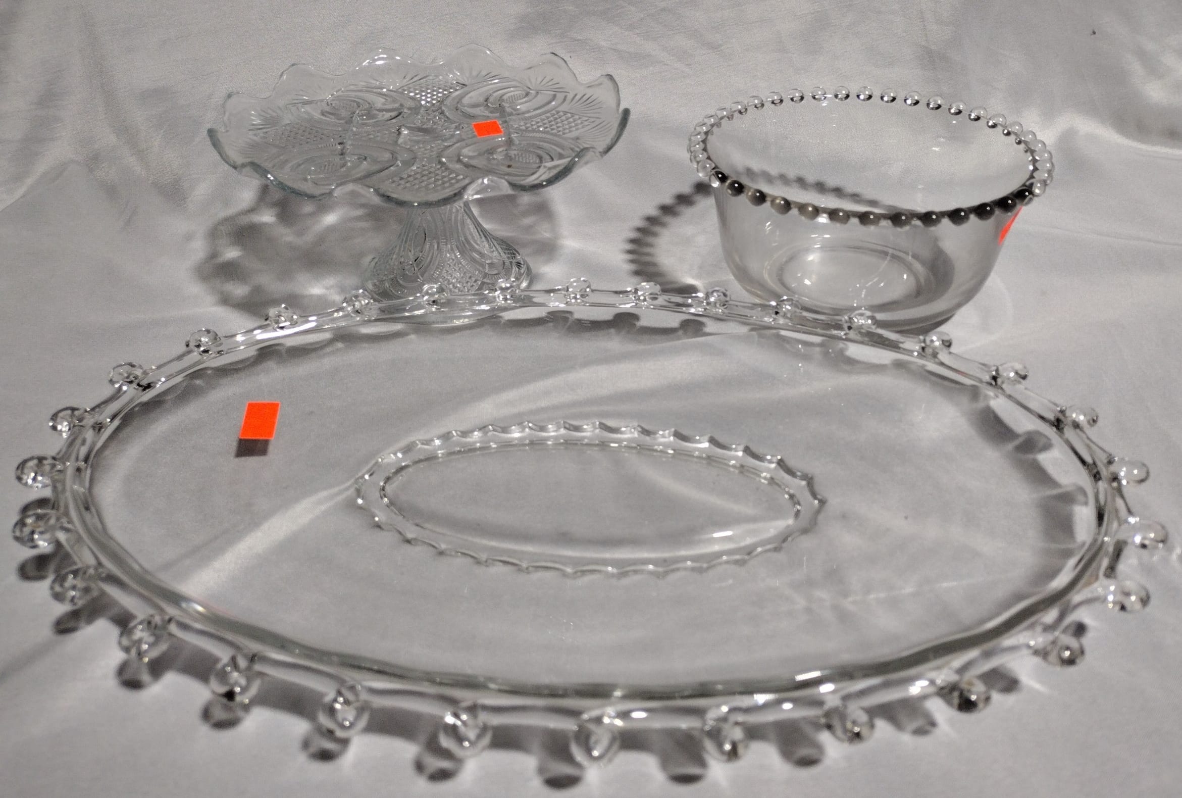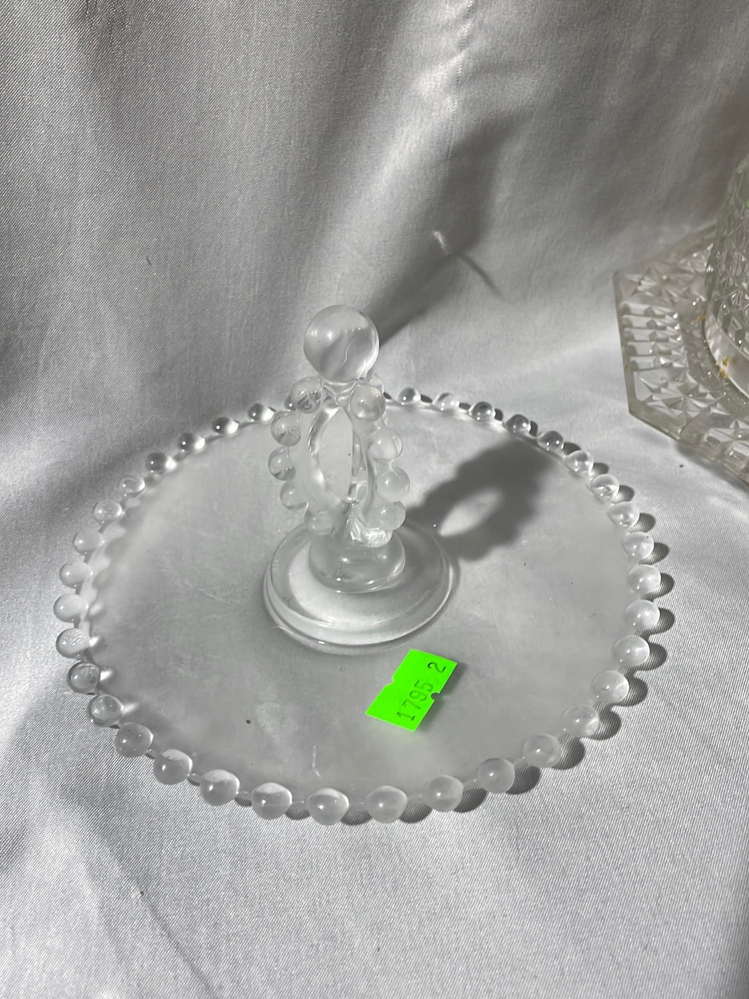 1202 Glass bubble edge bowl 3"x6", glass pedestal plate 4"x7", glass serving plate 14"