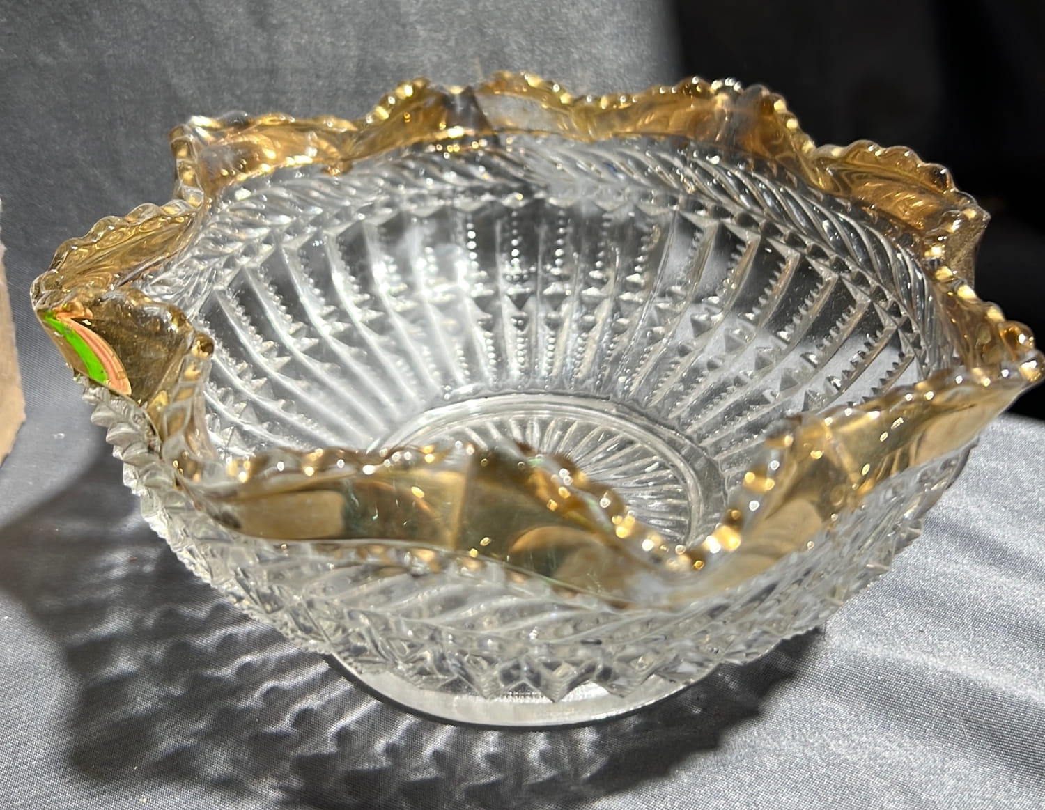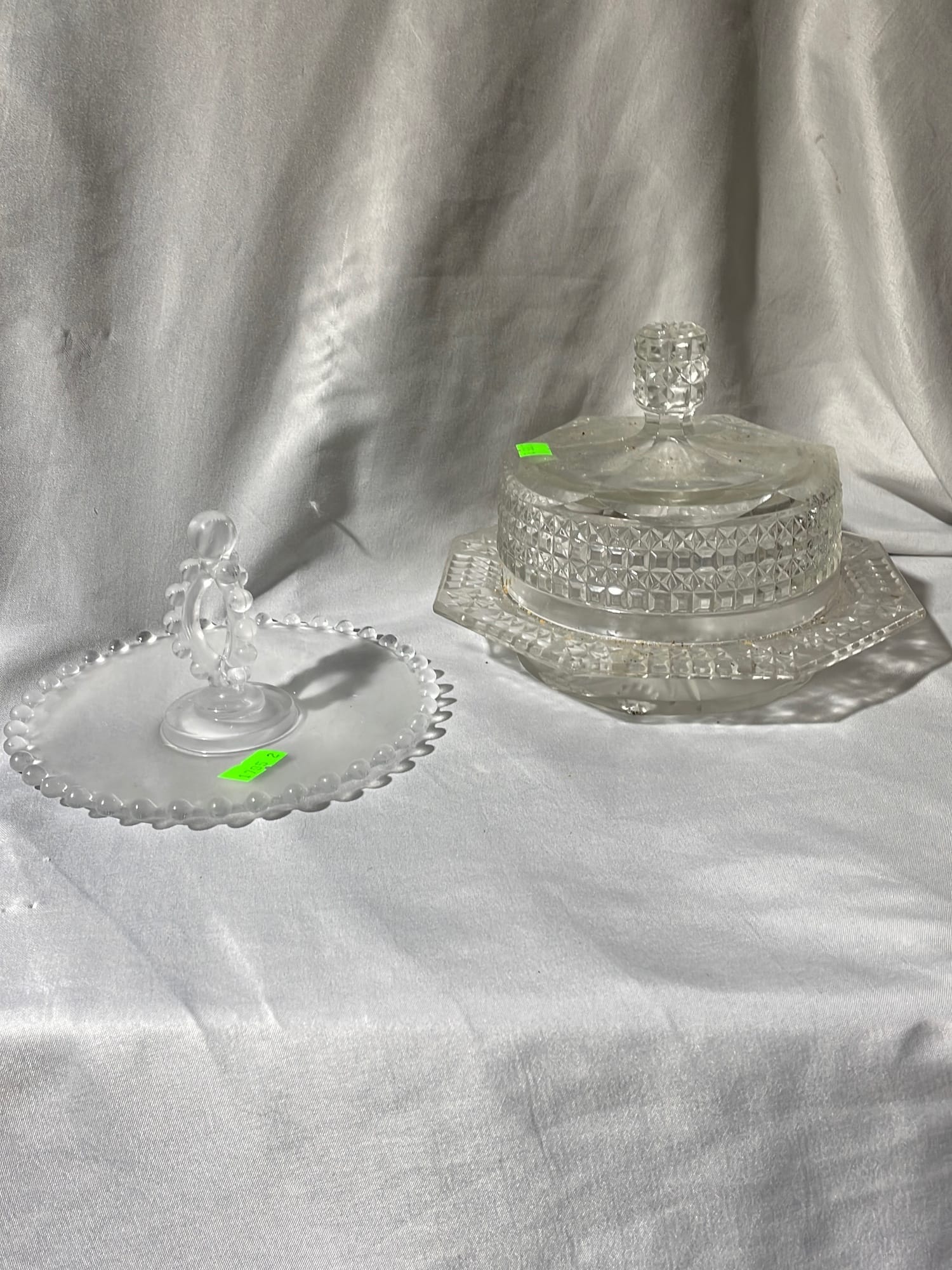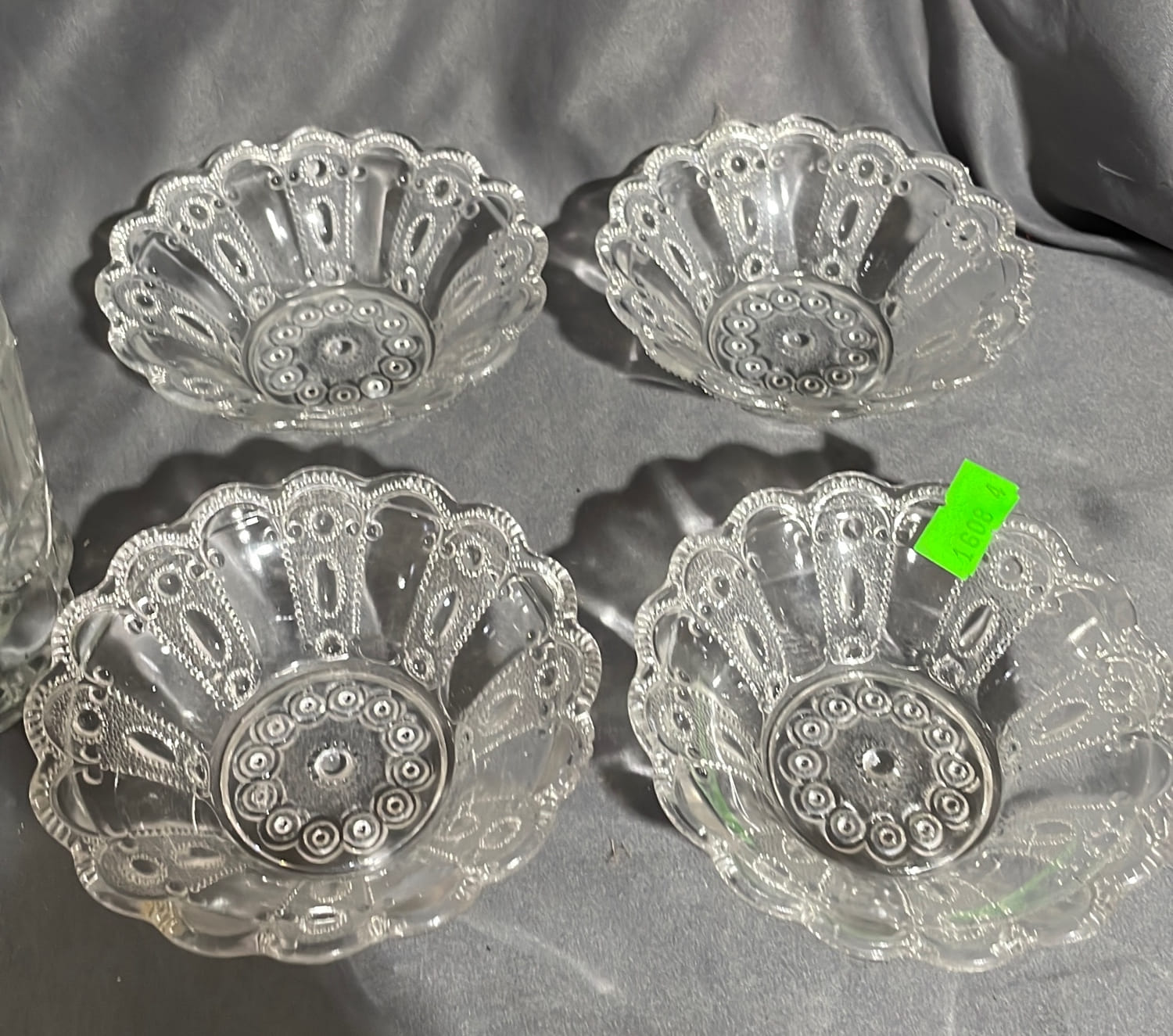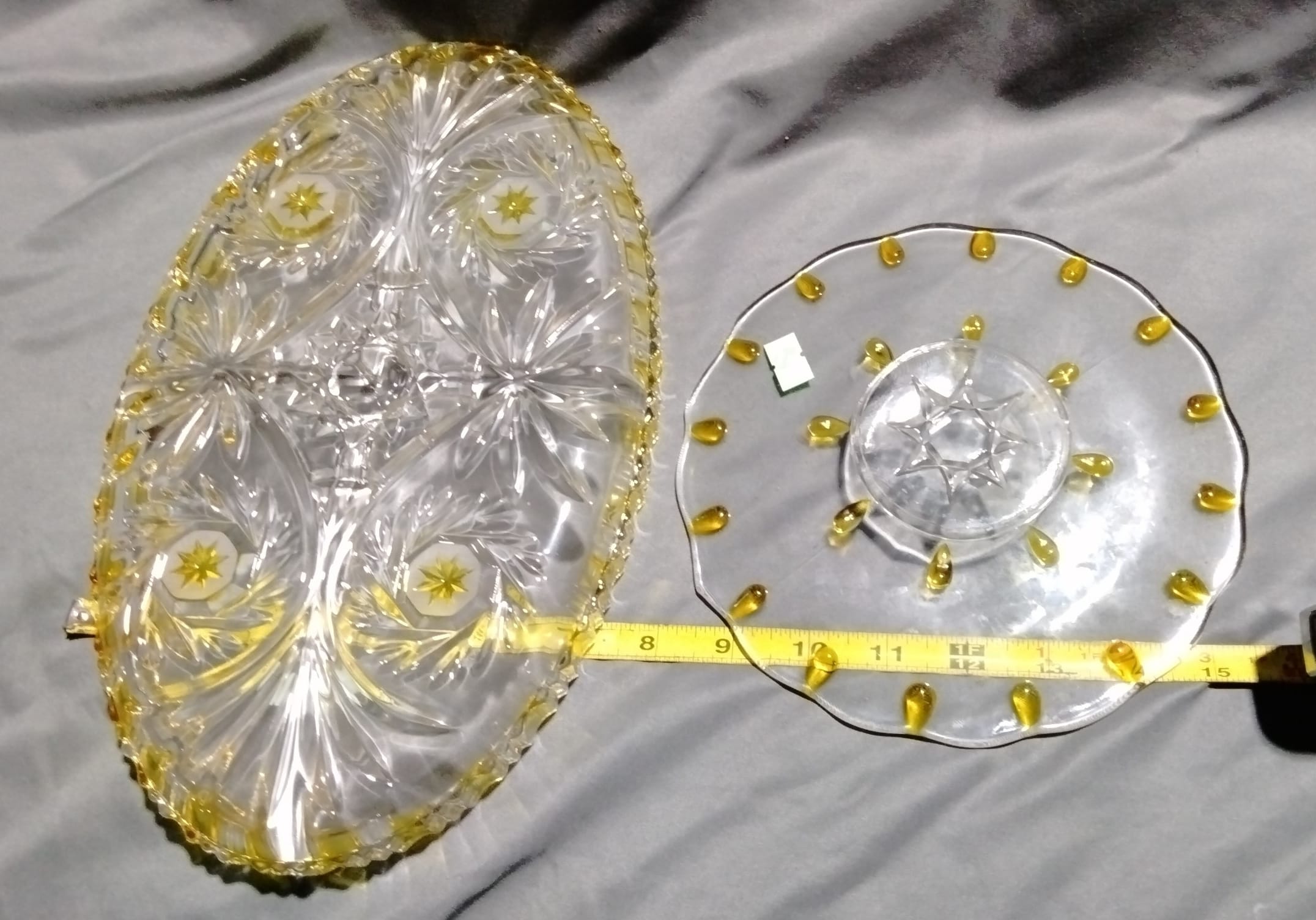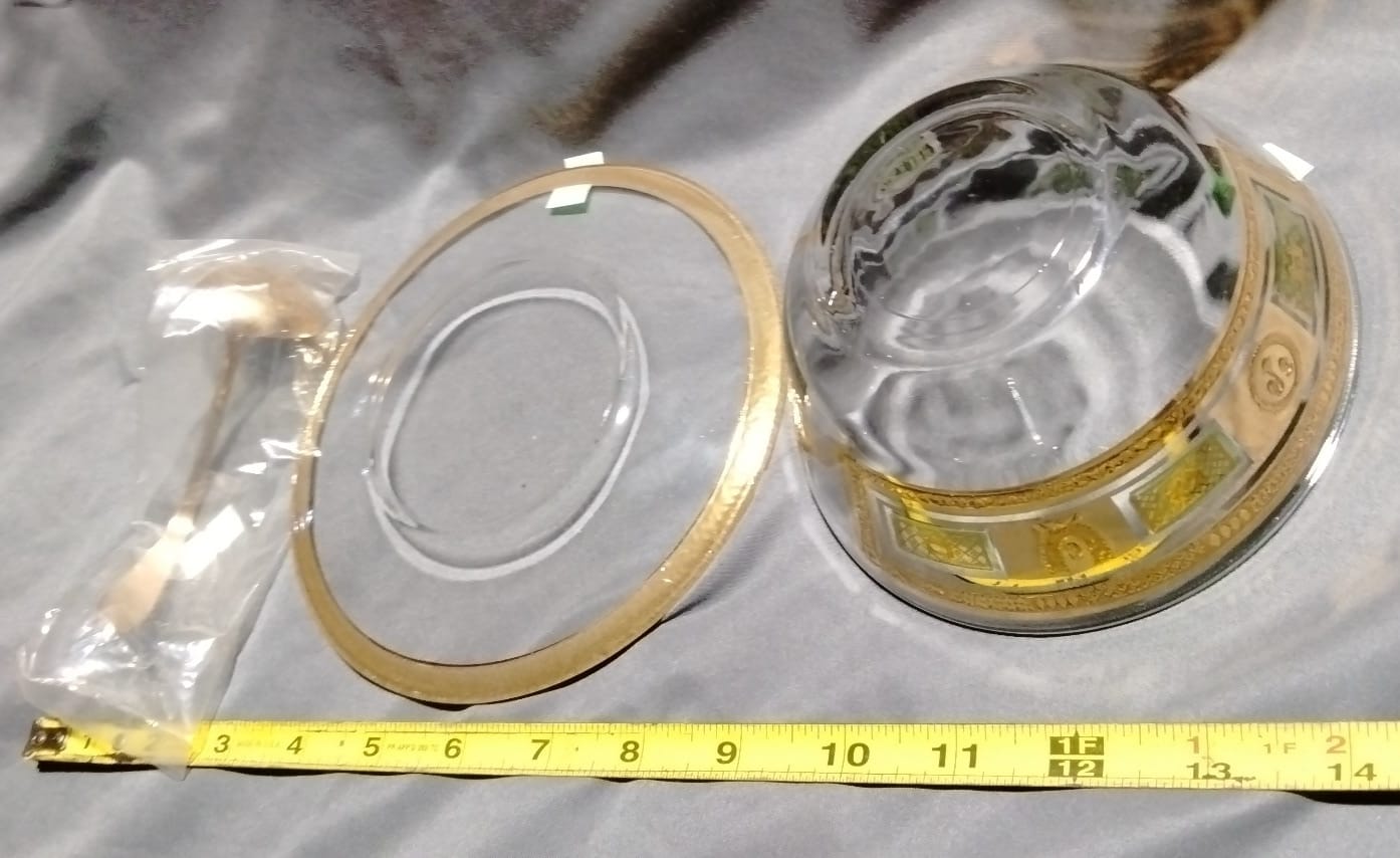 1202 Glass bubble edge bowl 3"x6", glass pedestal plate 4"x7", glass serving plate 14"