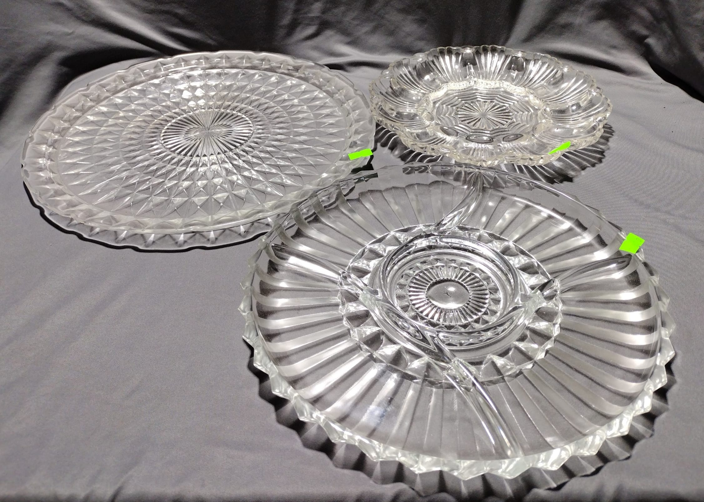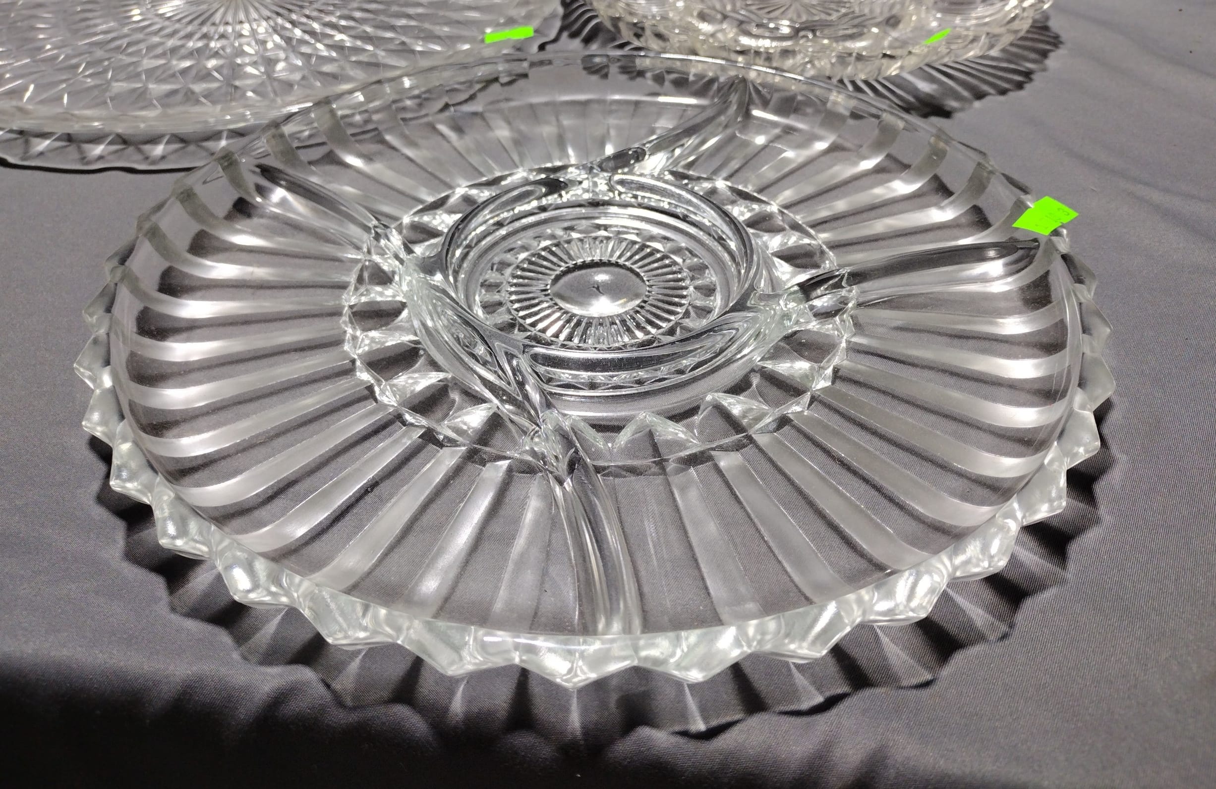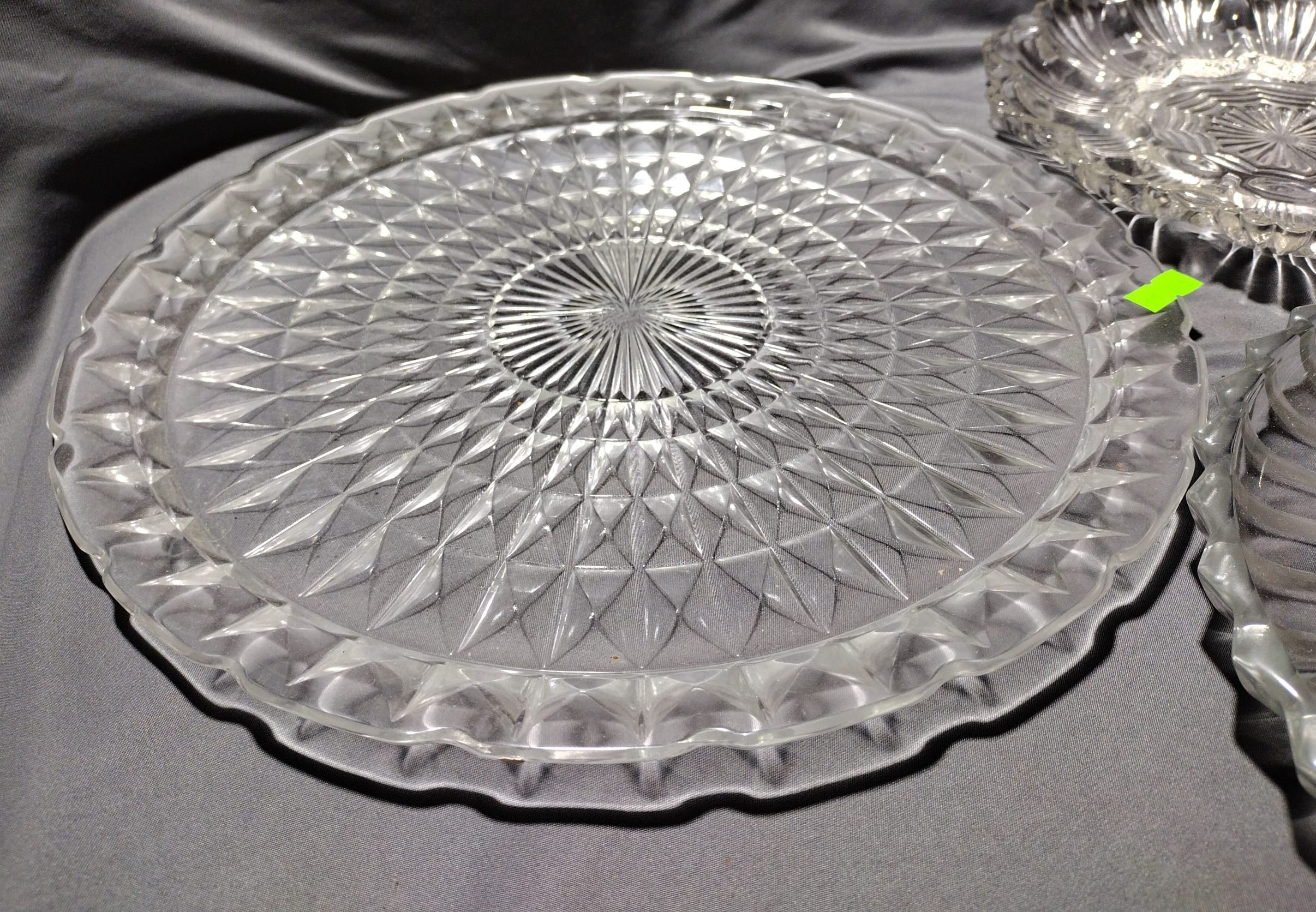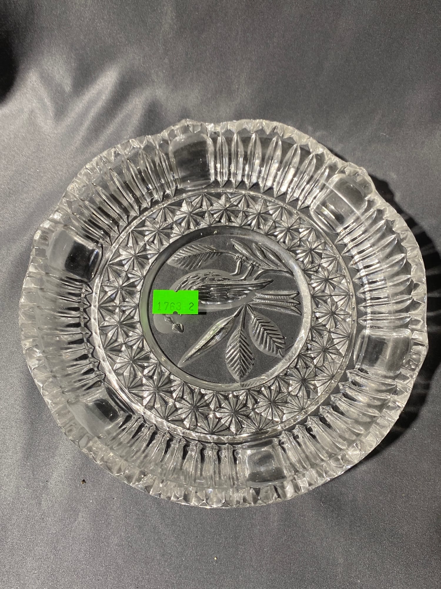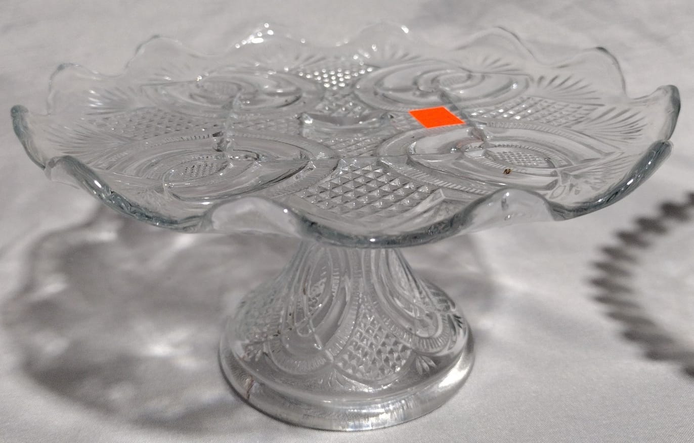1202 Glass bubble edge bowl 3"x6", glass pedestal plate 4"x7", glass serving plate 14"