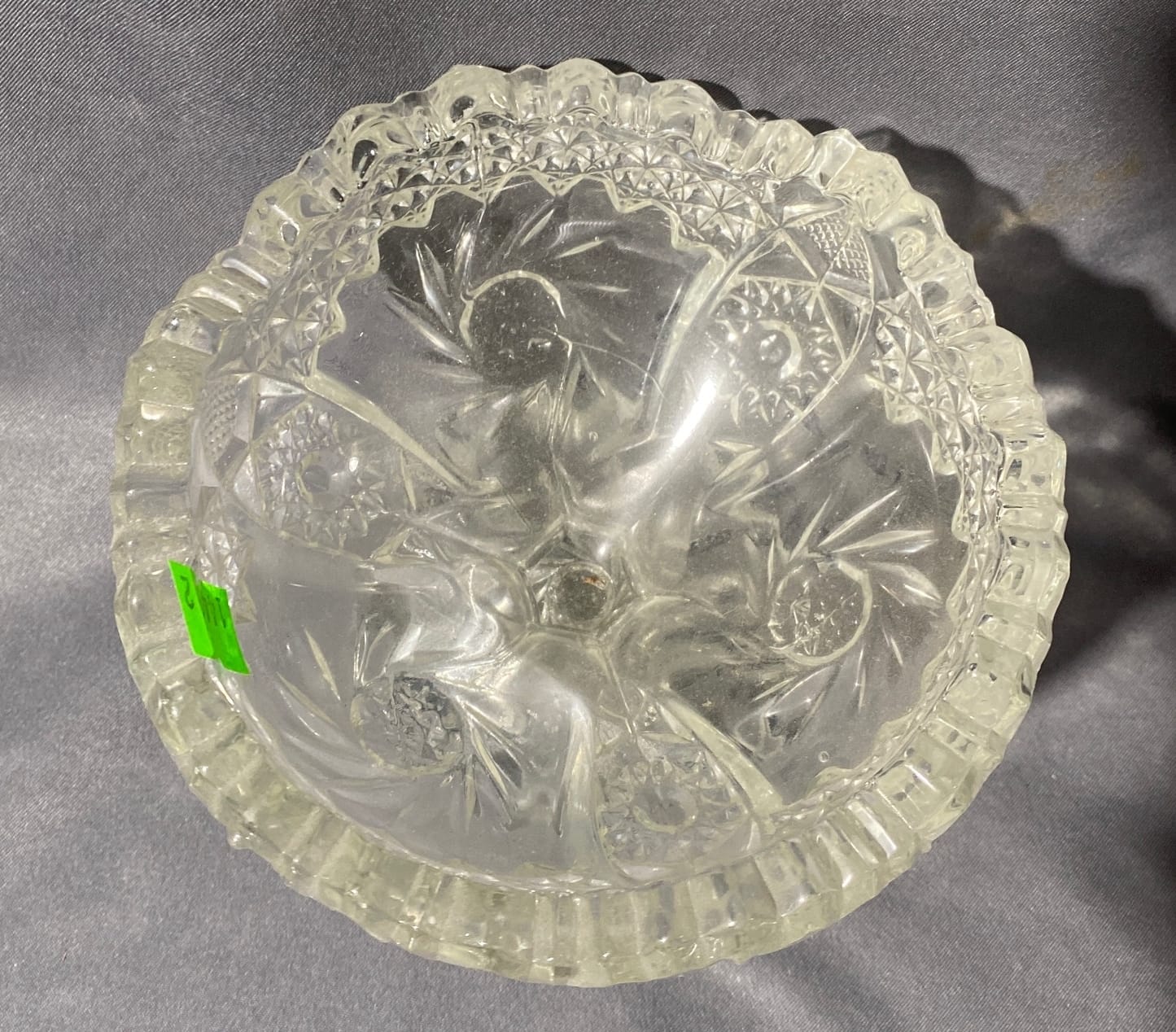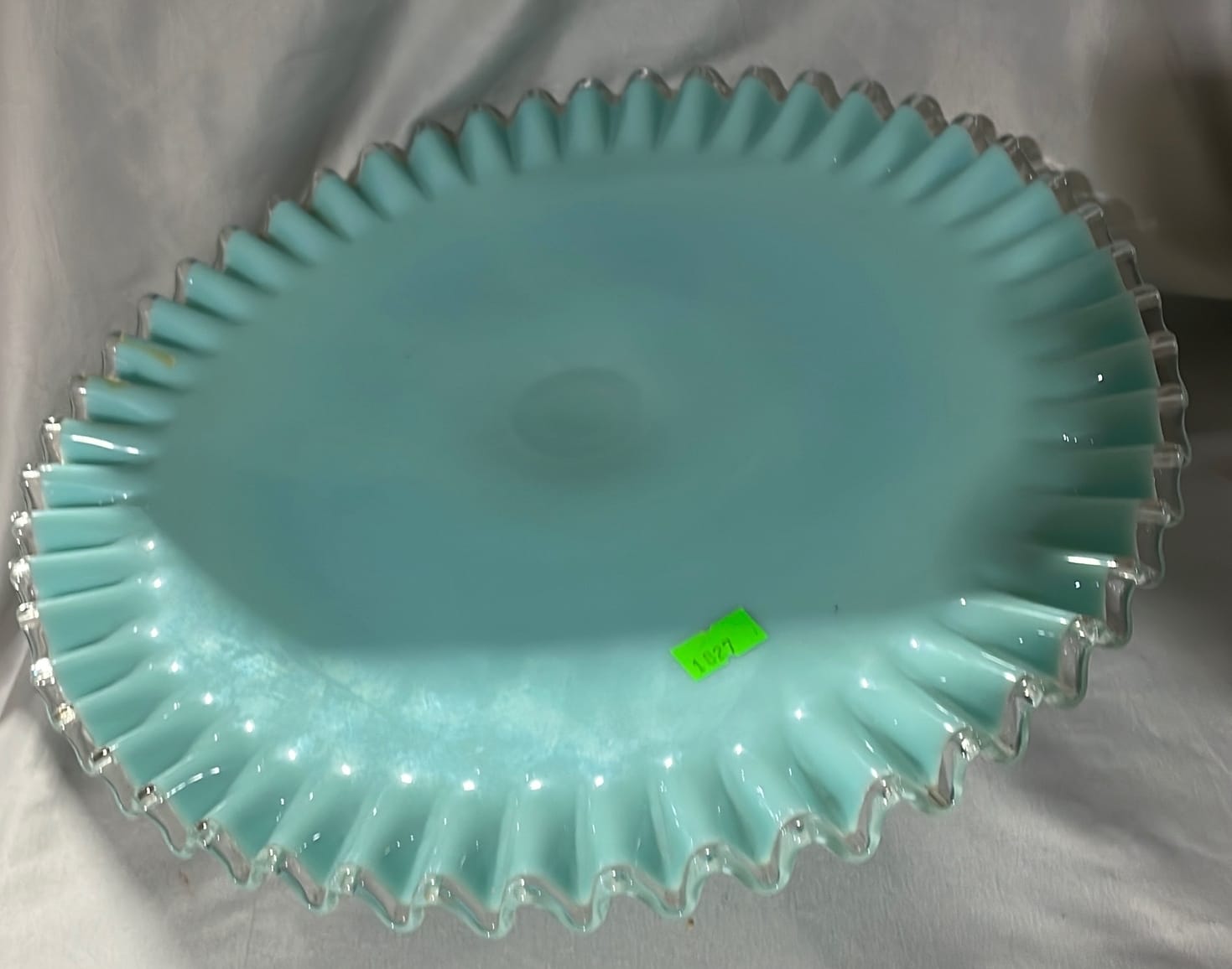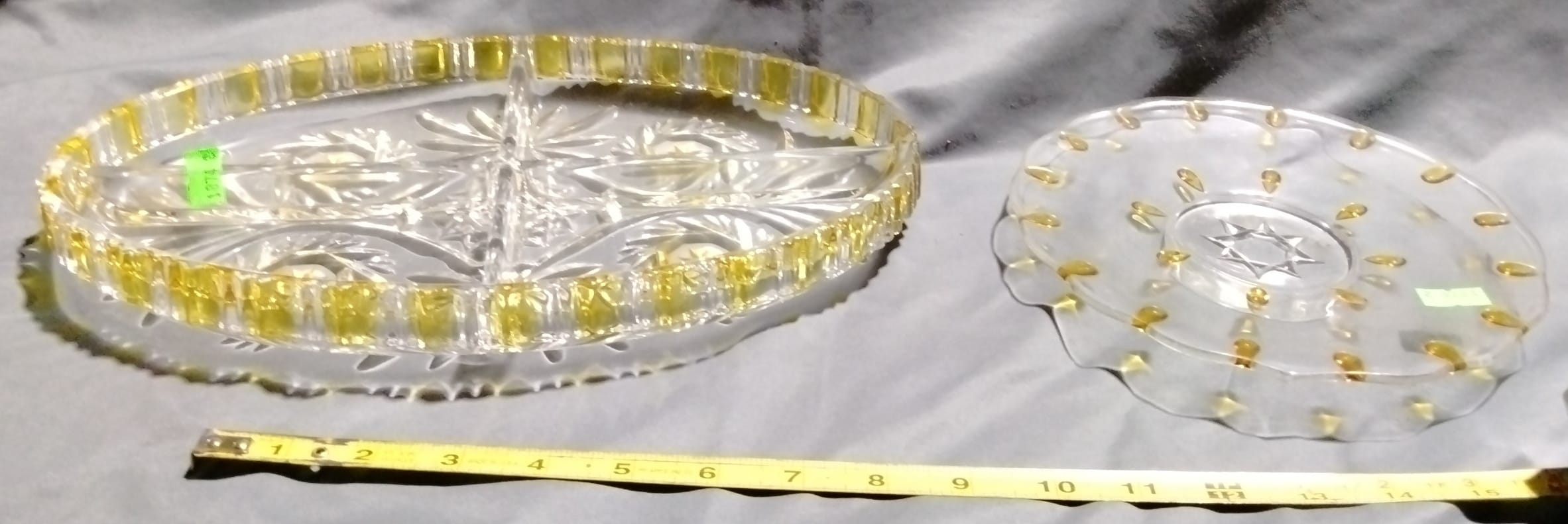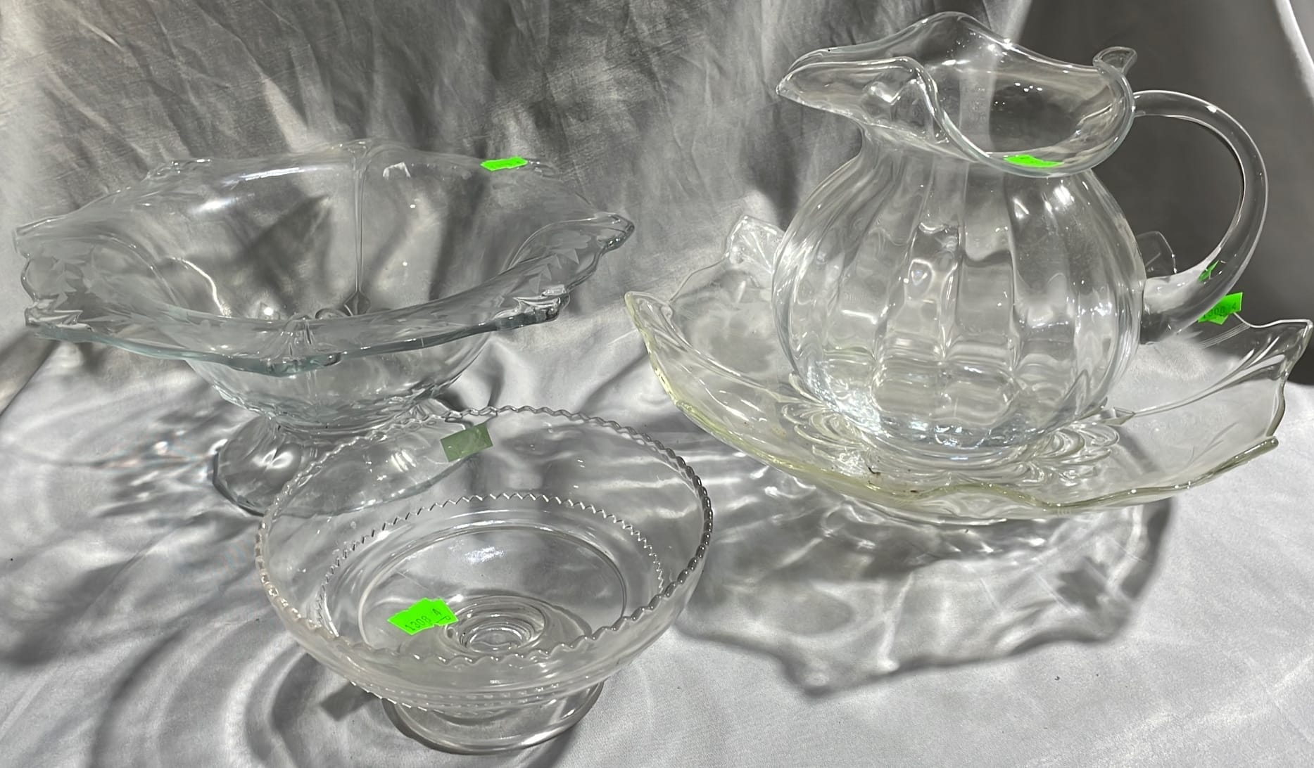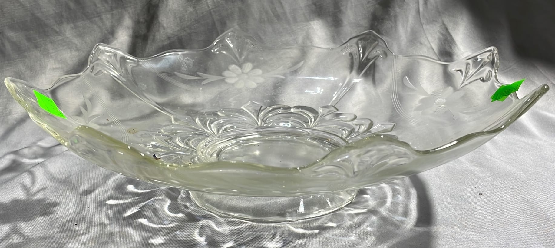1202 Glass bubble edge bowl 3"x6", glass pedestal plate 4"x7", glass serving plate 14"