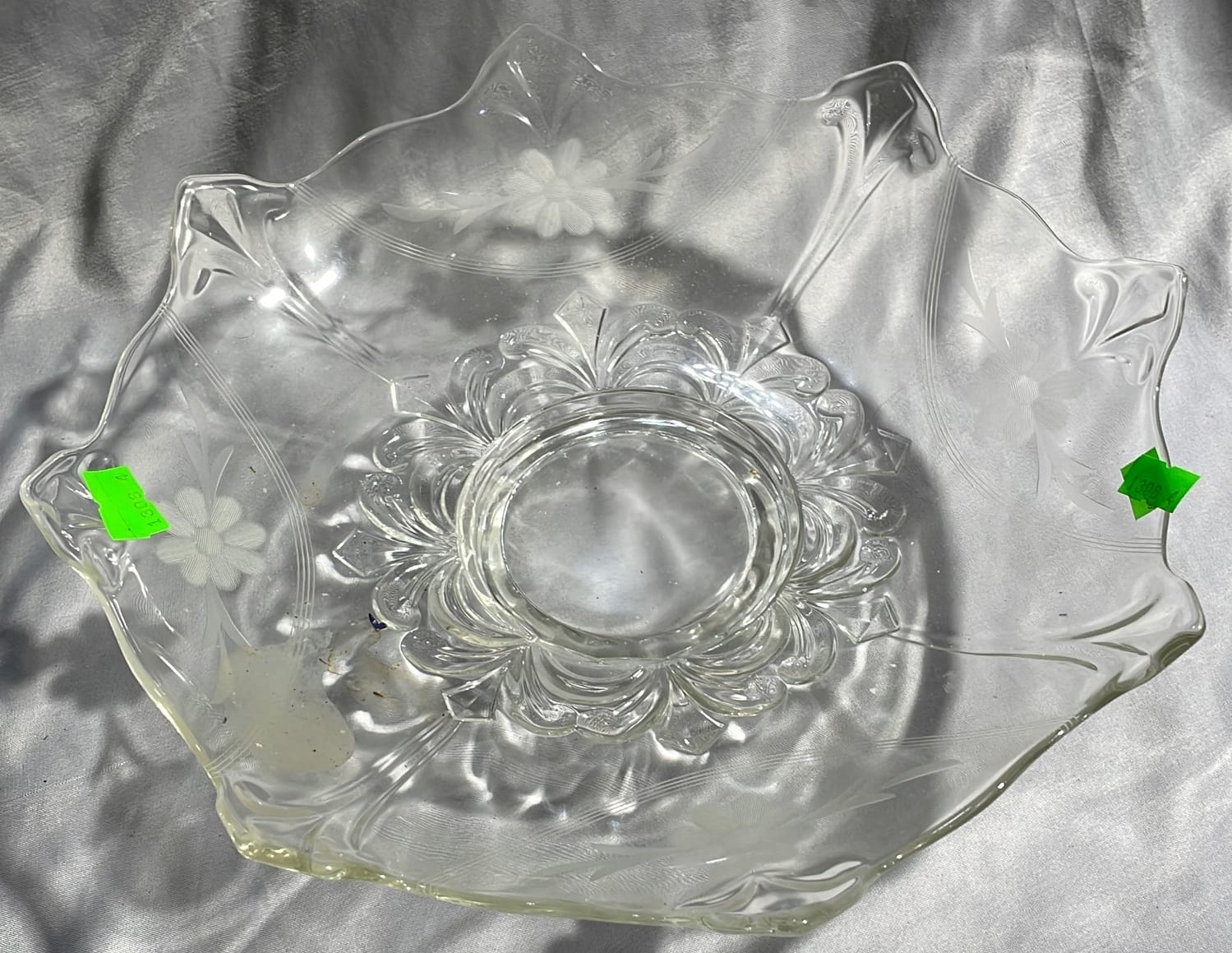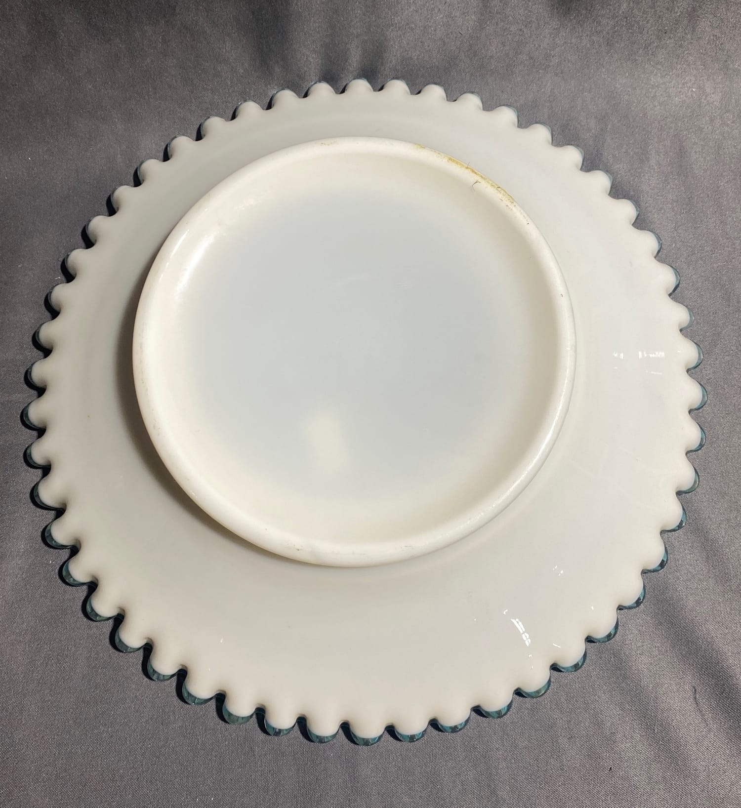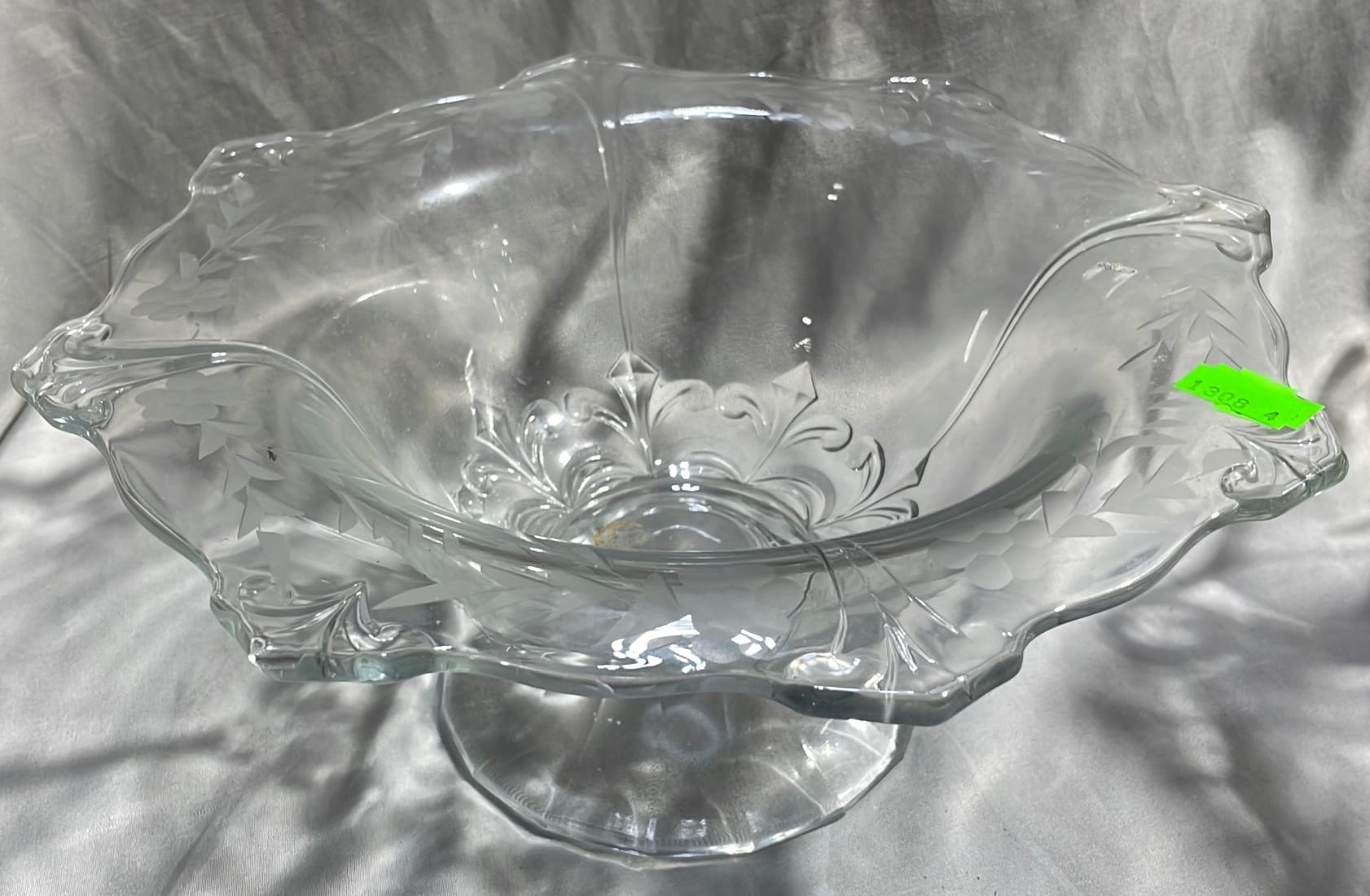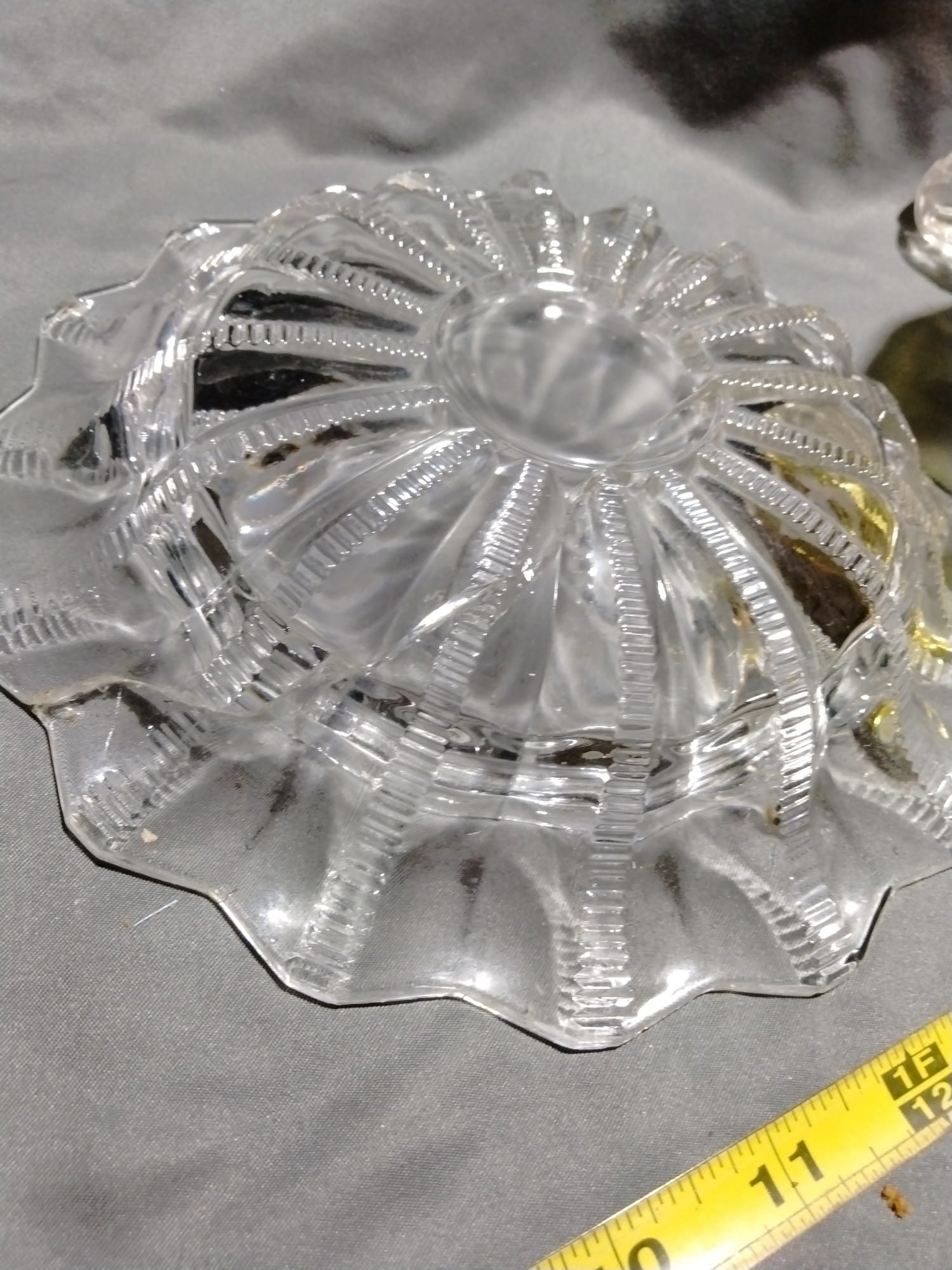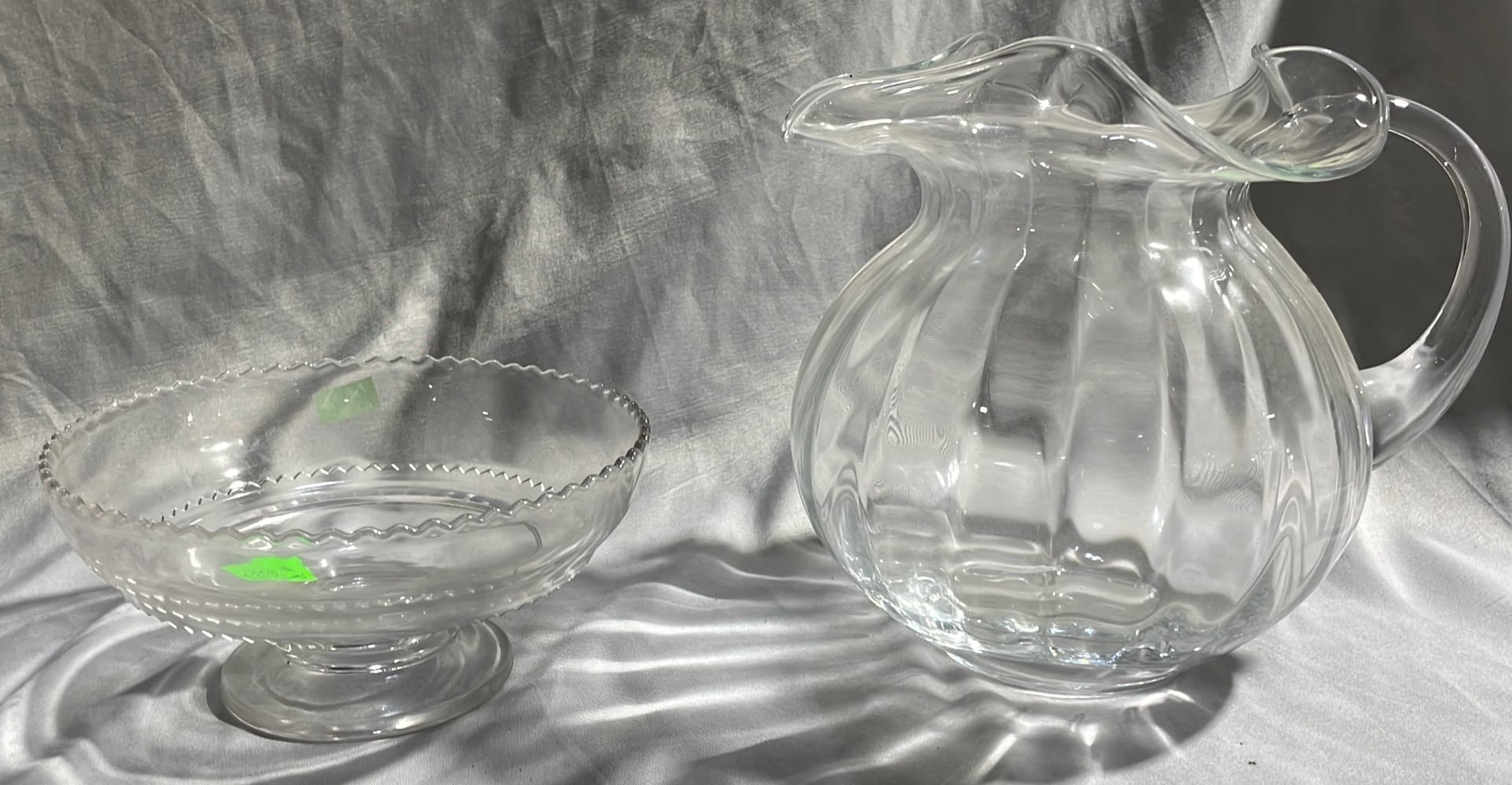 1202 Glass bubble edge bowl 3"x6", glass pedestal plate 4"x7", glass serving plate 14"