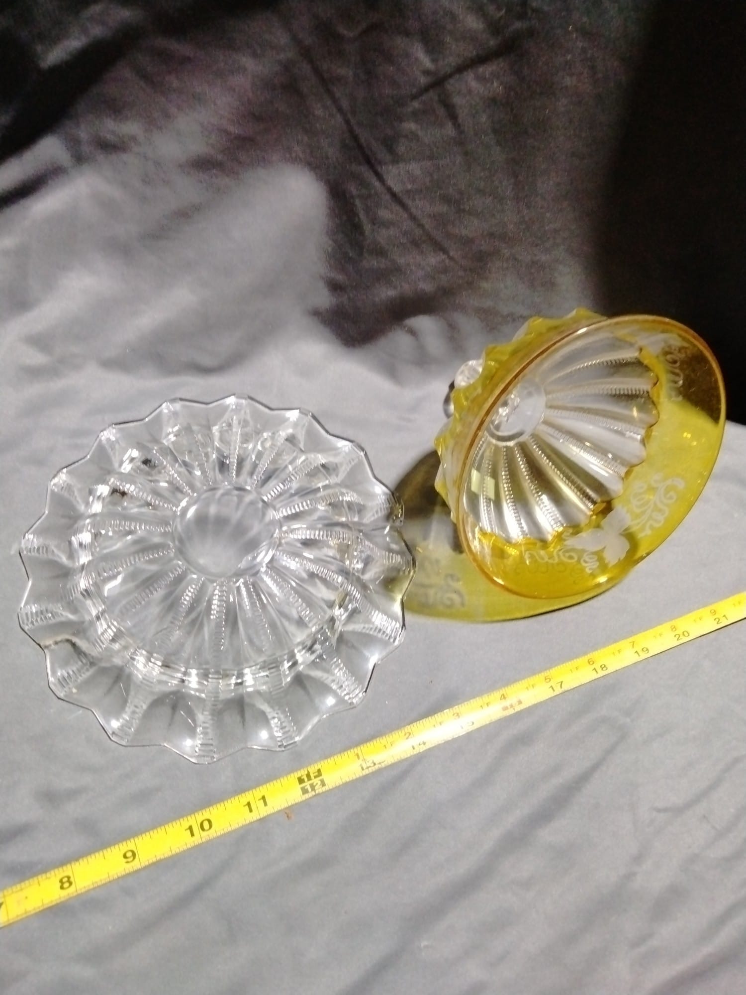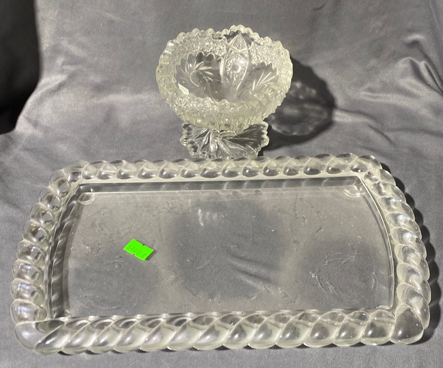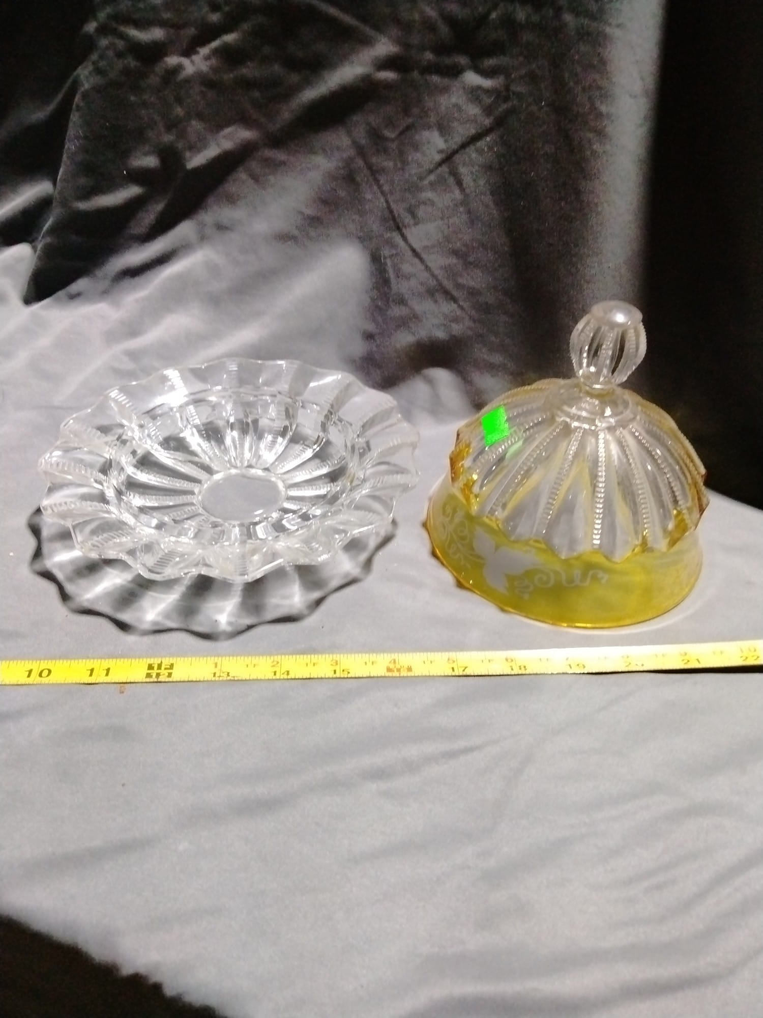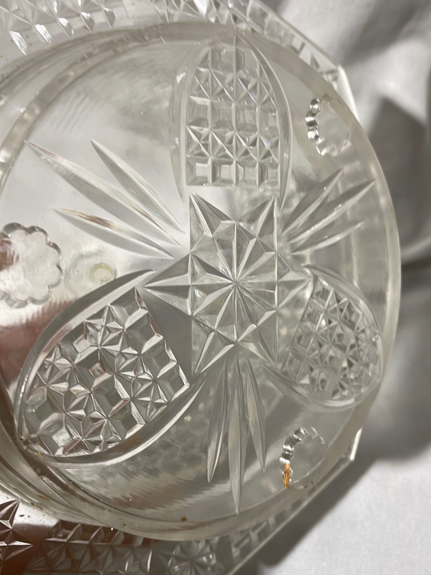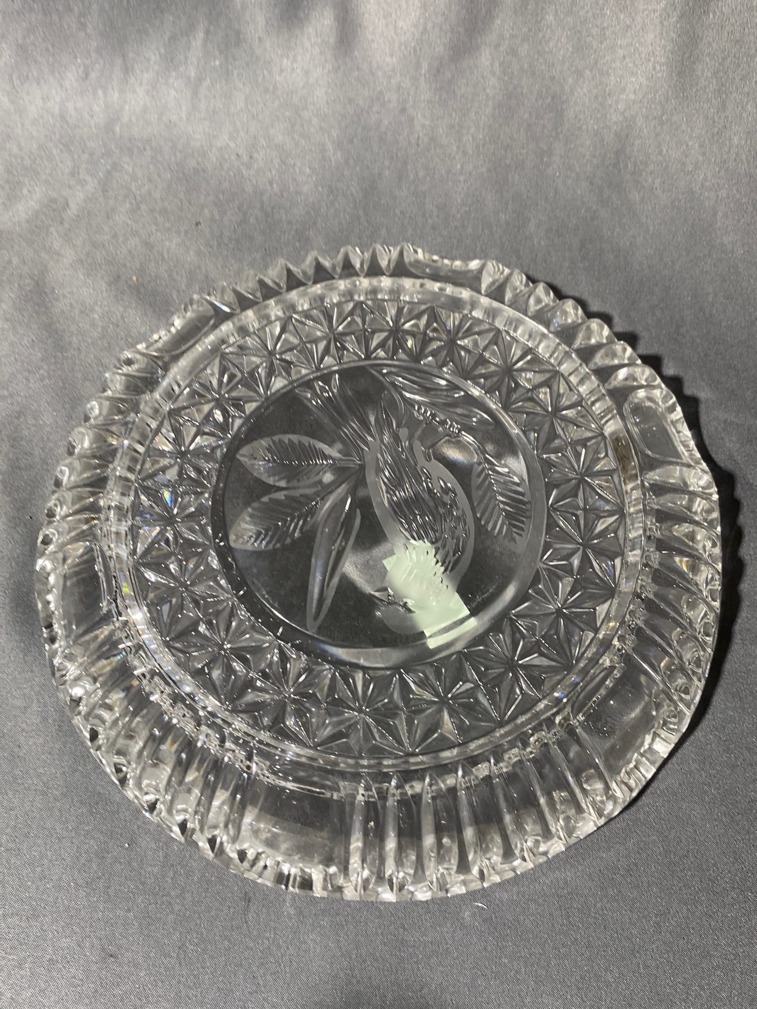 1202 Glass bubble edge bowl 3"x6", glass pedestal plate 4"x7", glass serving plate 14"