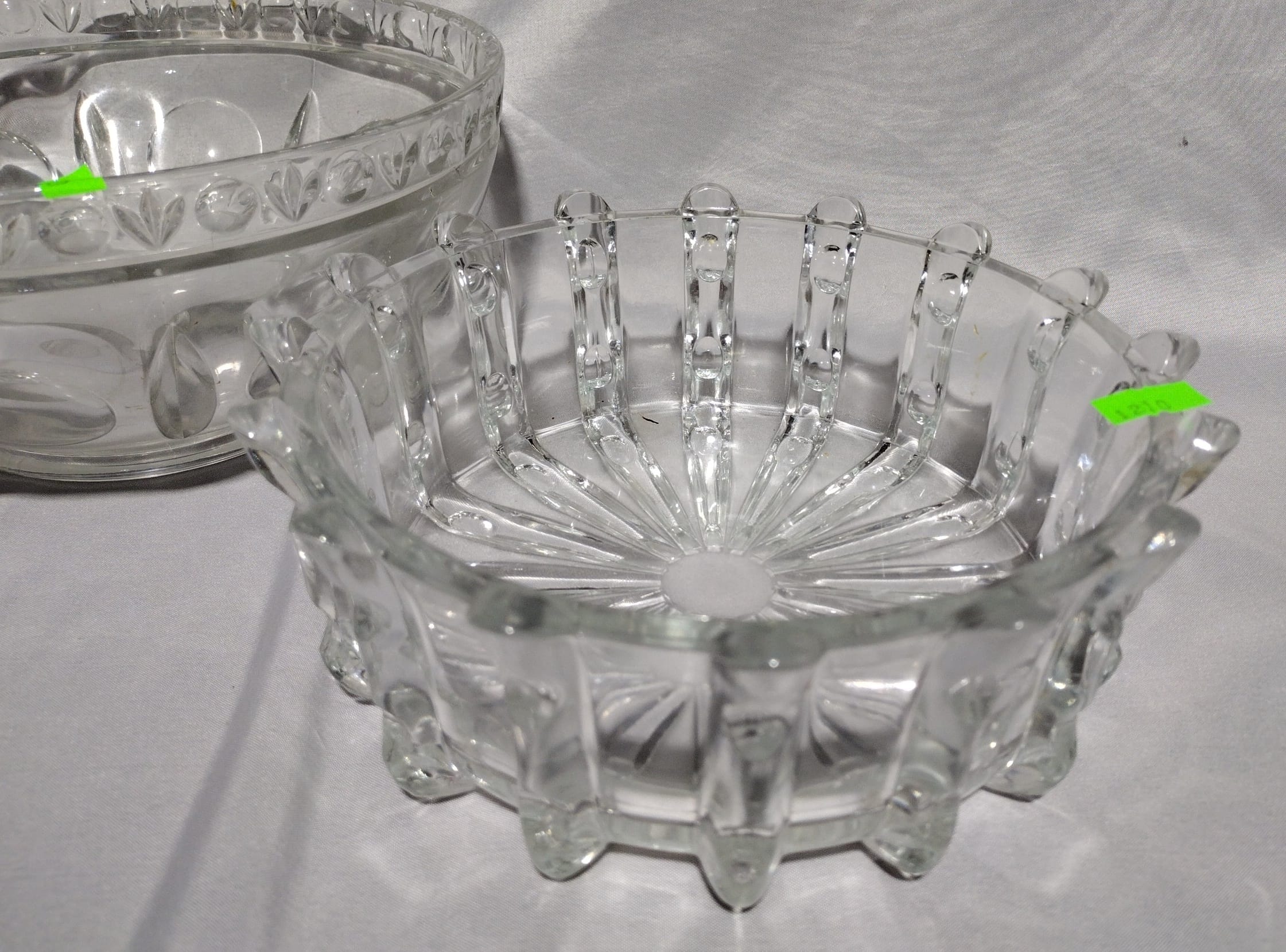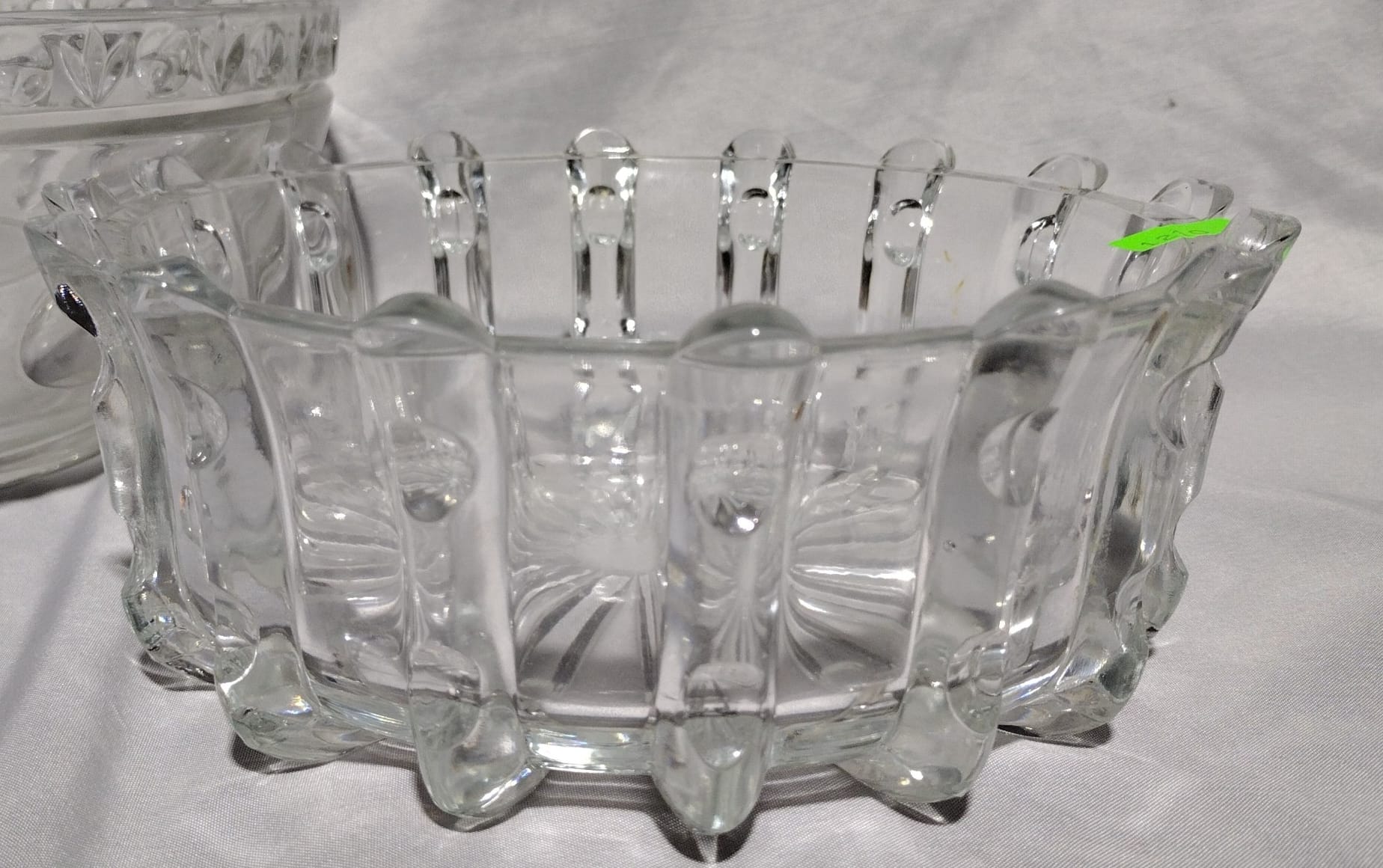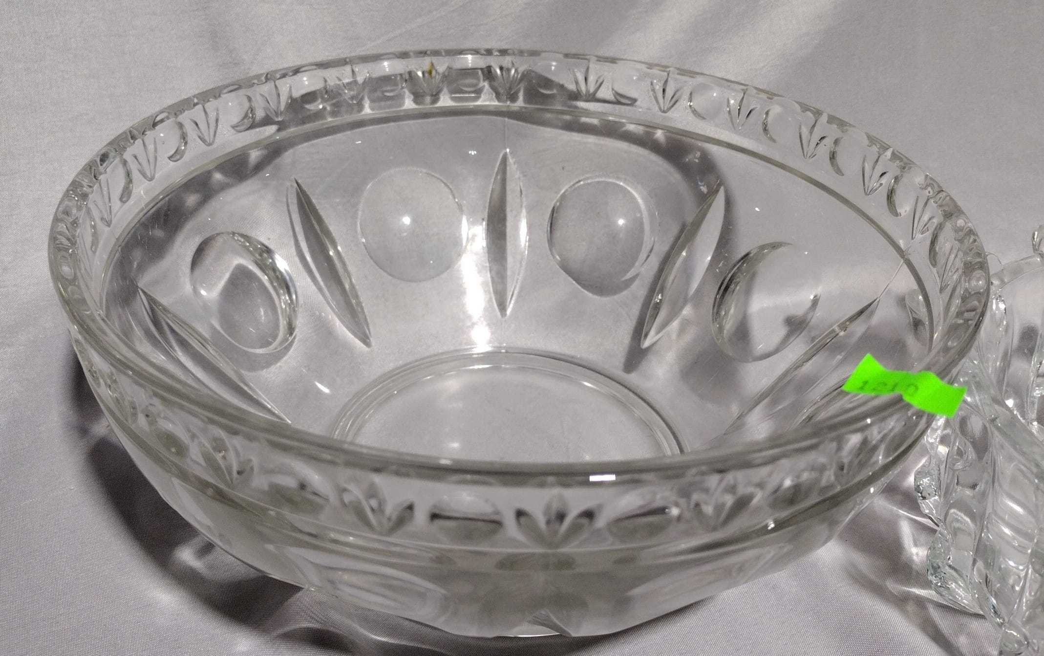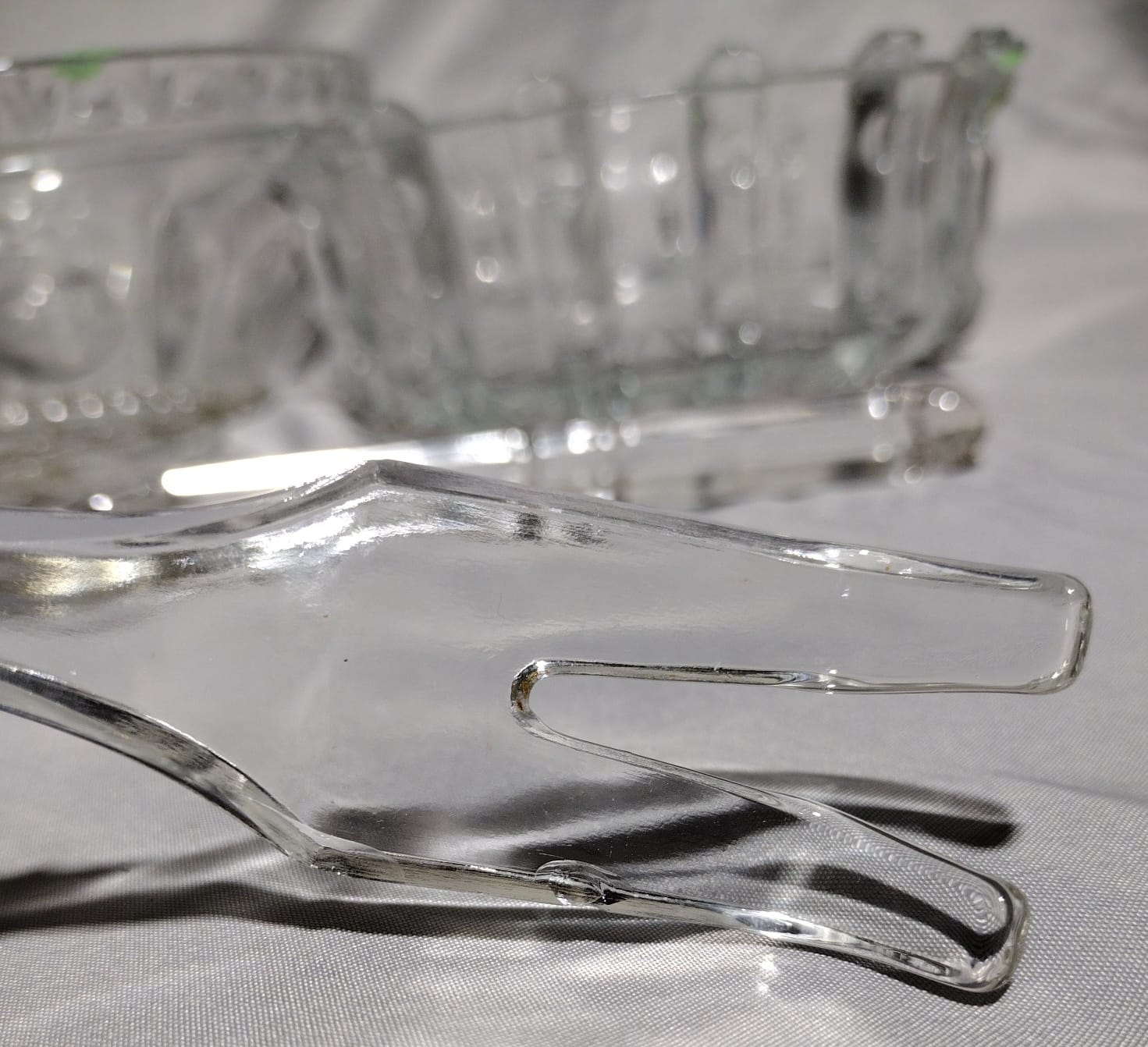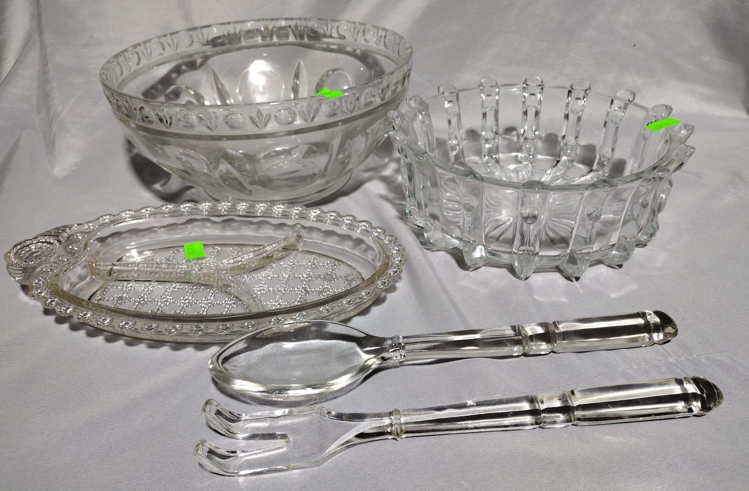 1210 2- Glass bowls 3"x8", 4"x9", relish dish 10", glass utensils-fork is chipped