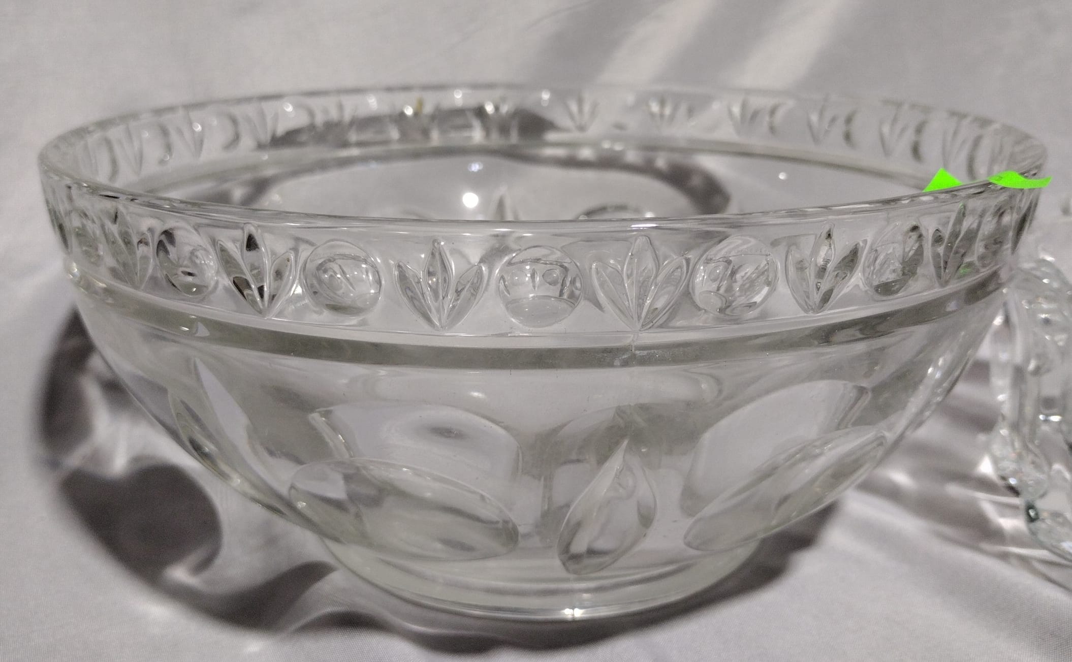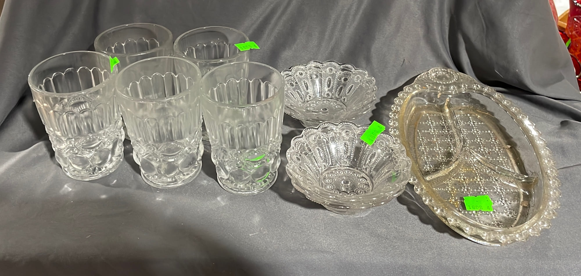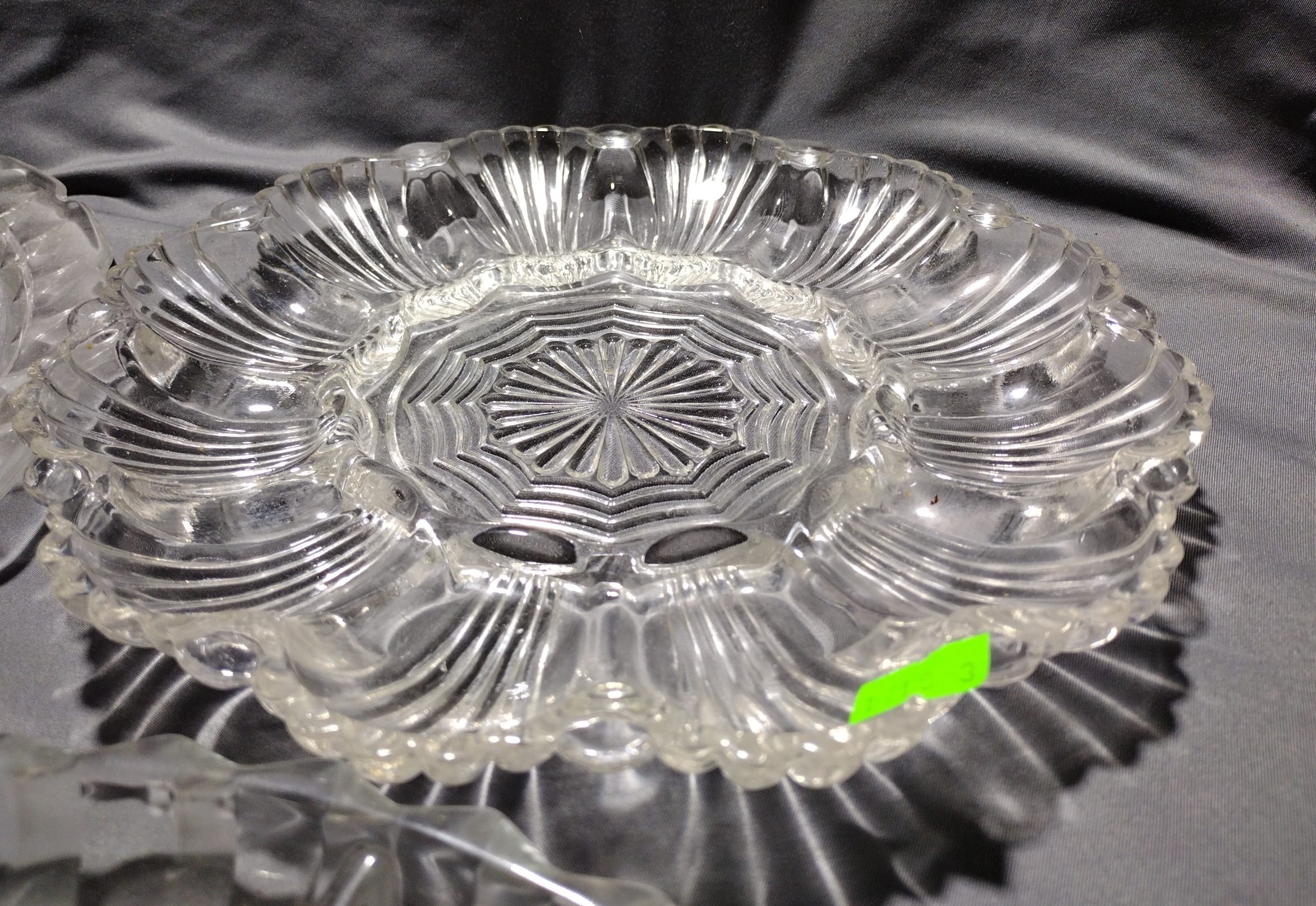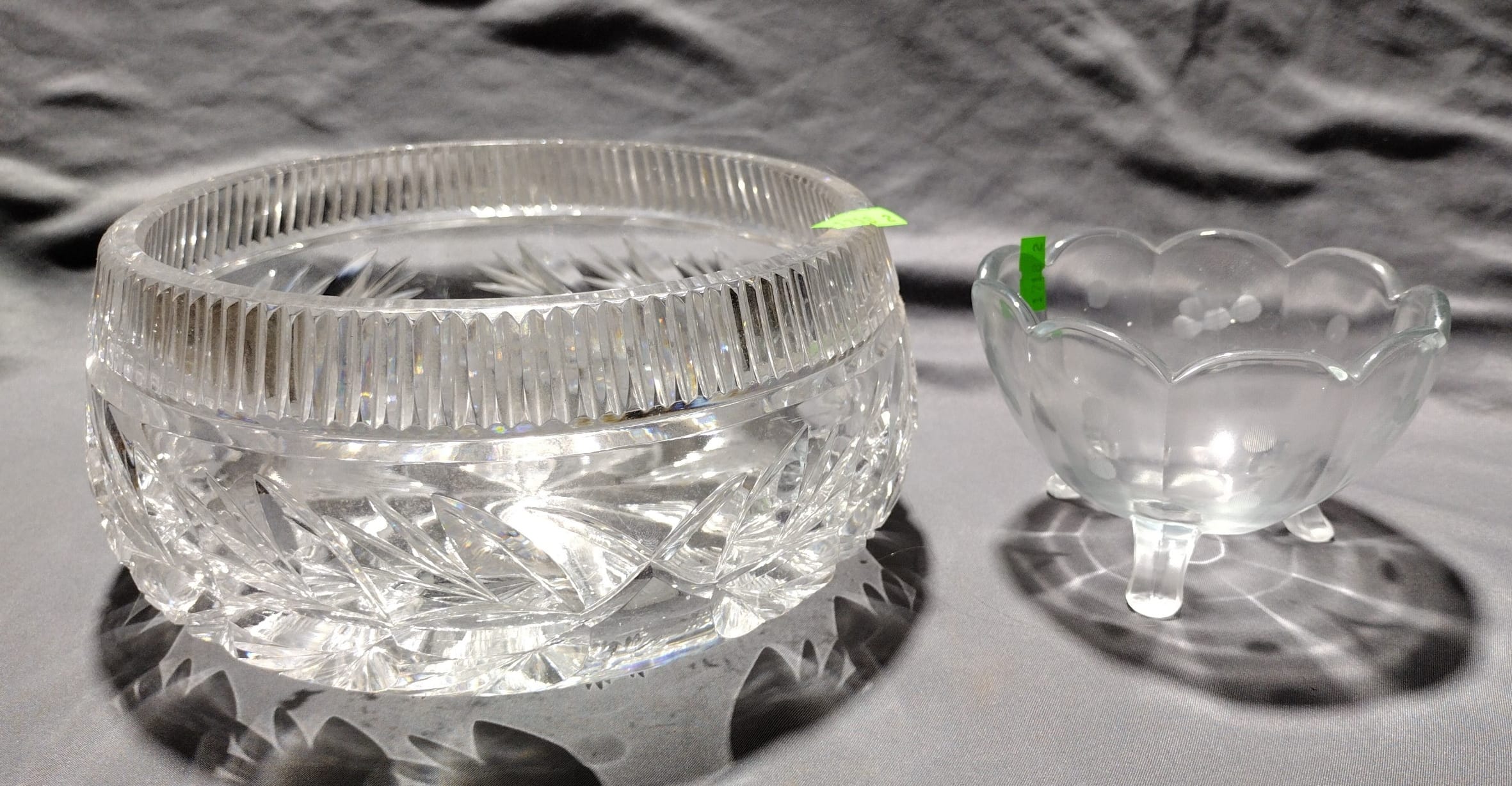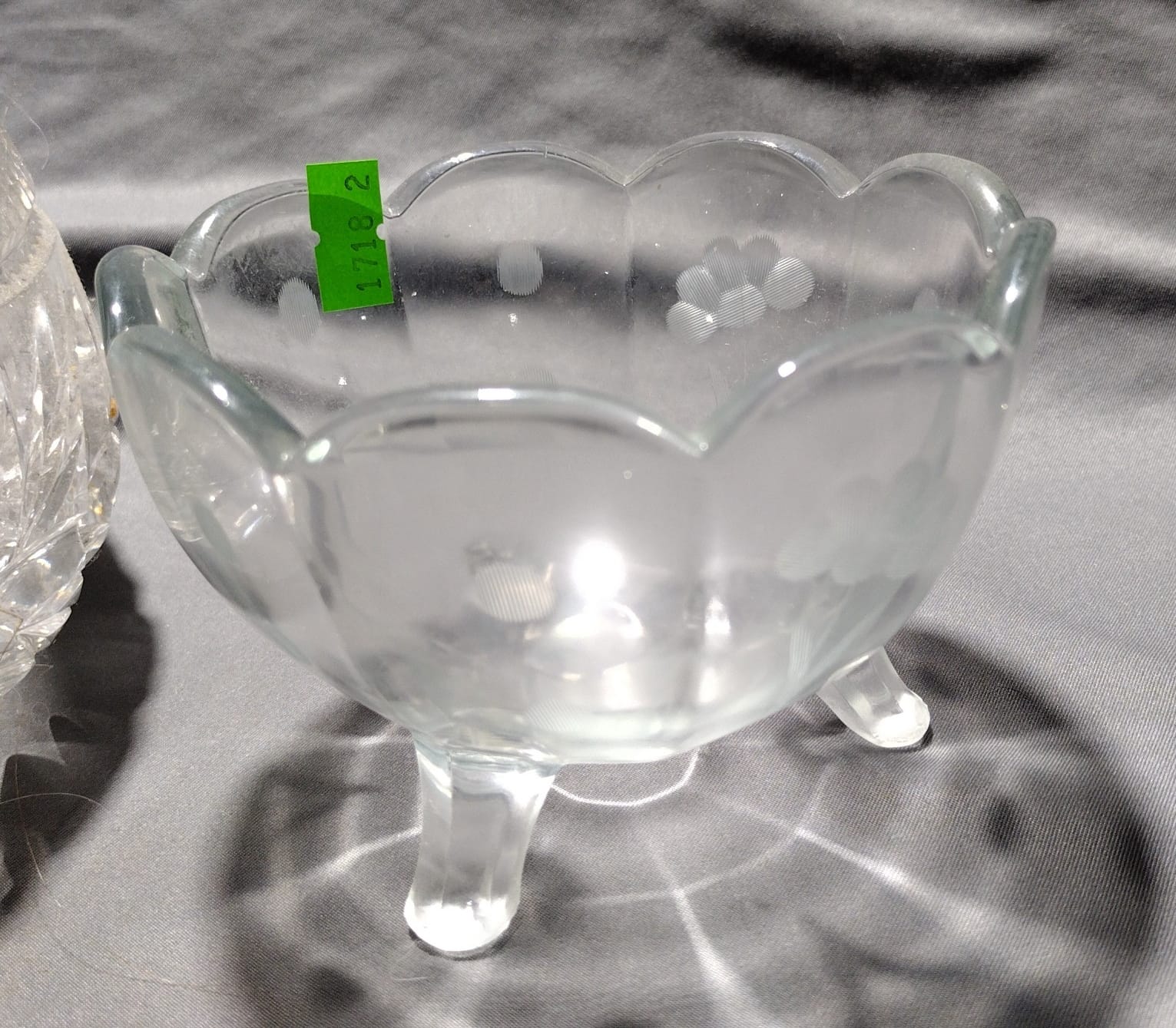 1210 2- Glass bowls 3"x8", 4"x9", relish dish 10", glass utensils-fork is chipped