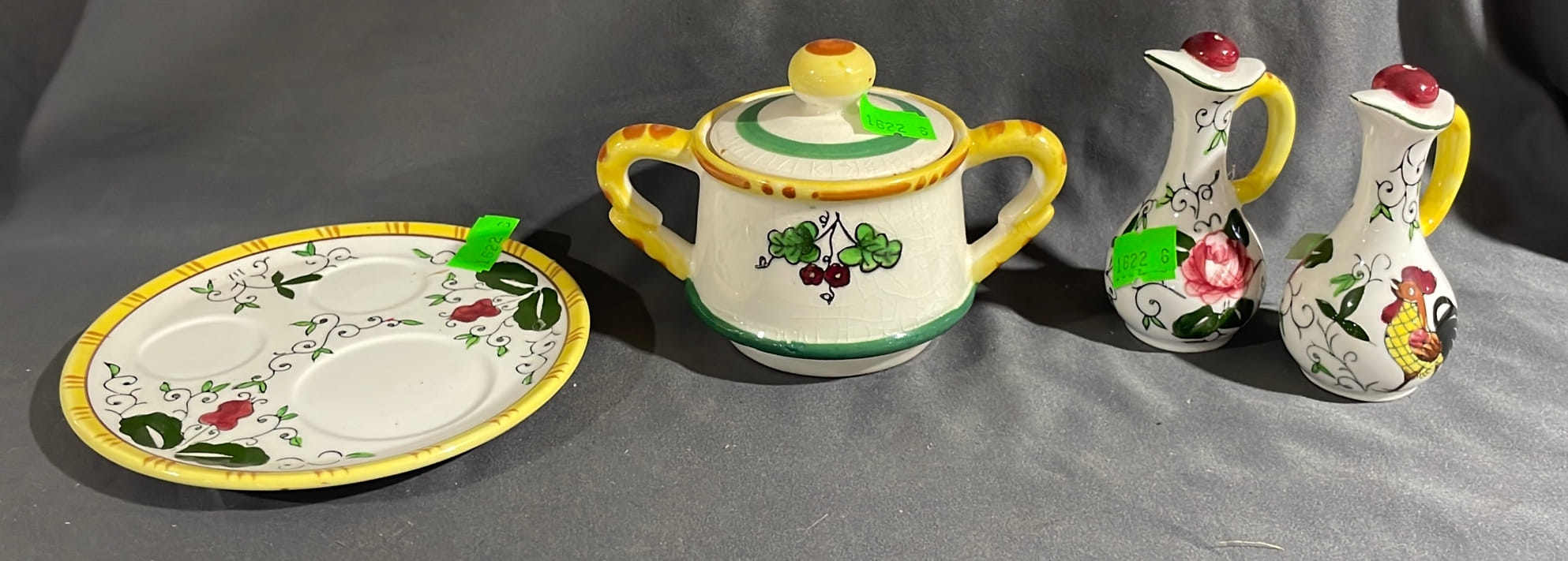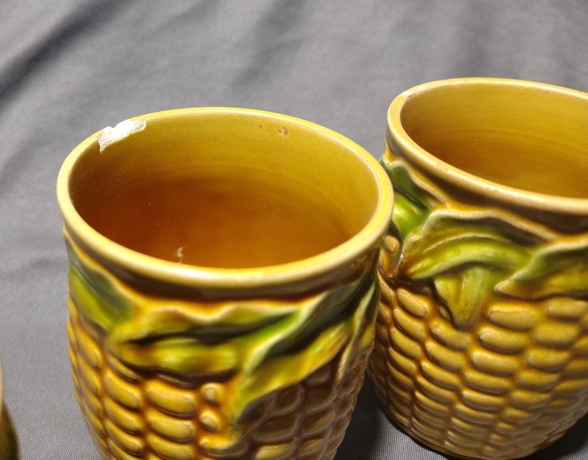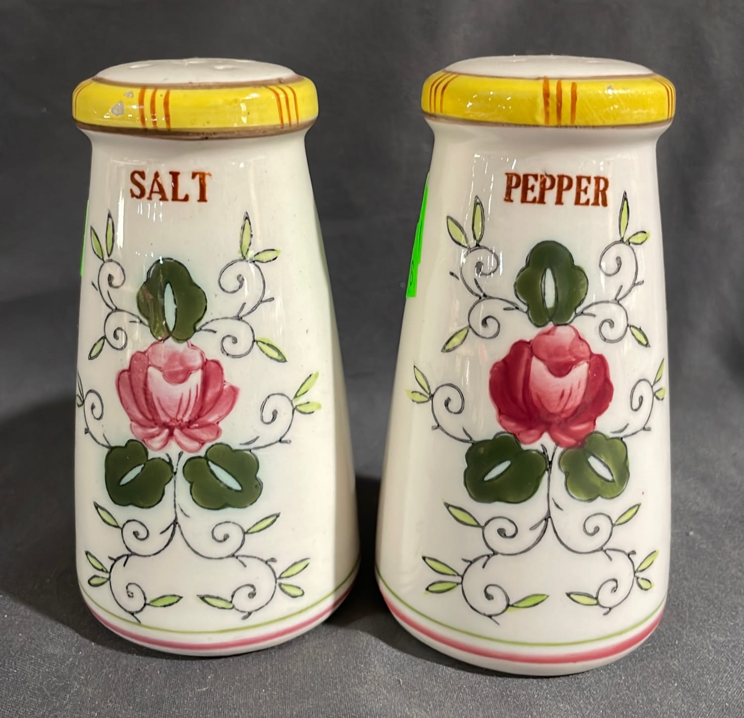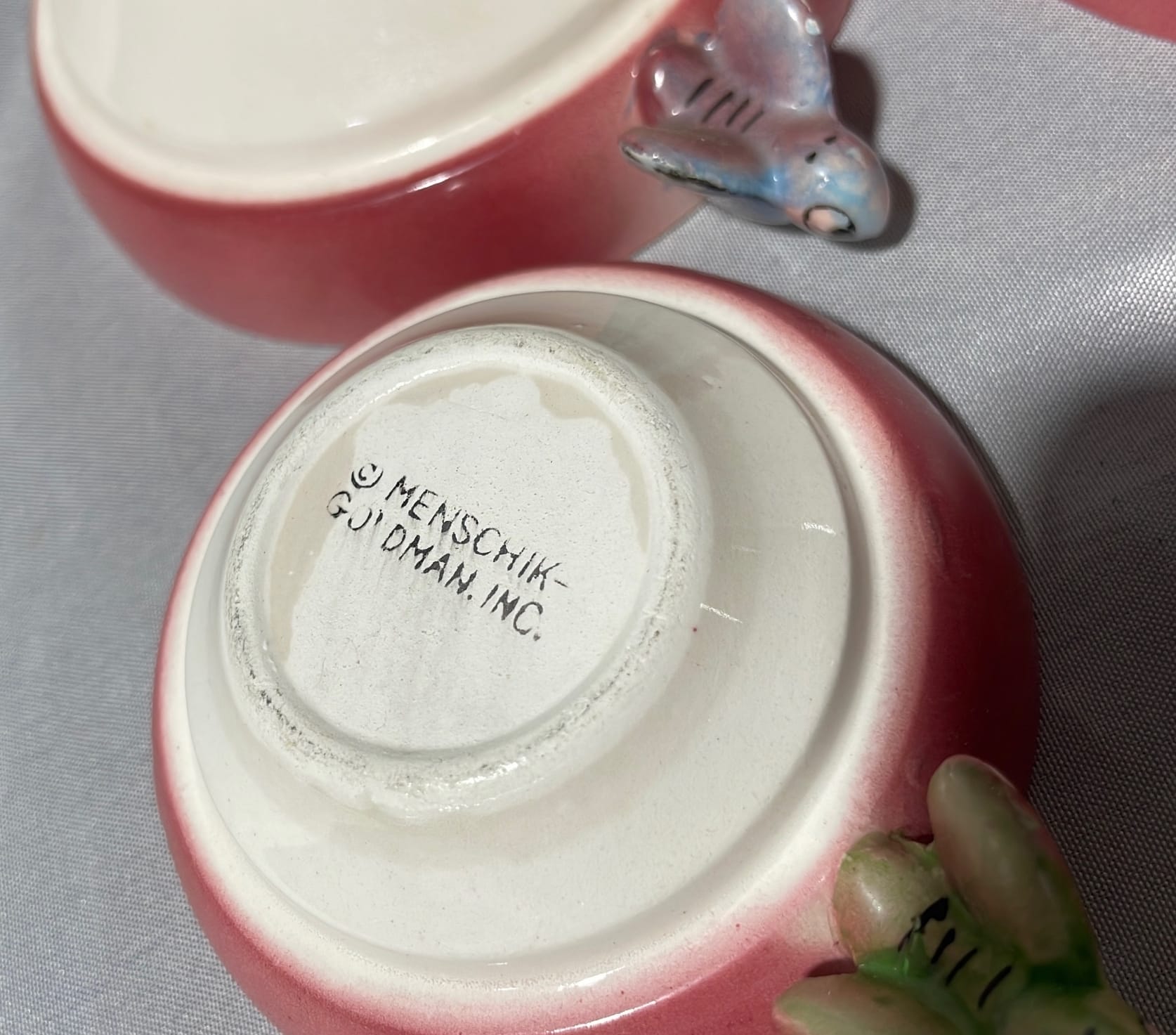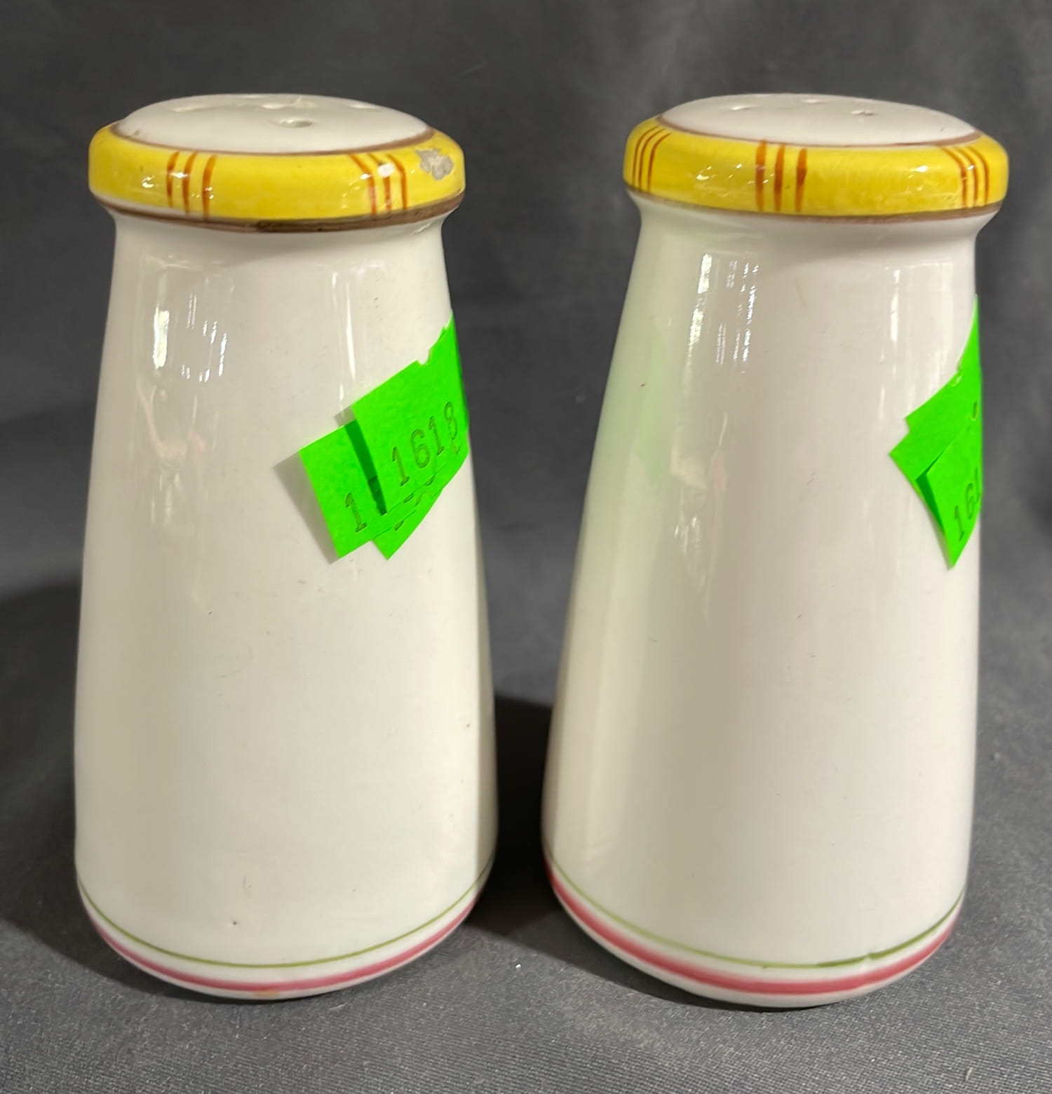 1211 Phlatzgraff ceramic snack trays 9", McCoy ceramic salt and pepper shakers 4", McCoy ceramic mugs-rim is chipped on one 3"