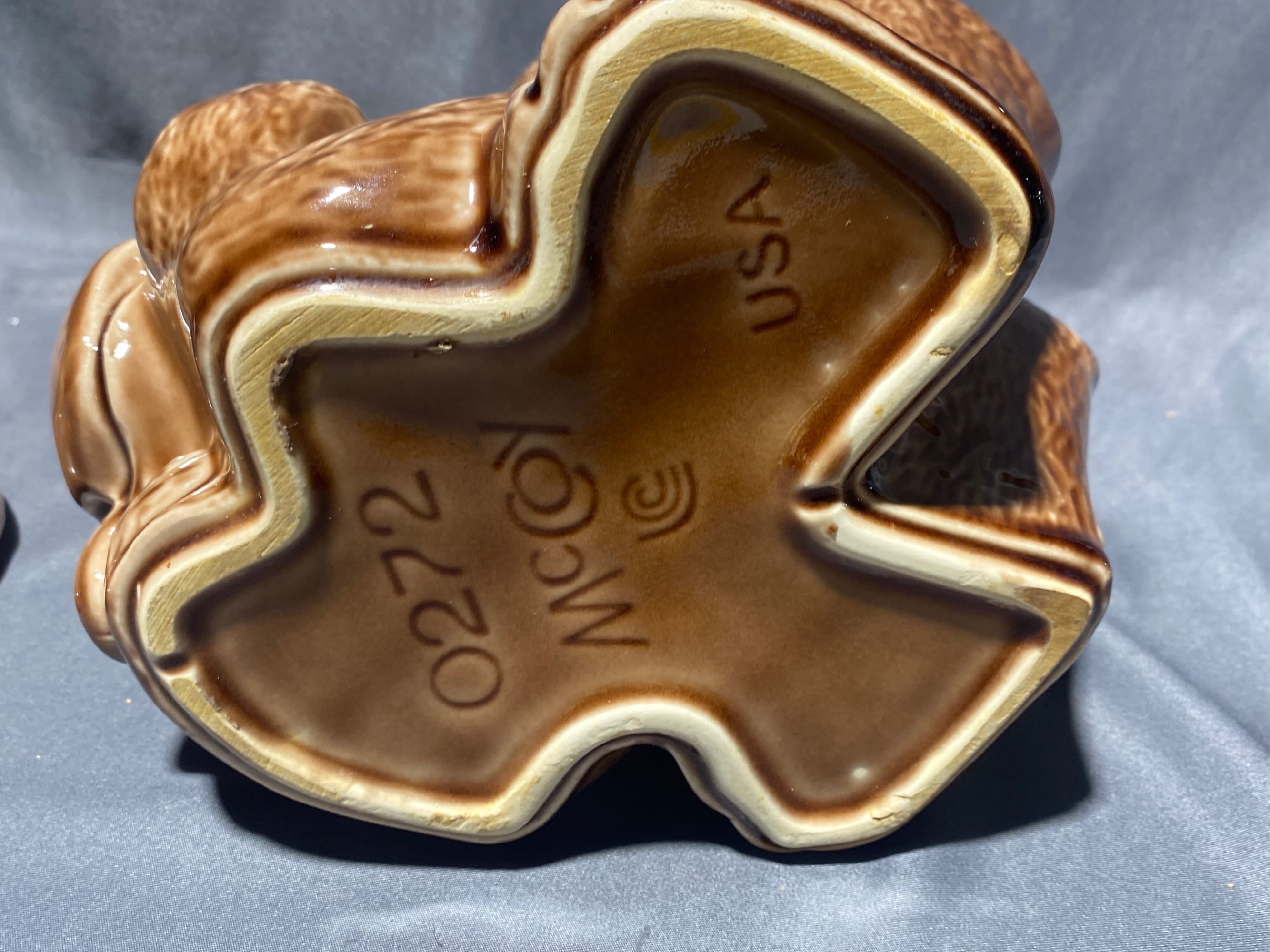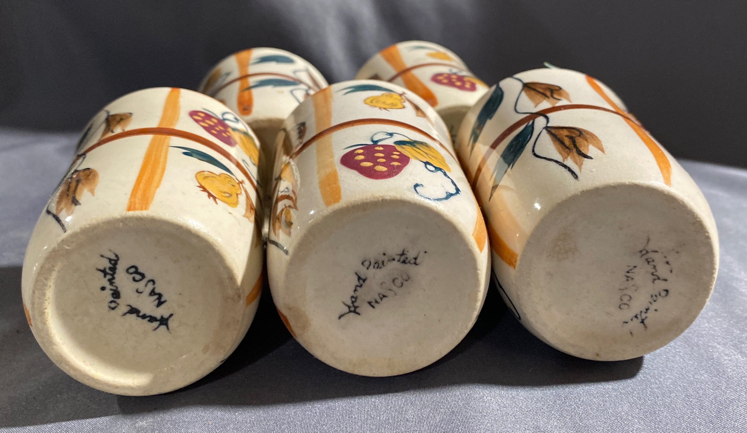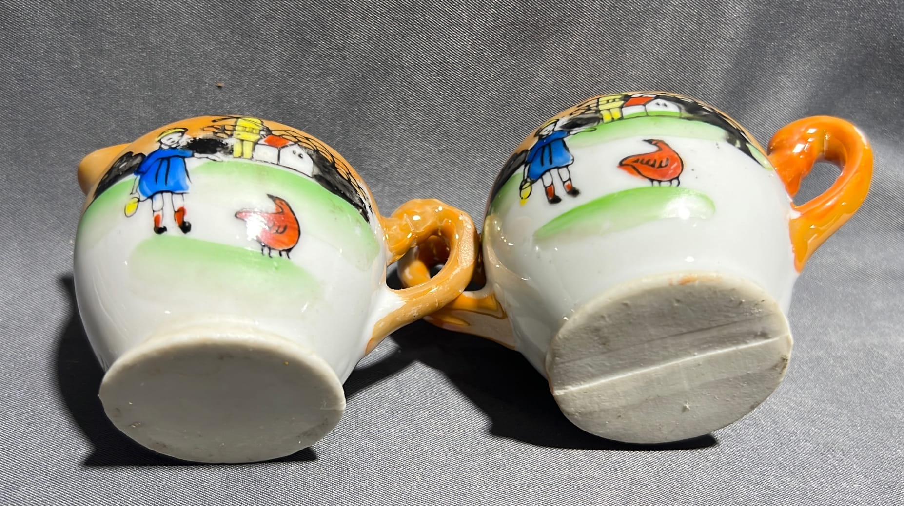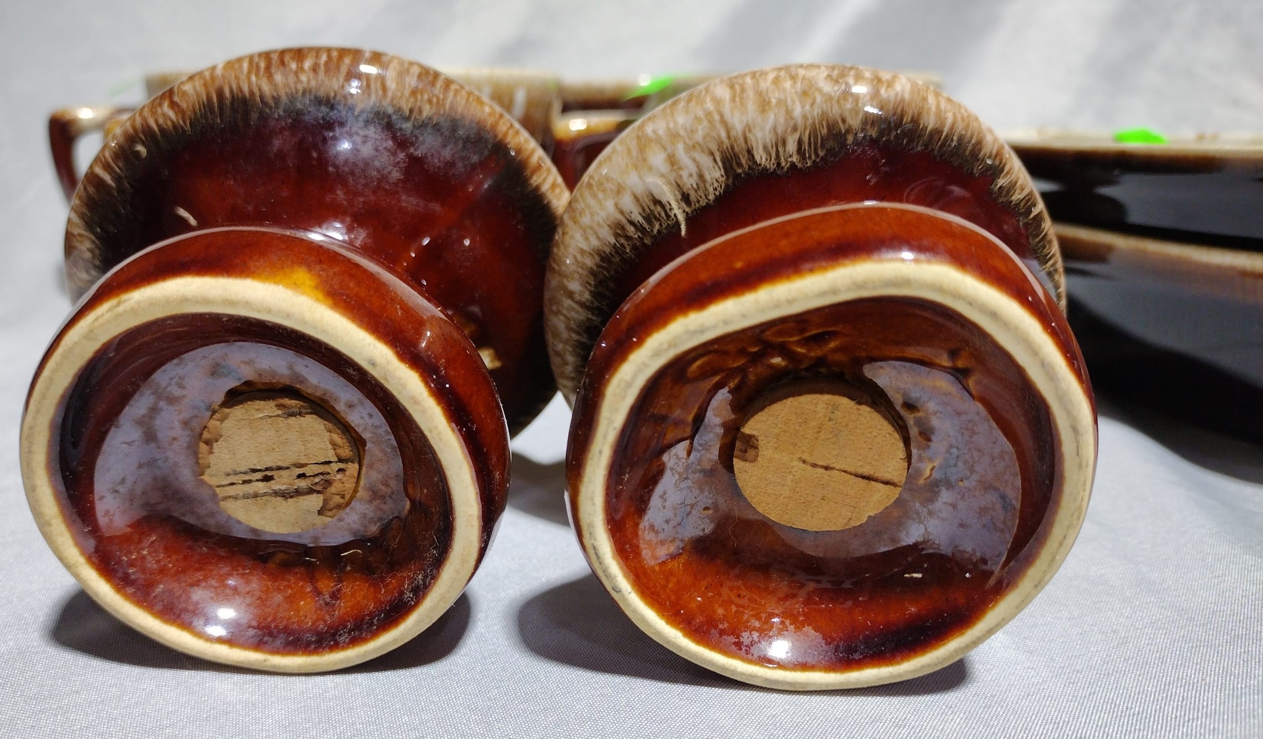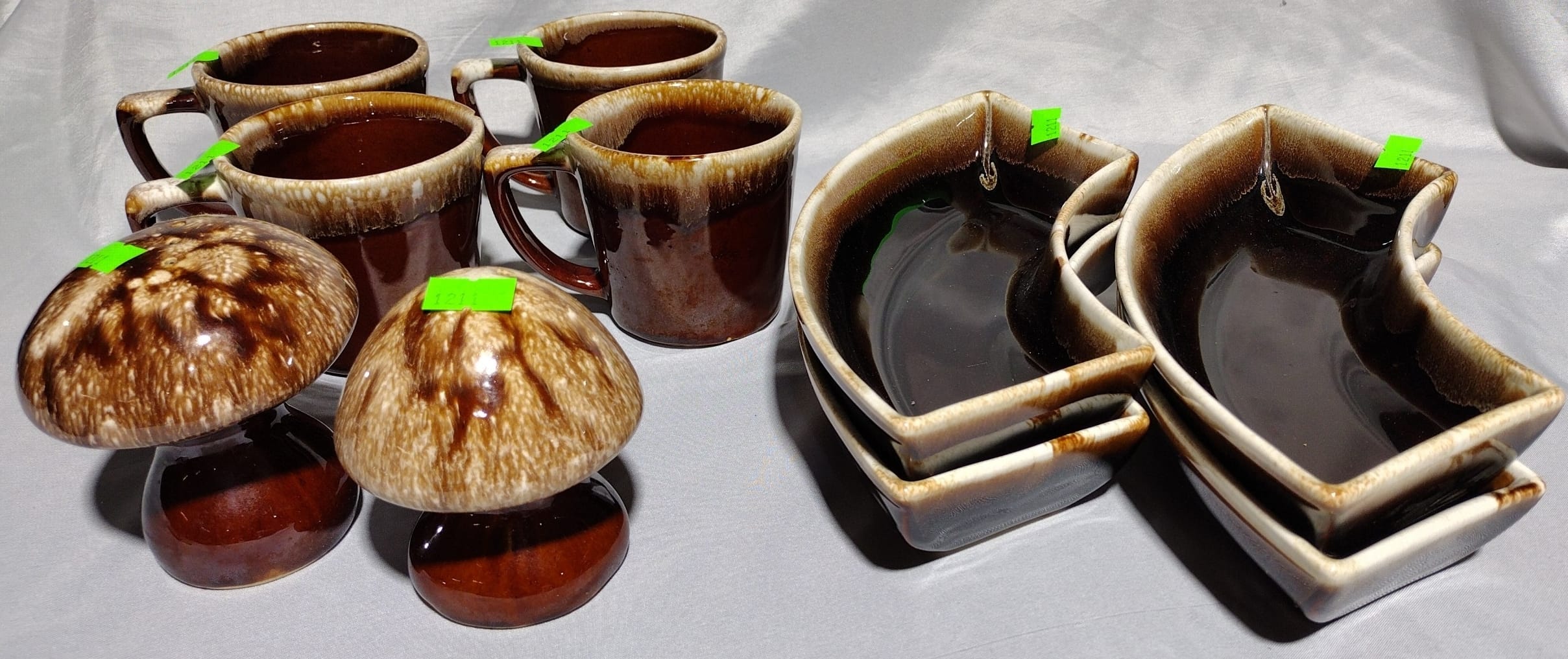 1211 Phlatzgraff ceramic snack trays 9", McCoy ceramic salt and pepper shakers 4", McCoy ceramic mugs-rim is chipped on one 3"