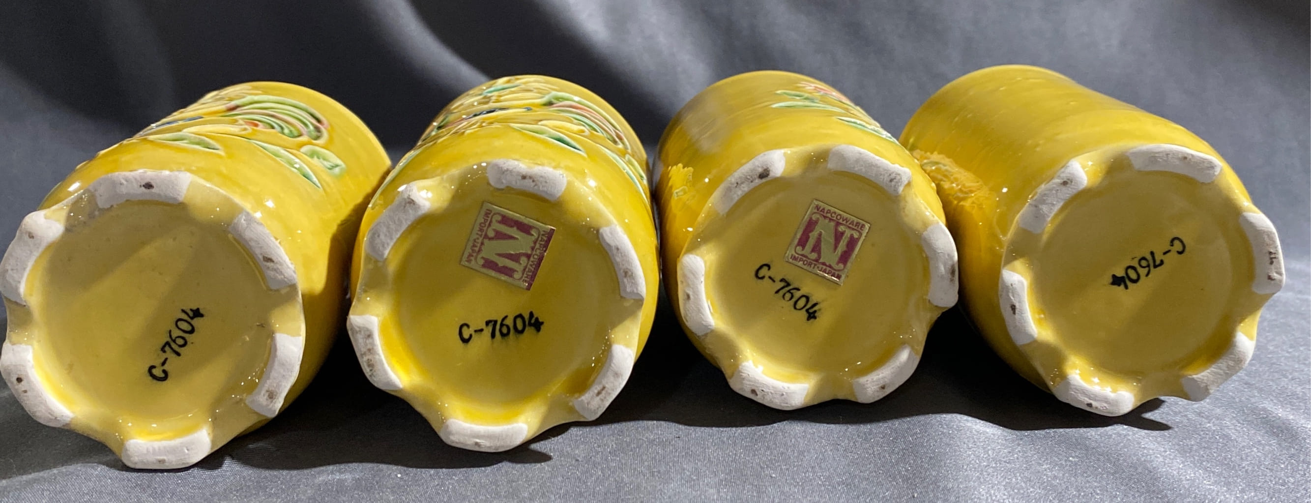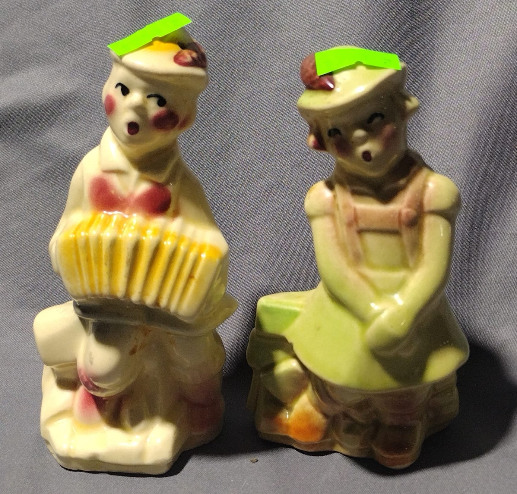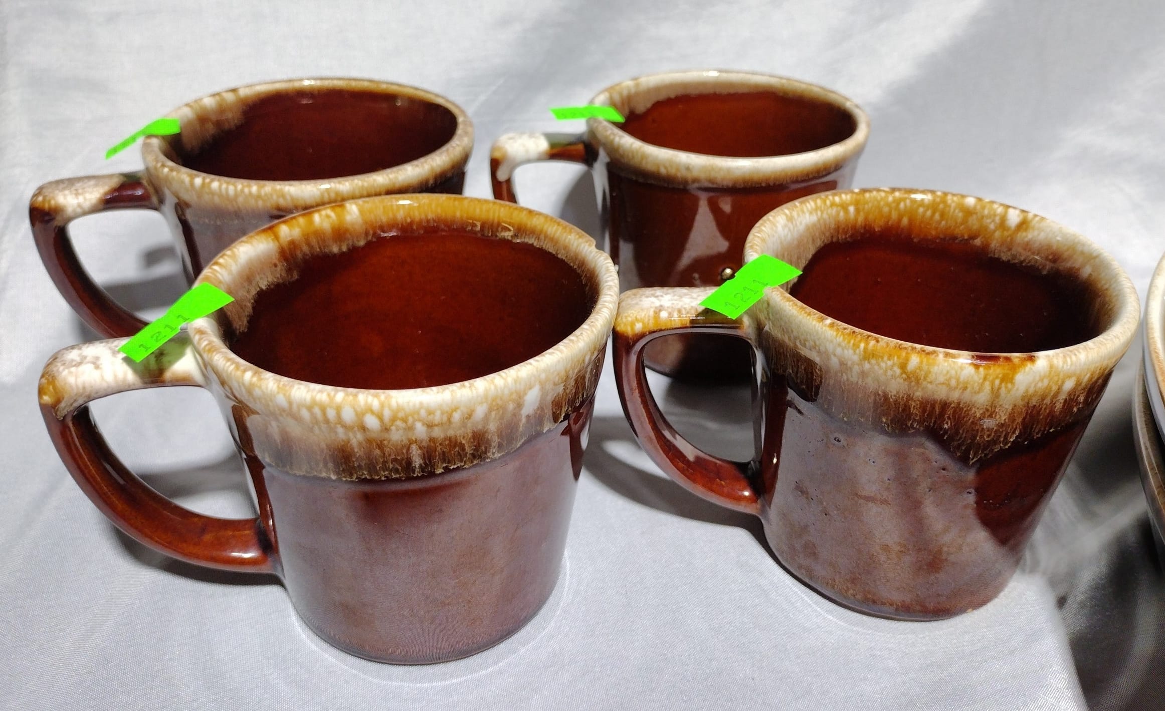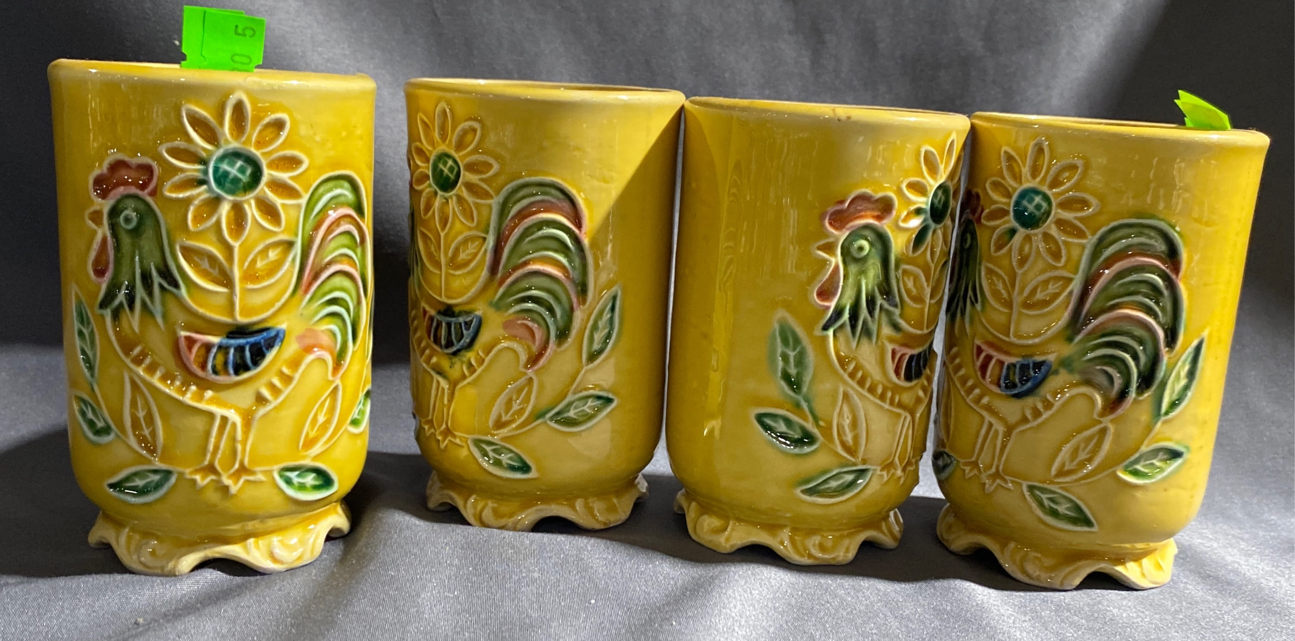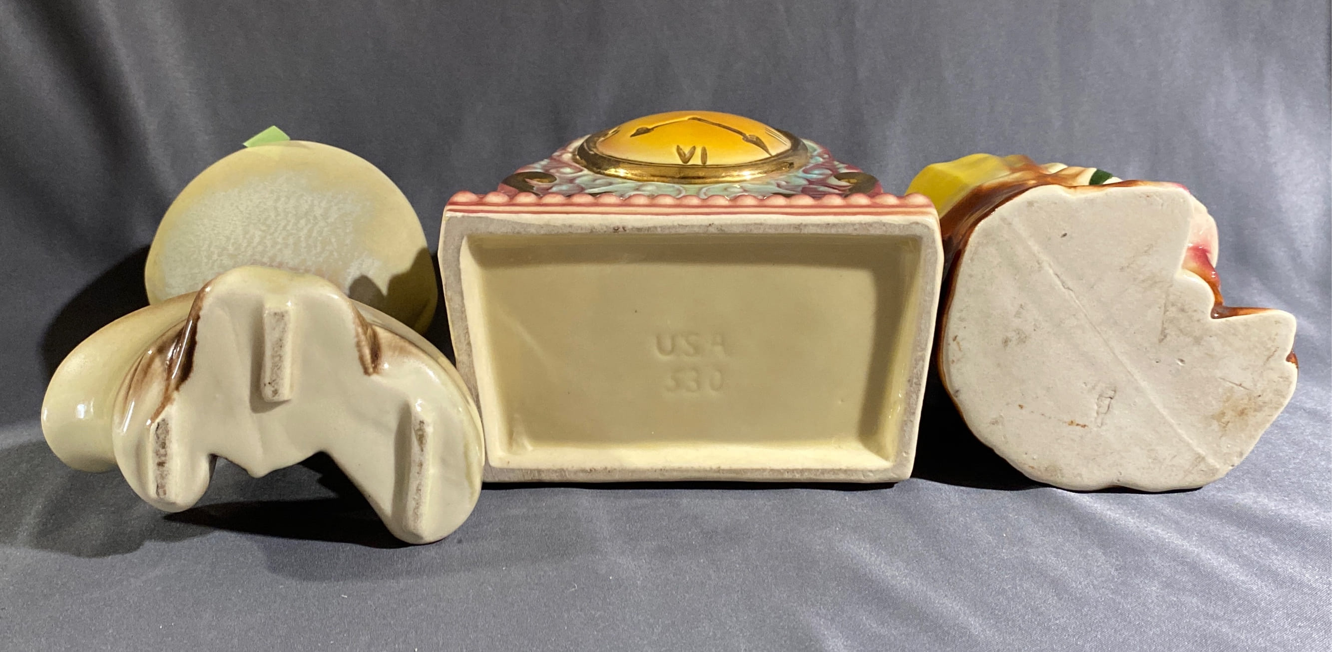 1211 Phlatzgraff ceramic snack trays 9", McCoy ceramic salt and pepper shakers 4", McCoy ceramic mugs-rim is chipped on one 3"