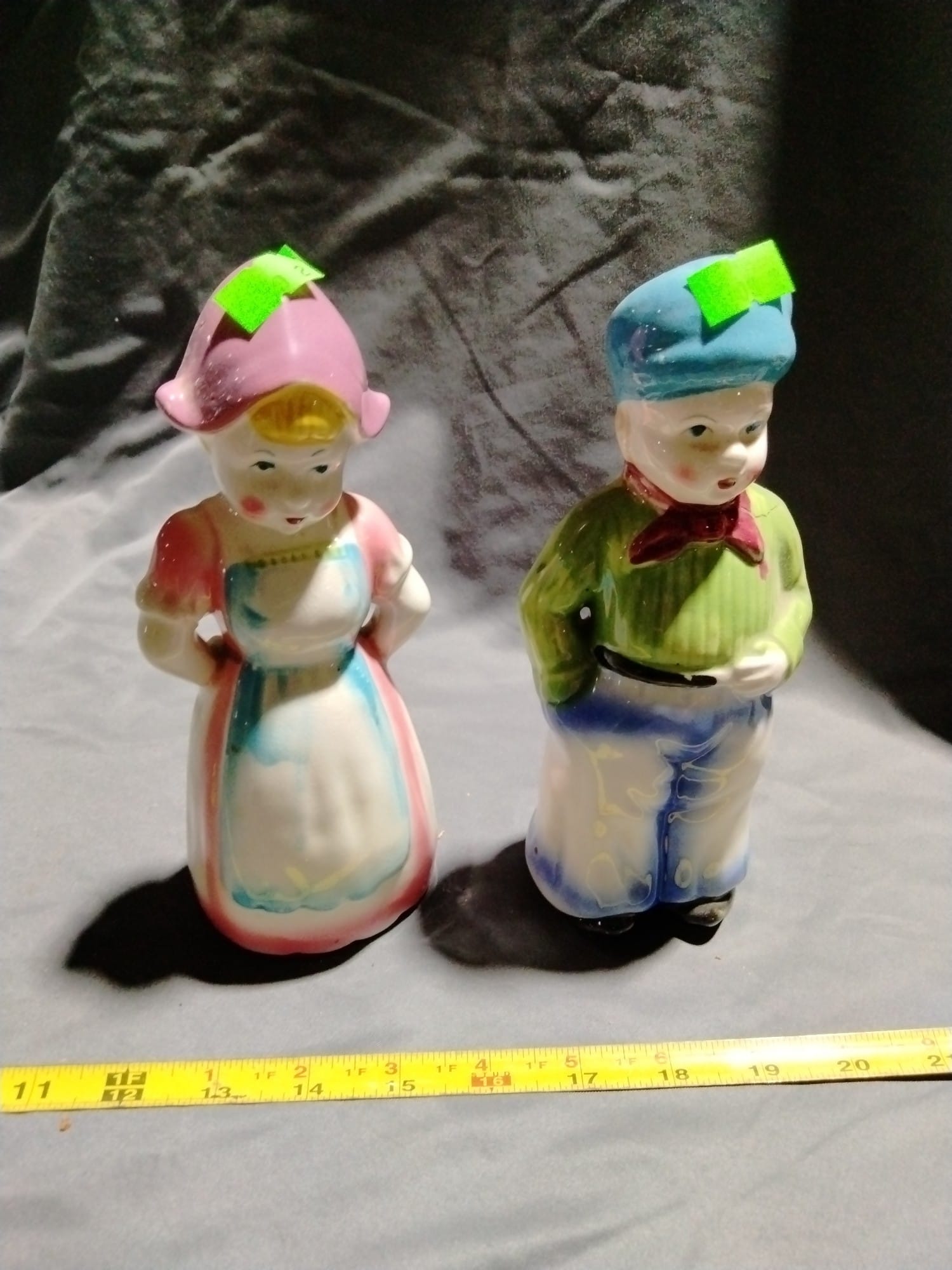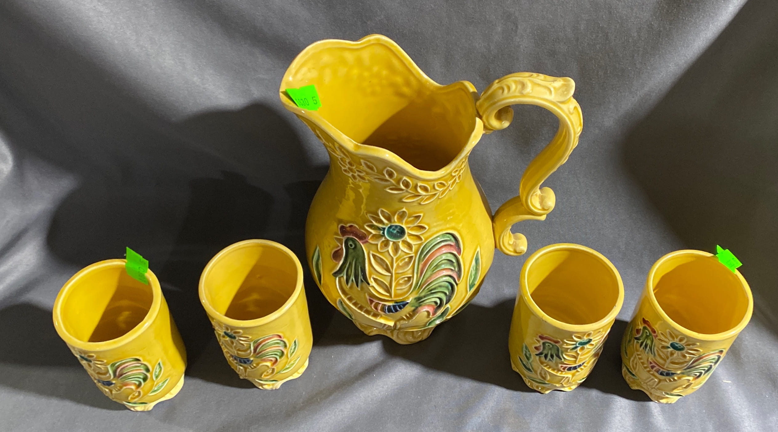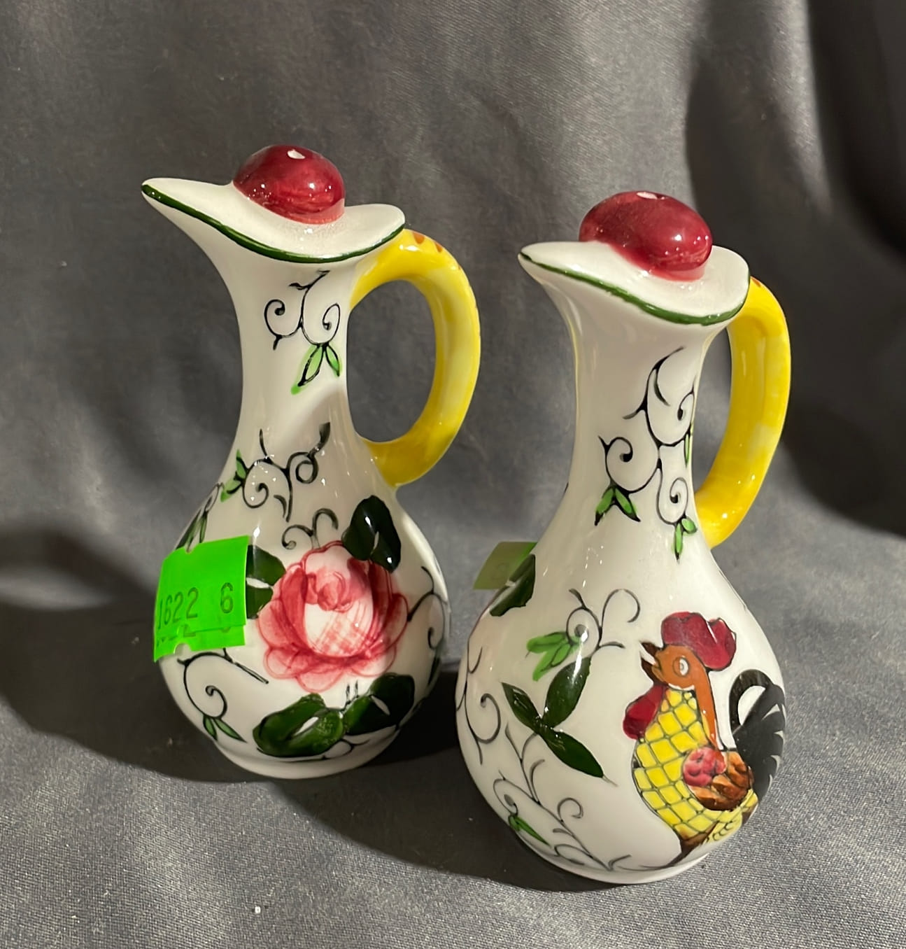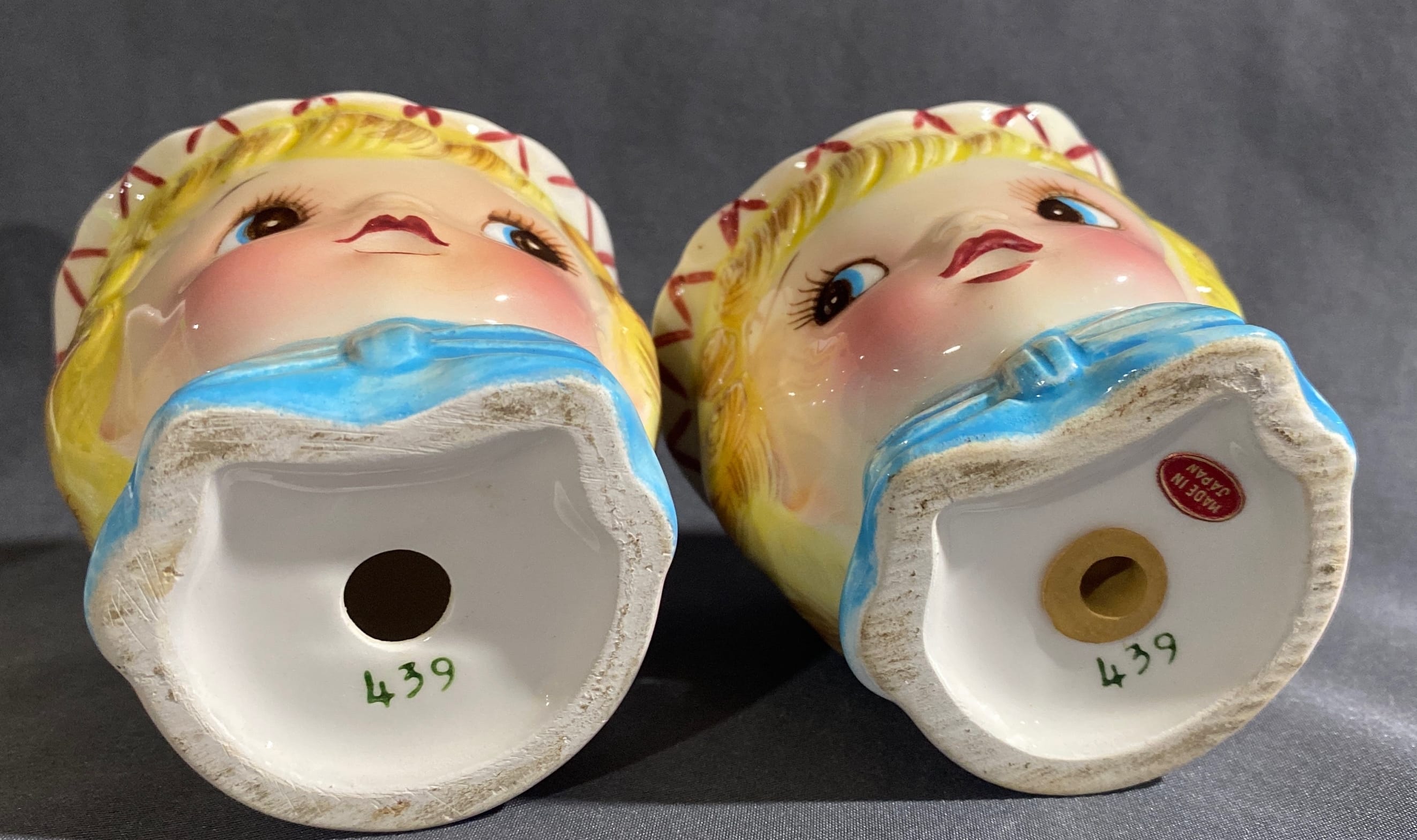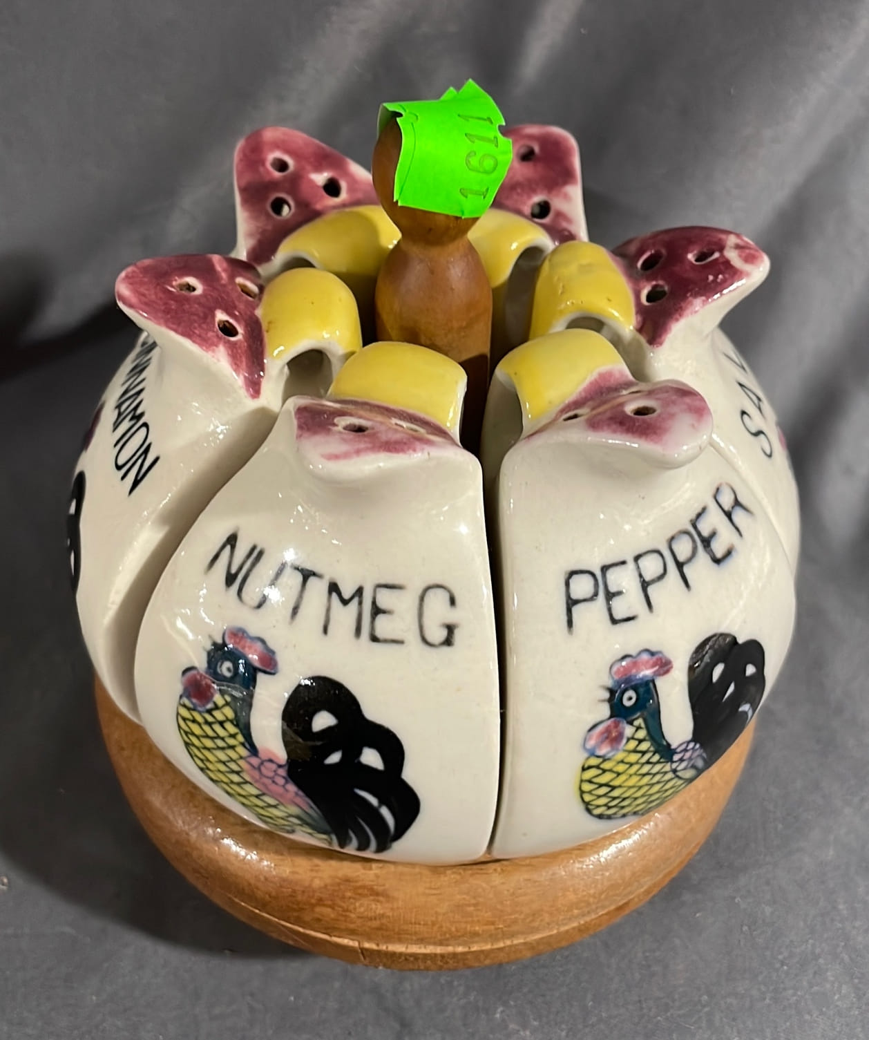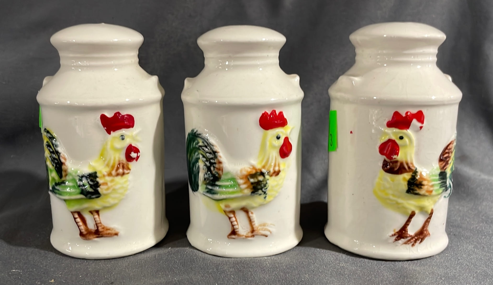 1211 Phlatzgraff ceramic snack trays 9", McCoy ceramic salt and pepper shakers 4", McCoy ceramic mugs-rim is chipped on one 3"