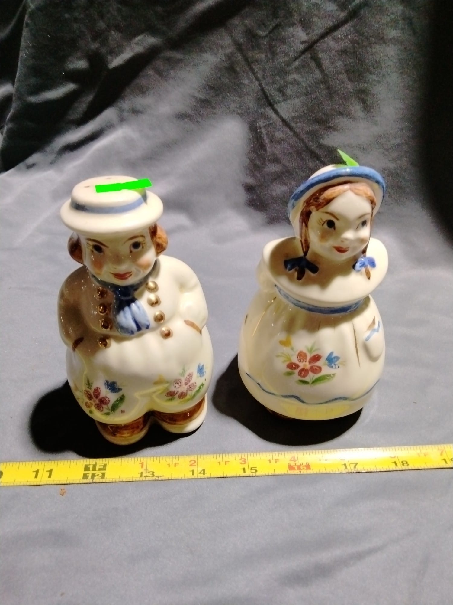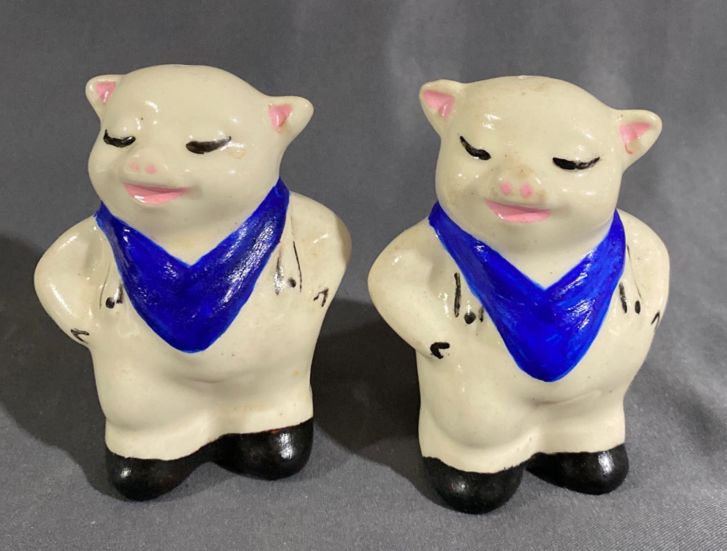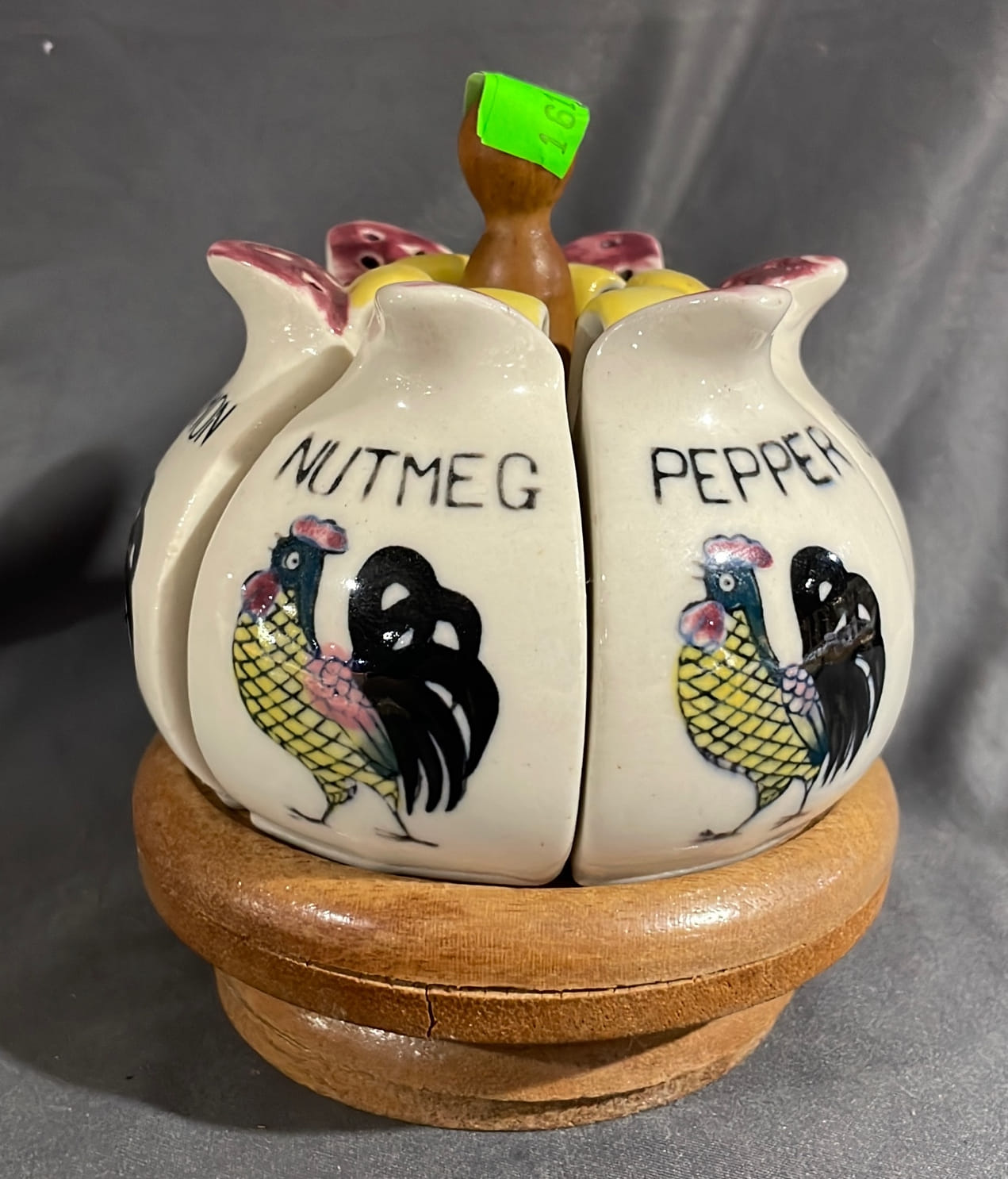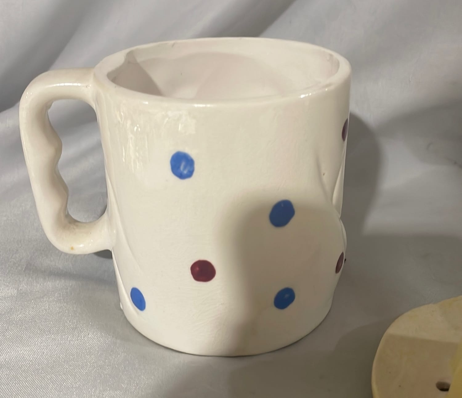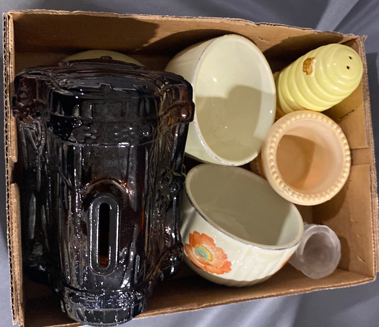 1211 Phlatzgraff ceramic snack trays 9", McCoy ceramic salt and pepper shakers 4", McCoy ceramic mugs-rim is chipped on one 3"