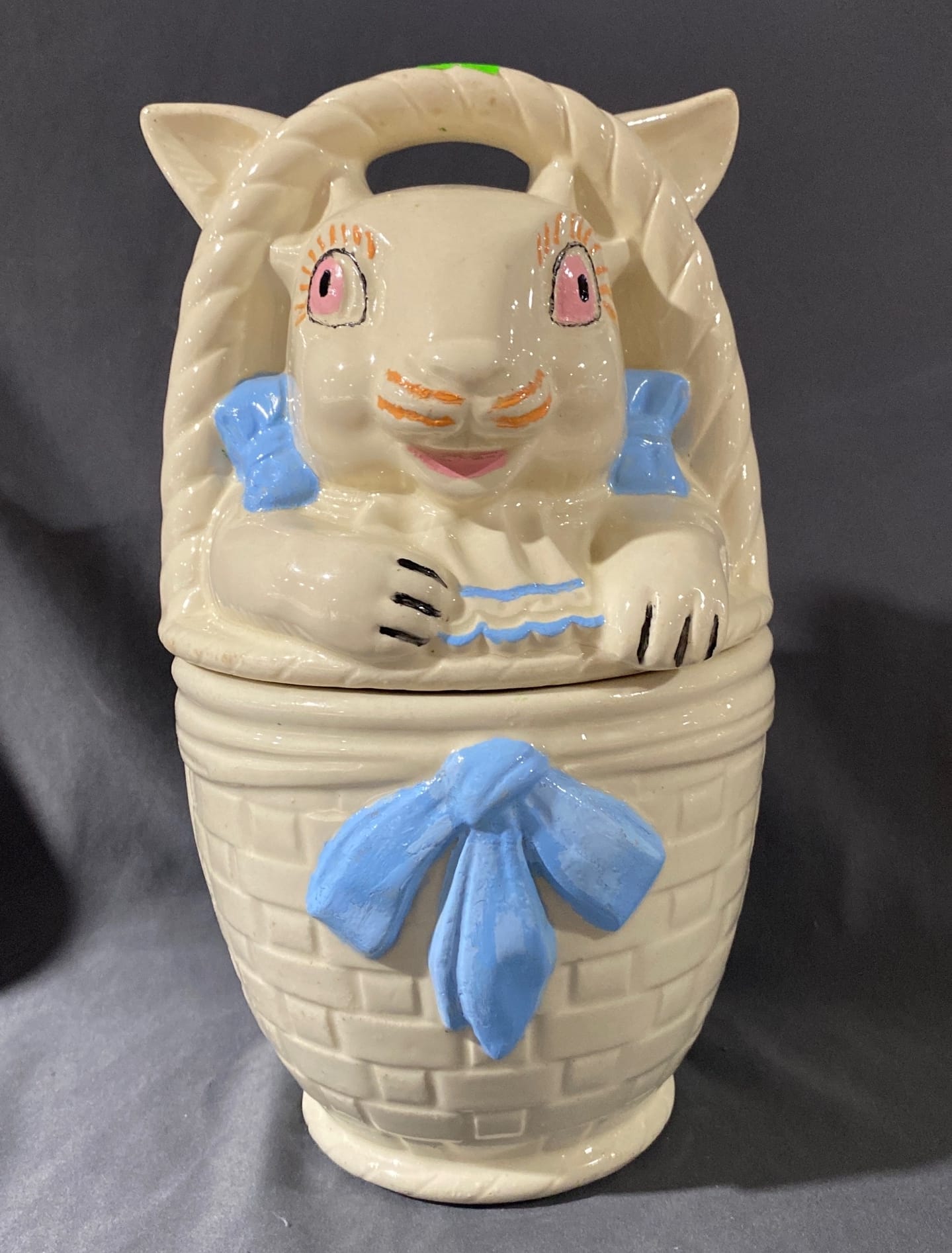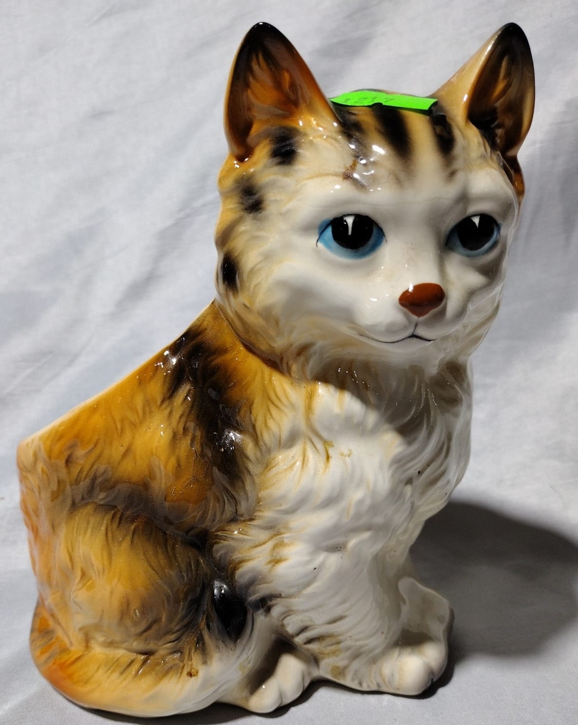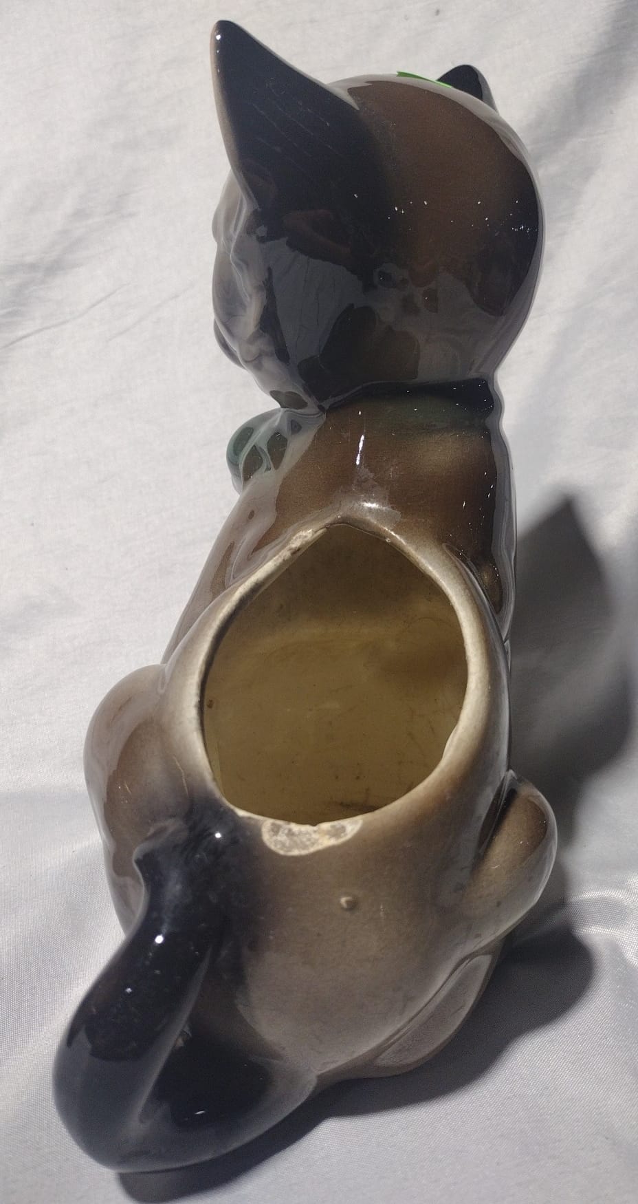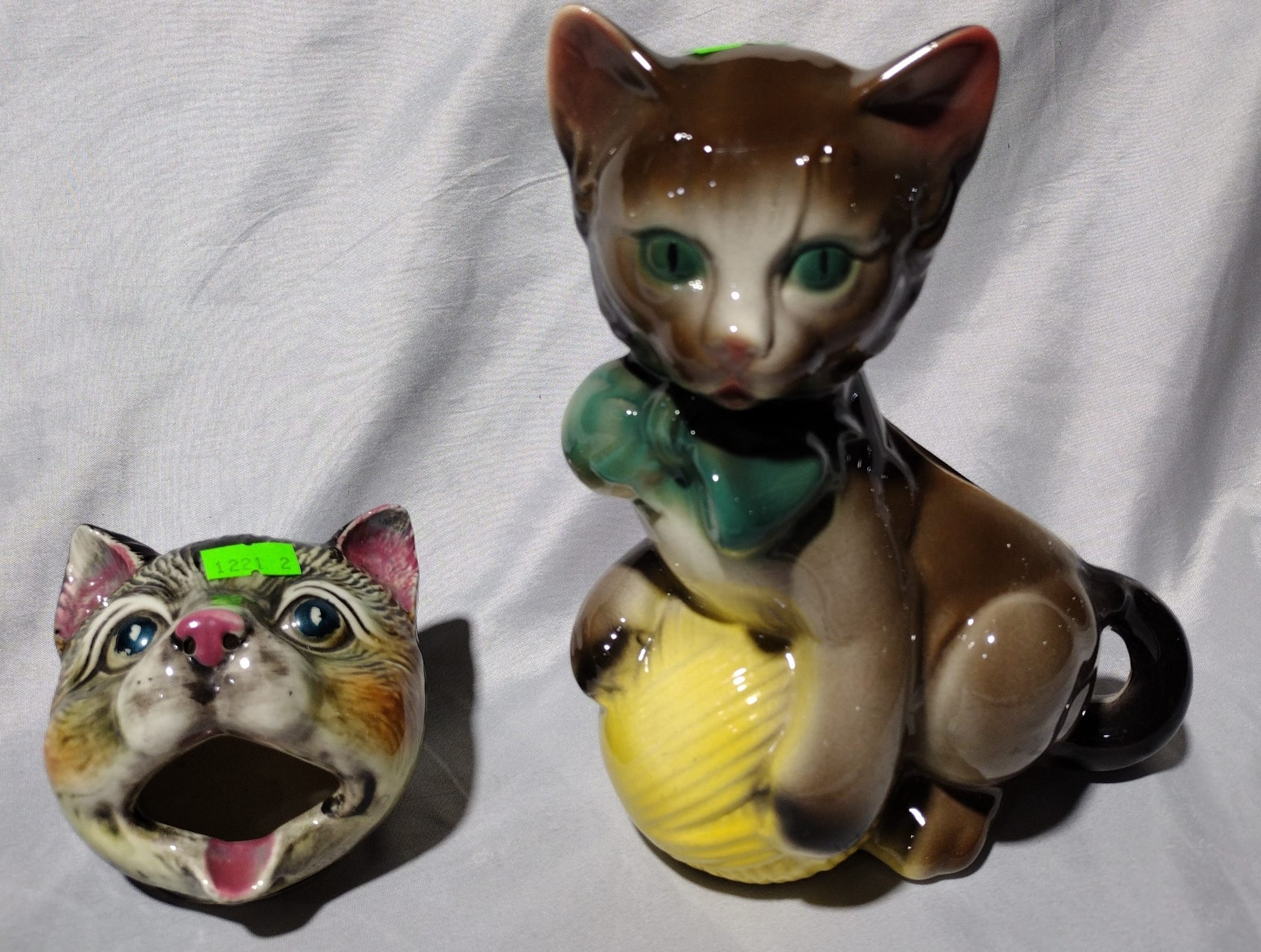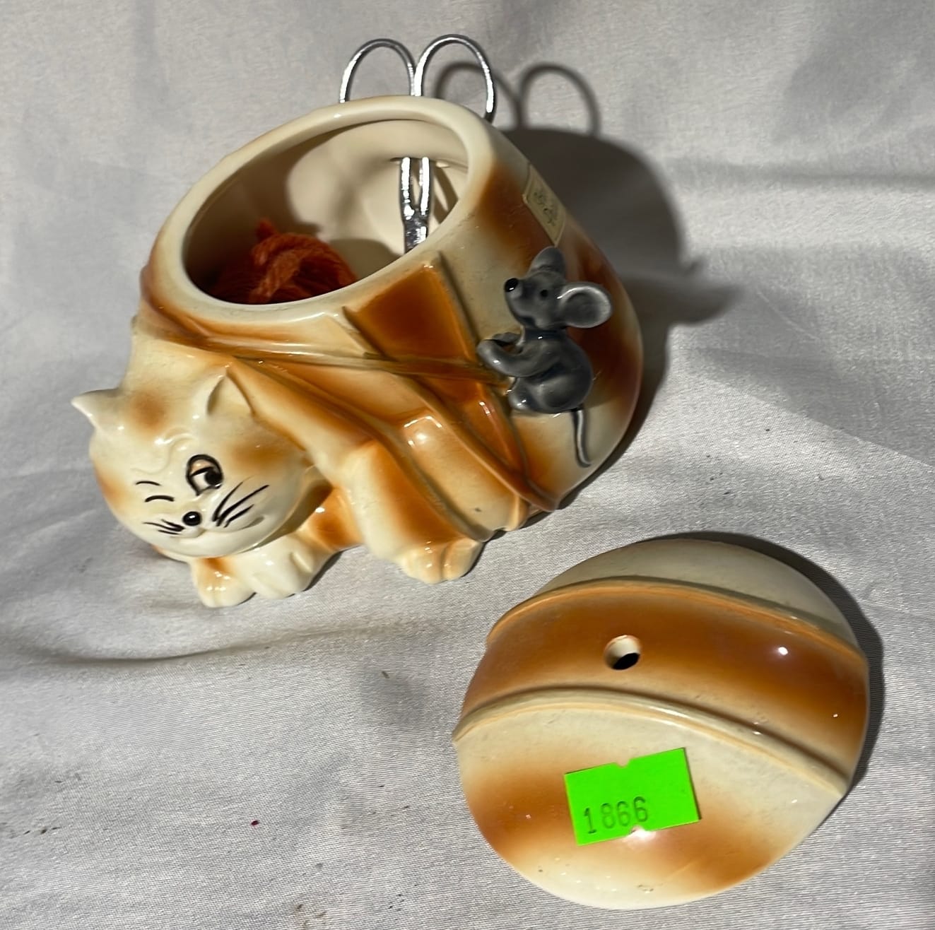 1221 Ceramic cat tea light holder 3"x4", ceramic cat with yarn planter-chipped 6"x8"