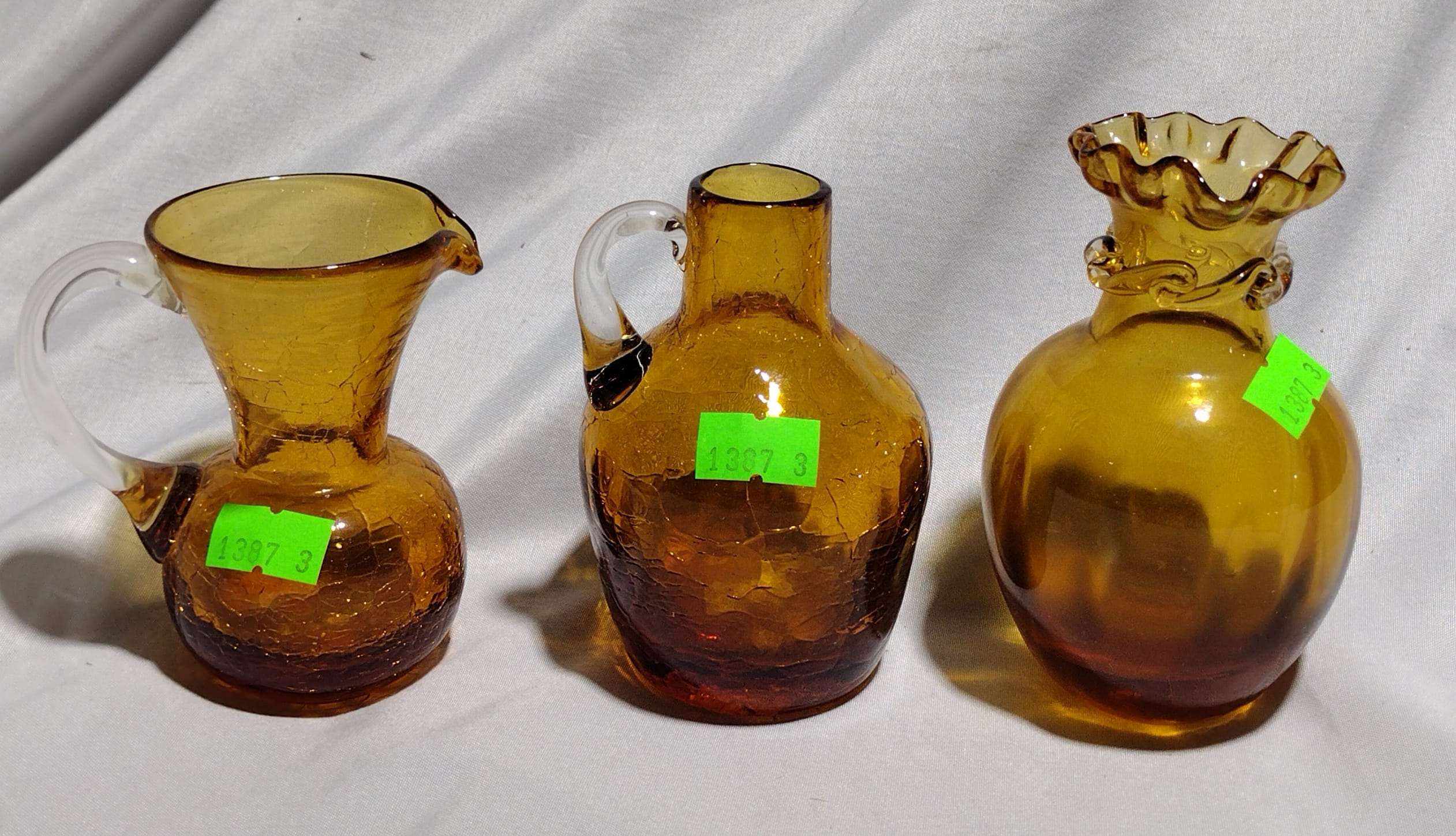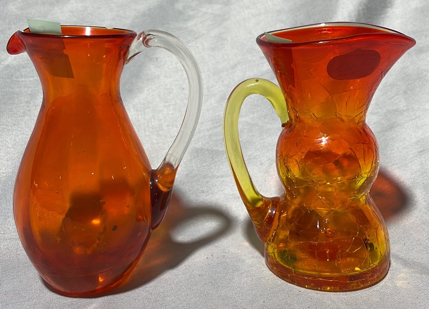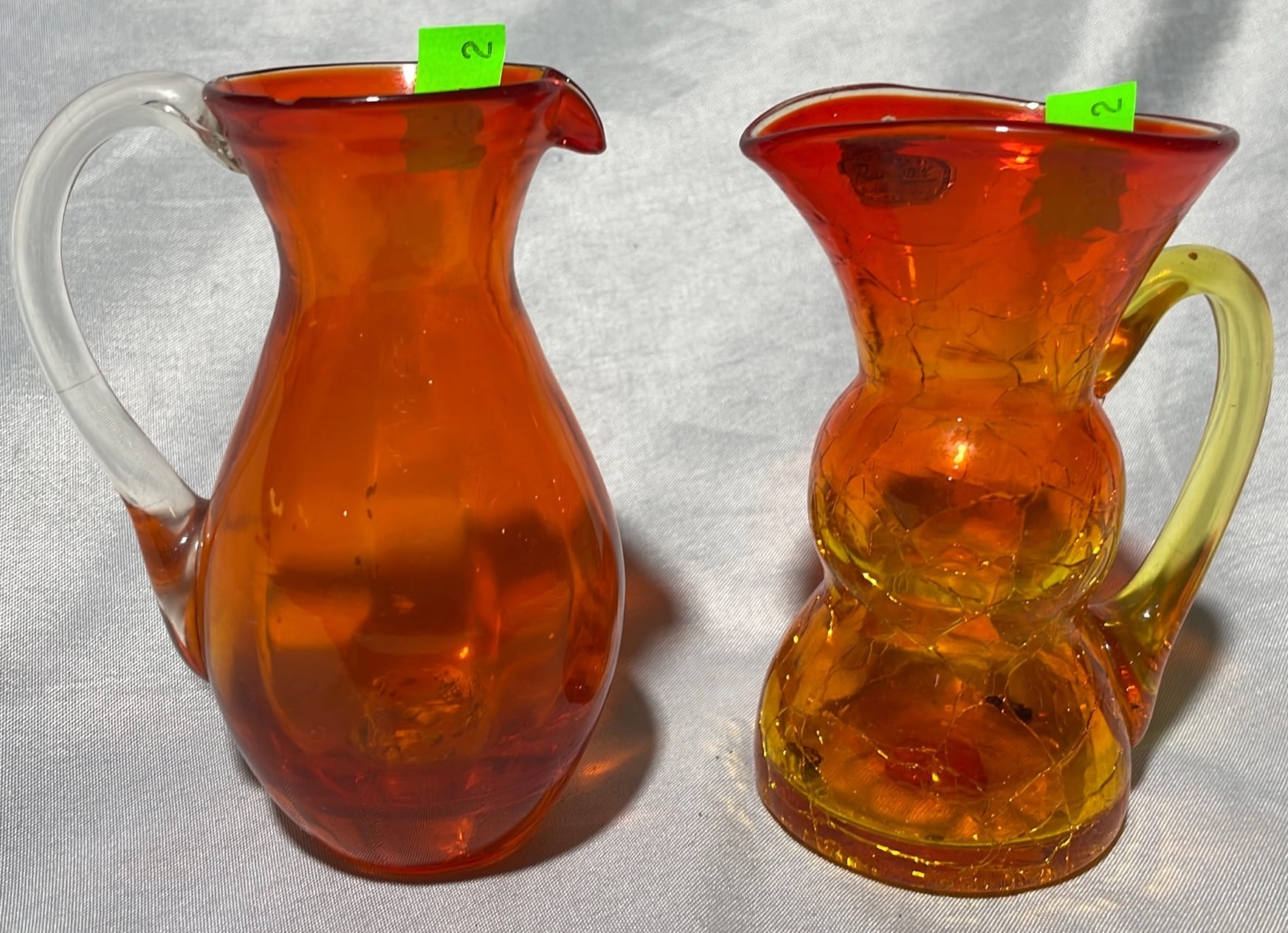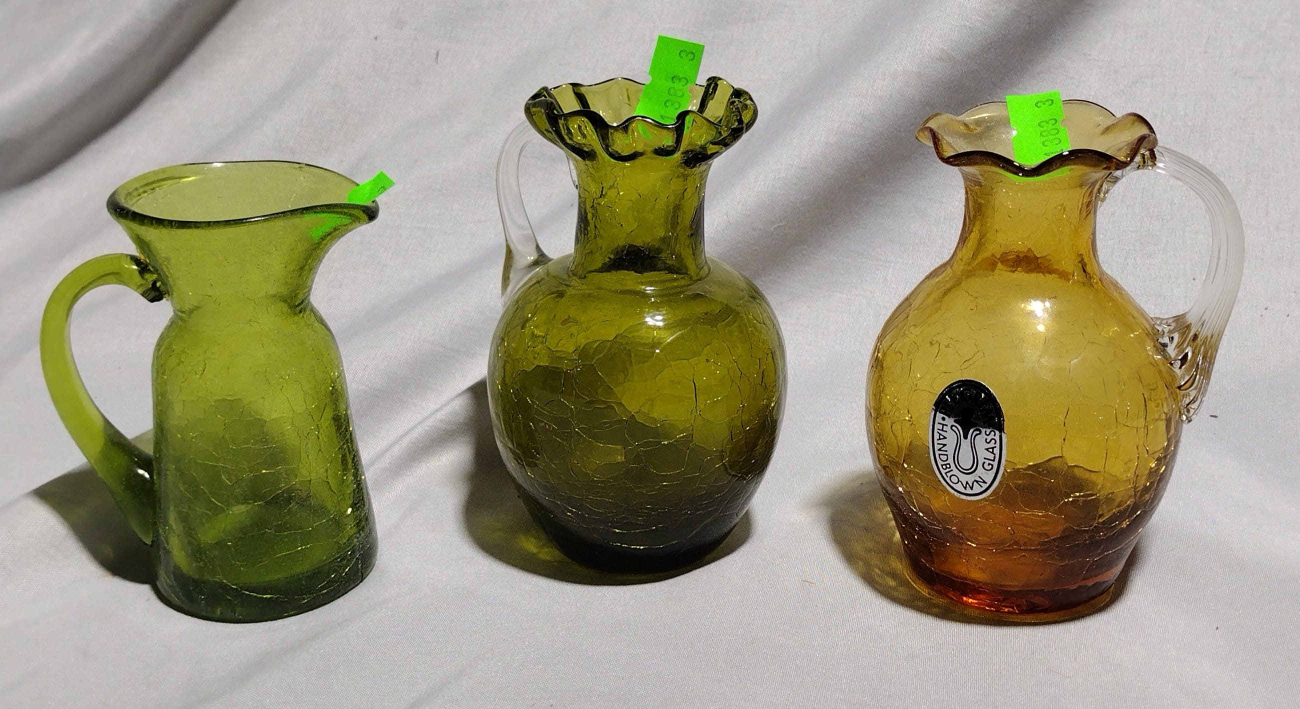 1234 2- Crackle glass creamers 4", 5", amber glass creamer 5"