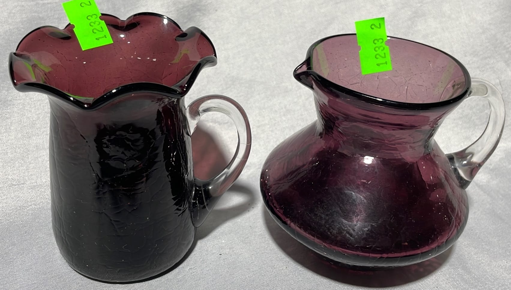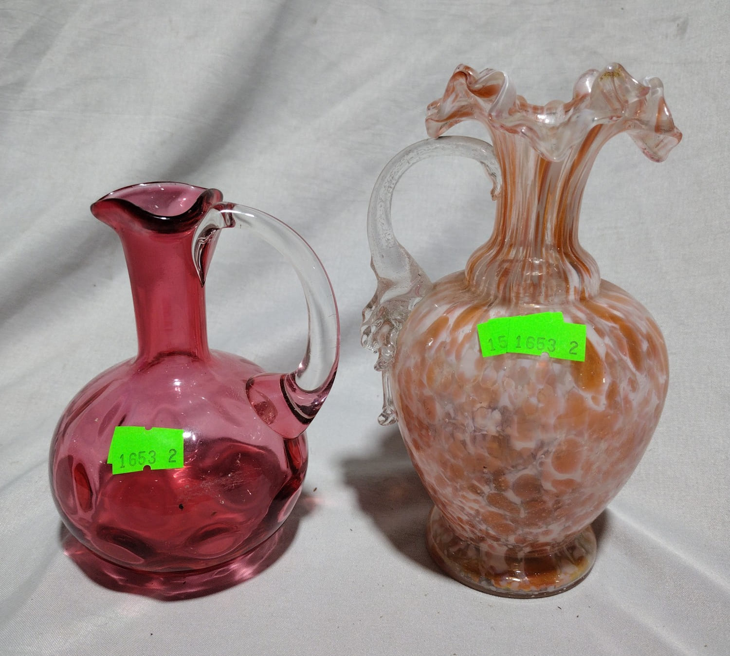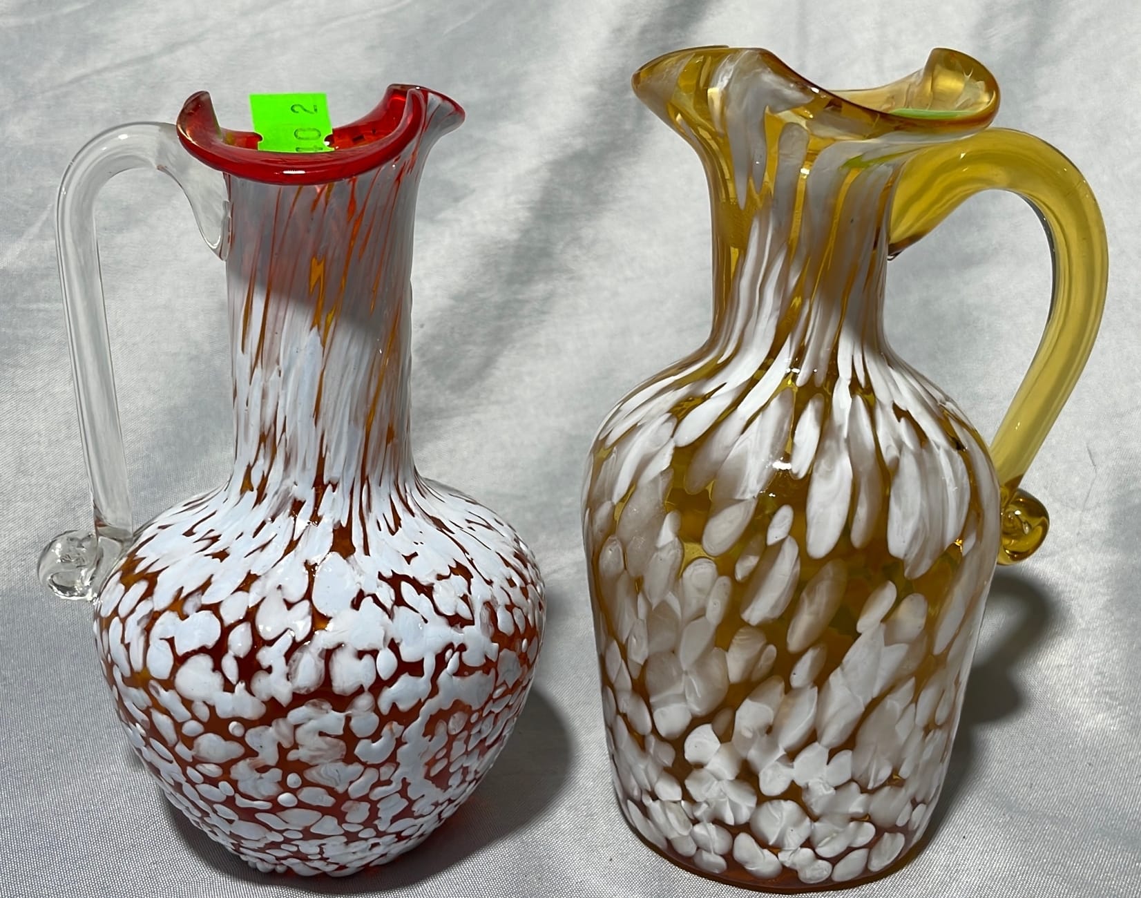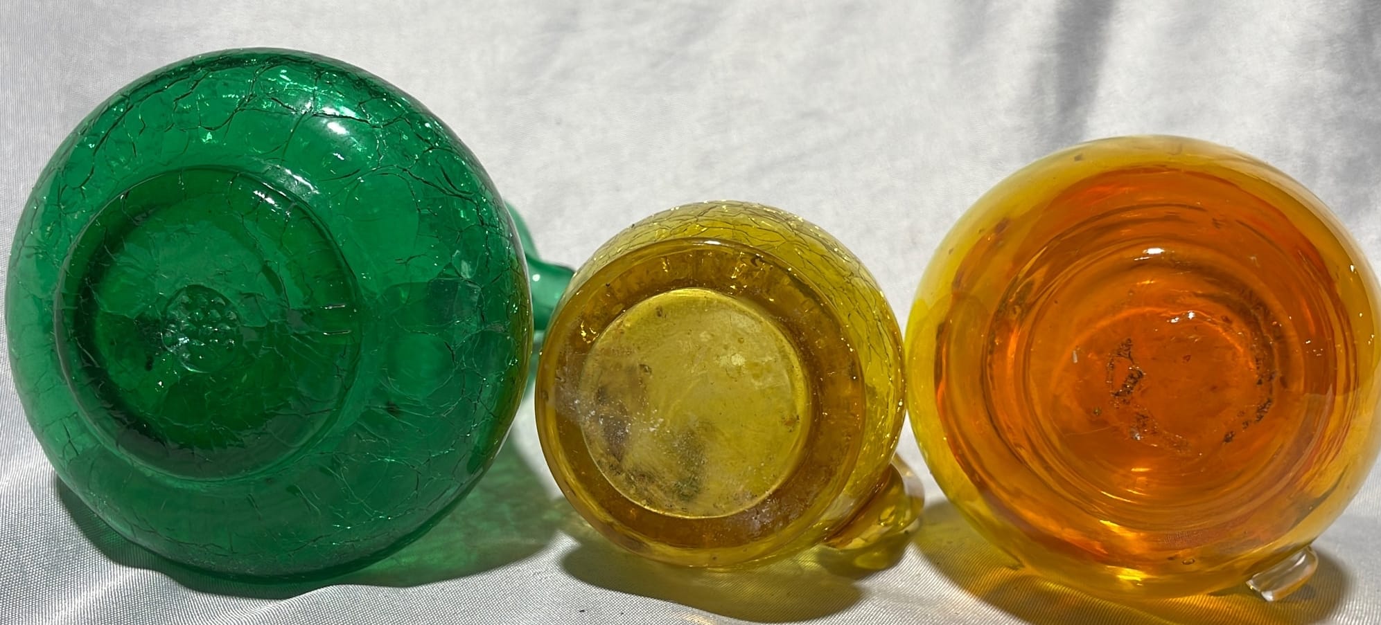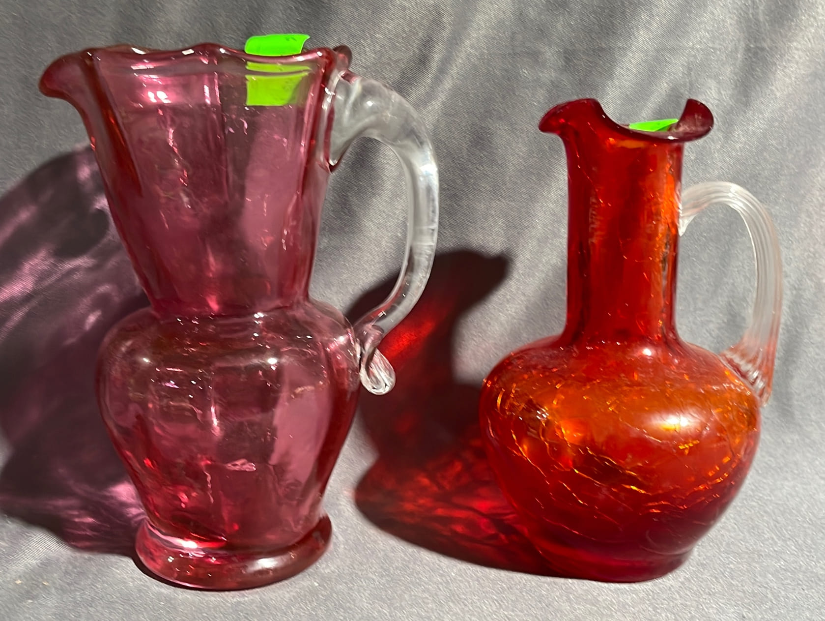 1234 2- Crackle glass creamers 4", 5", amber glass creamer 5"