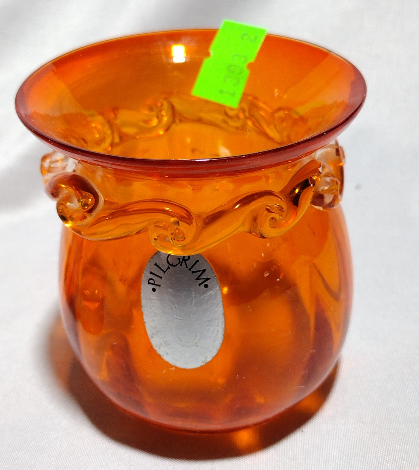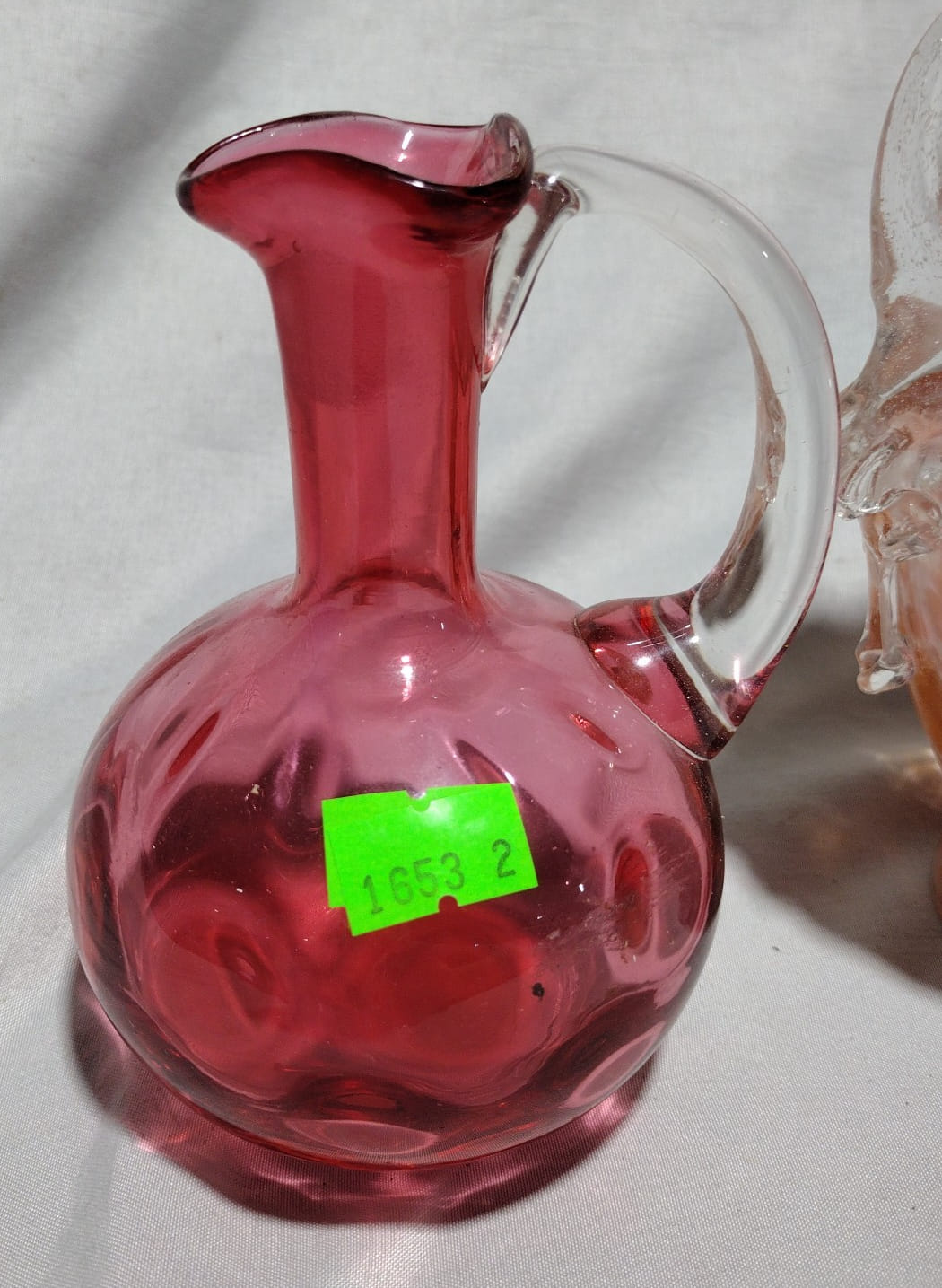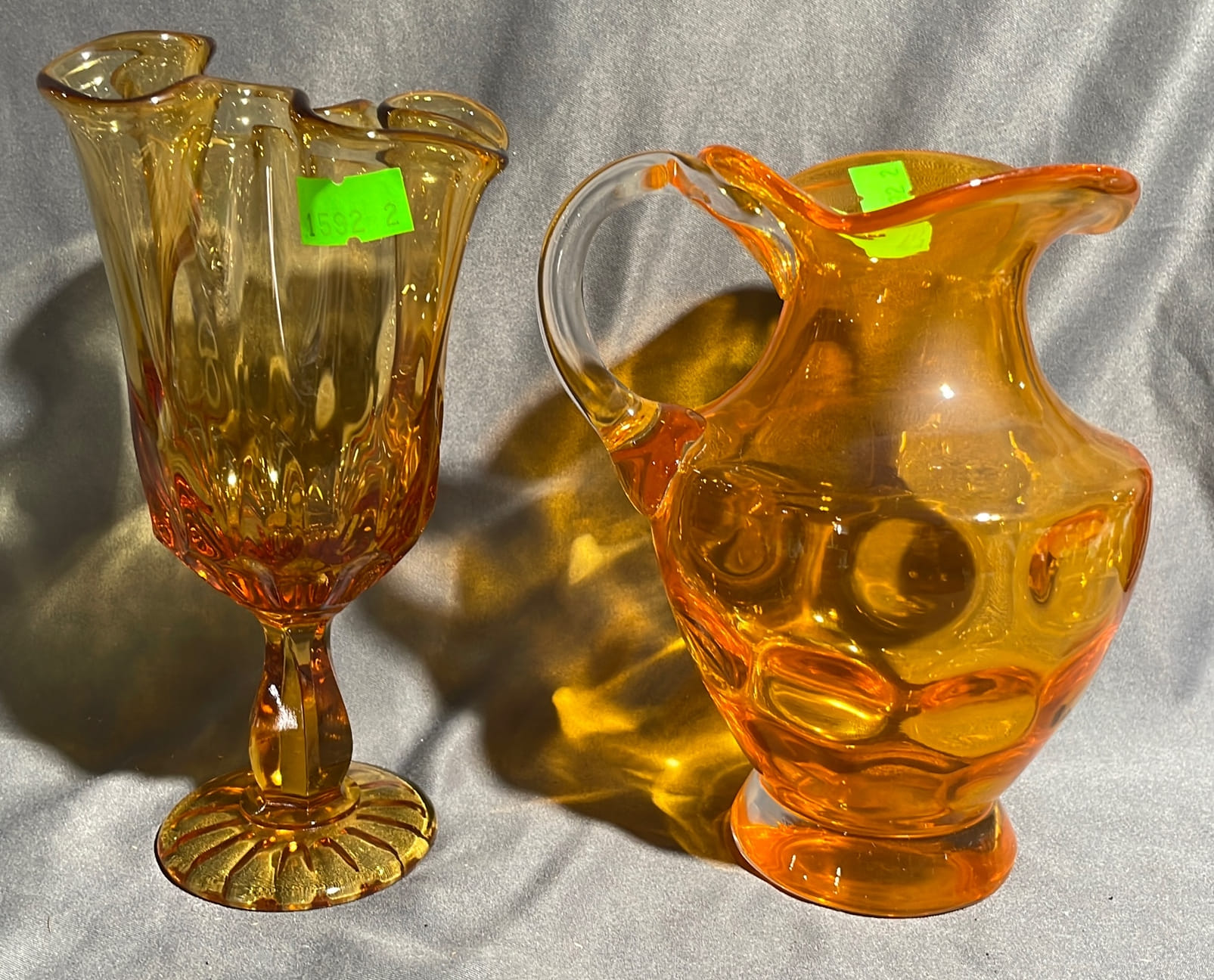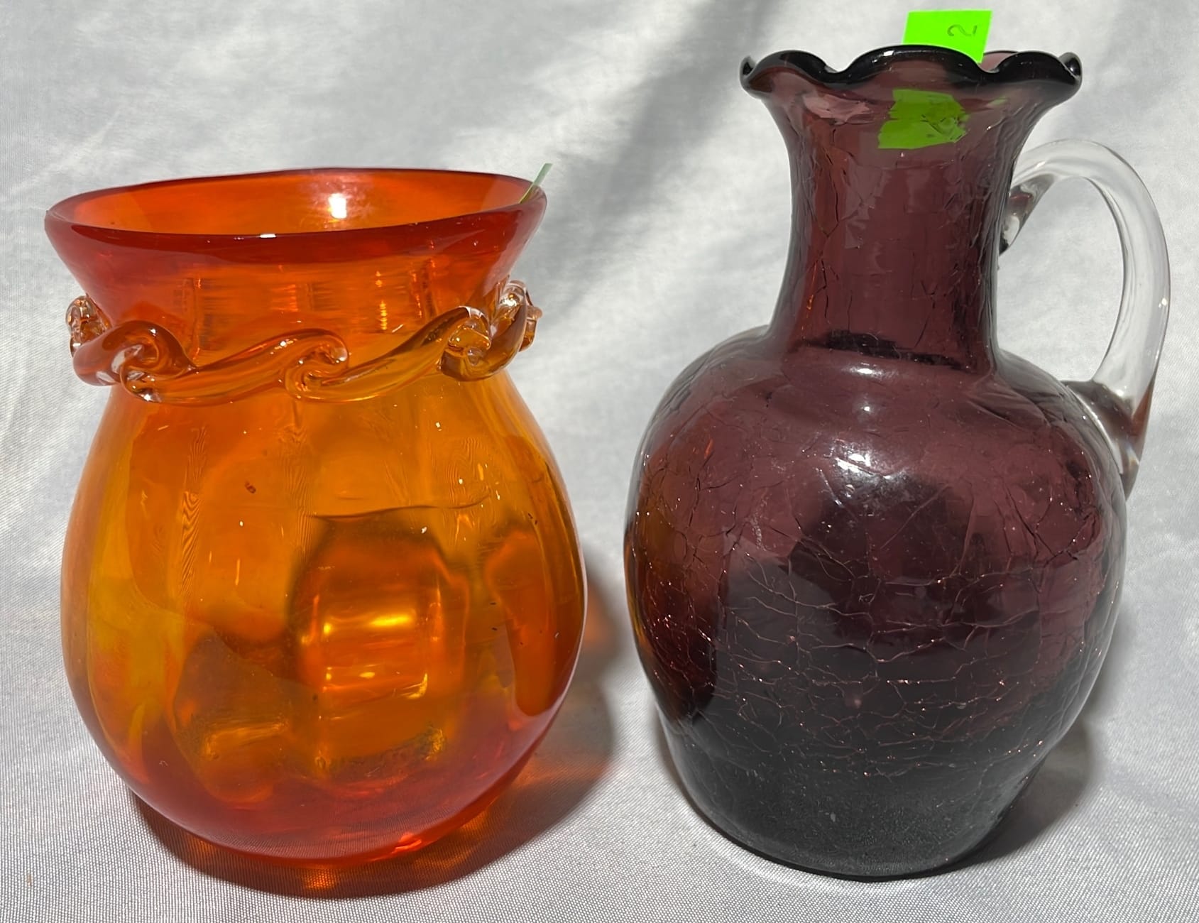 1239 Orange glass vase 3"x3", purple crackle creamer 5"