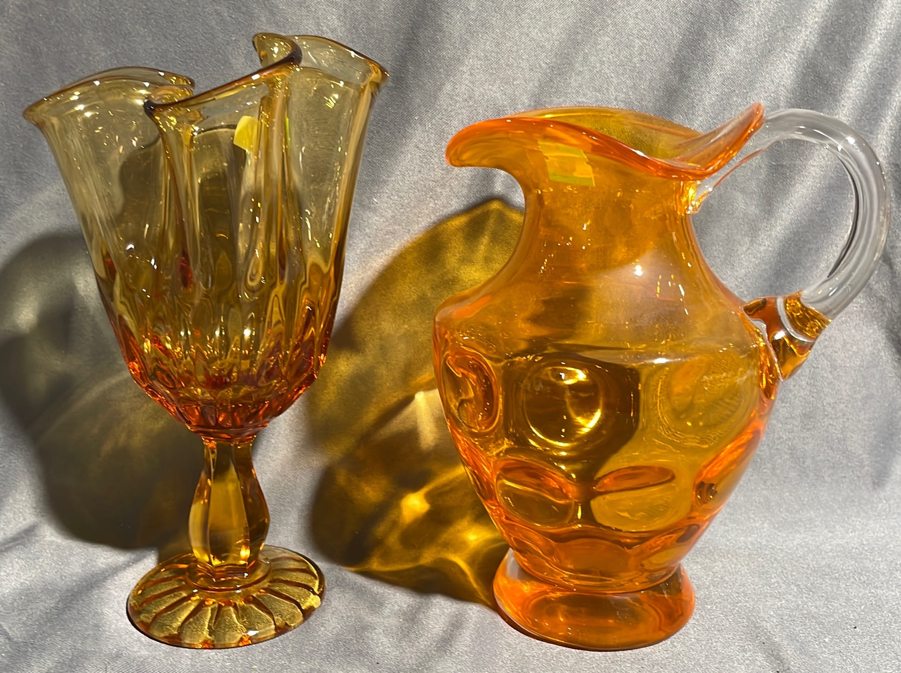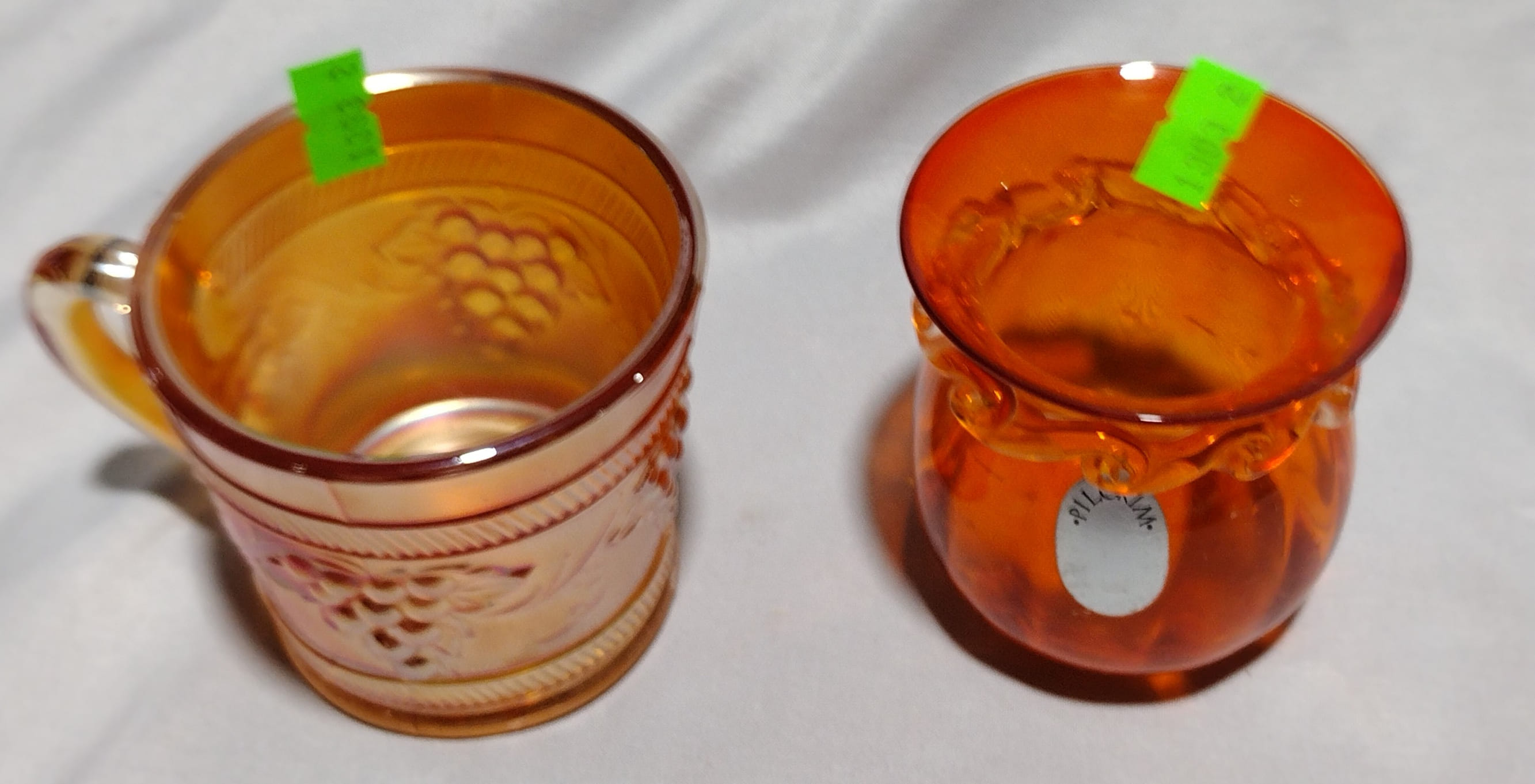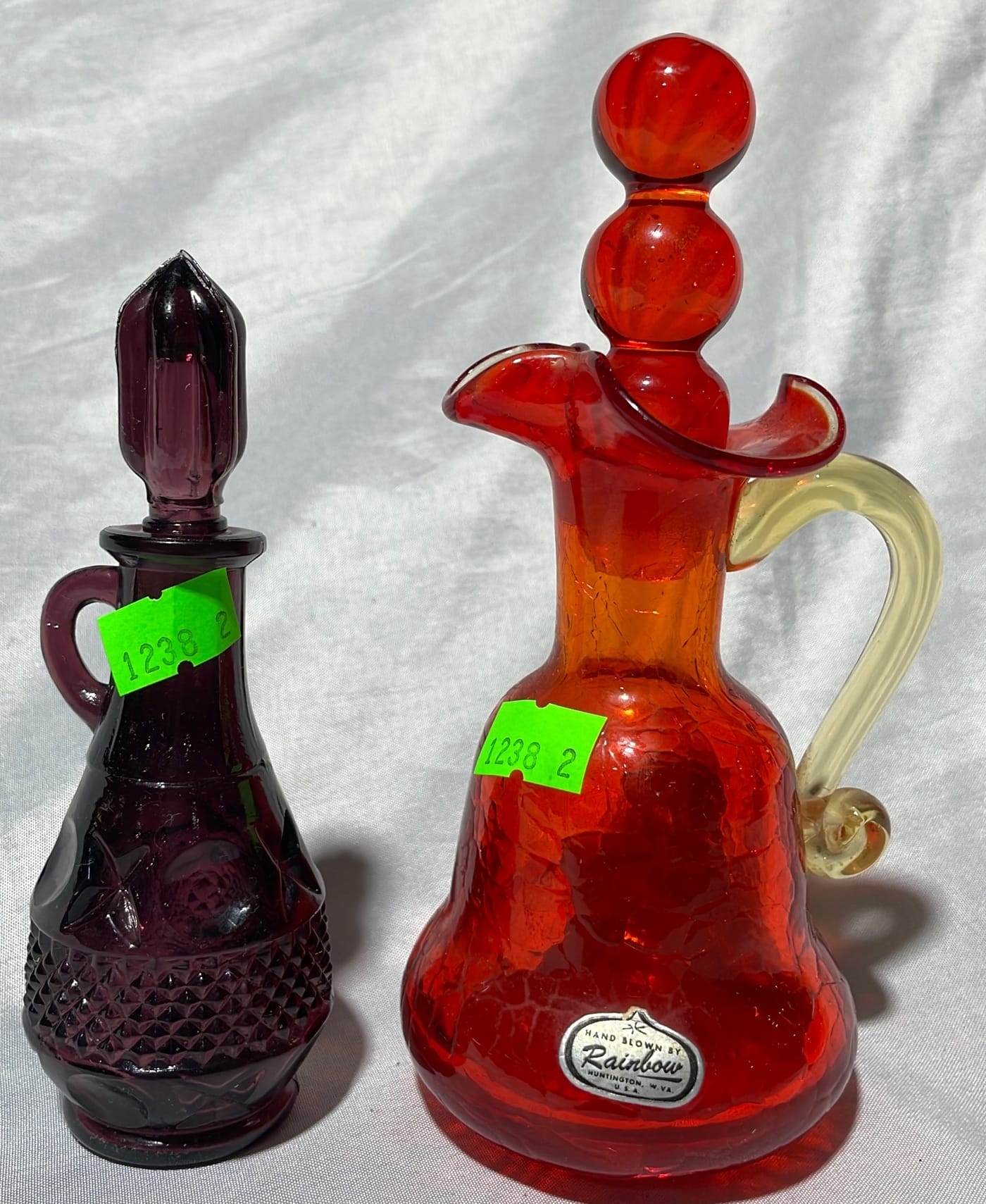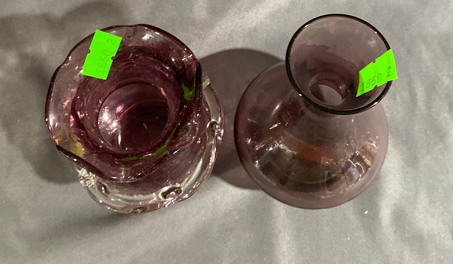 1239 Orange glass vase 3"x3", purple crackle creamer 5"