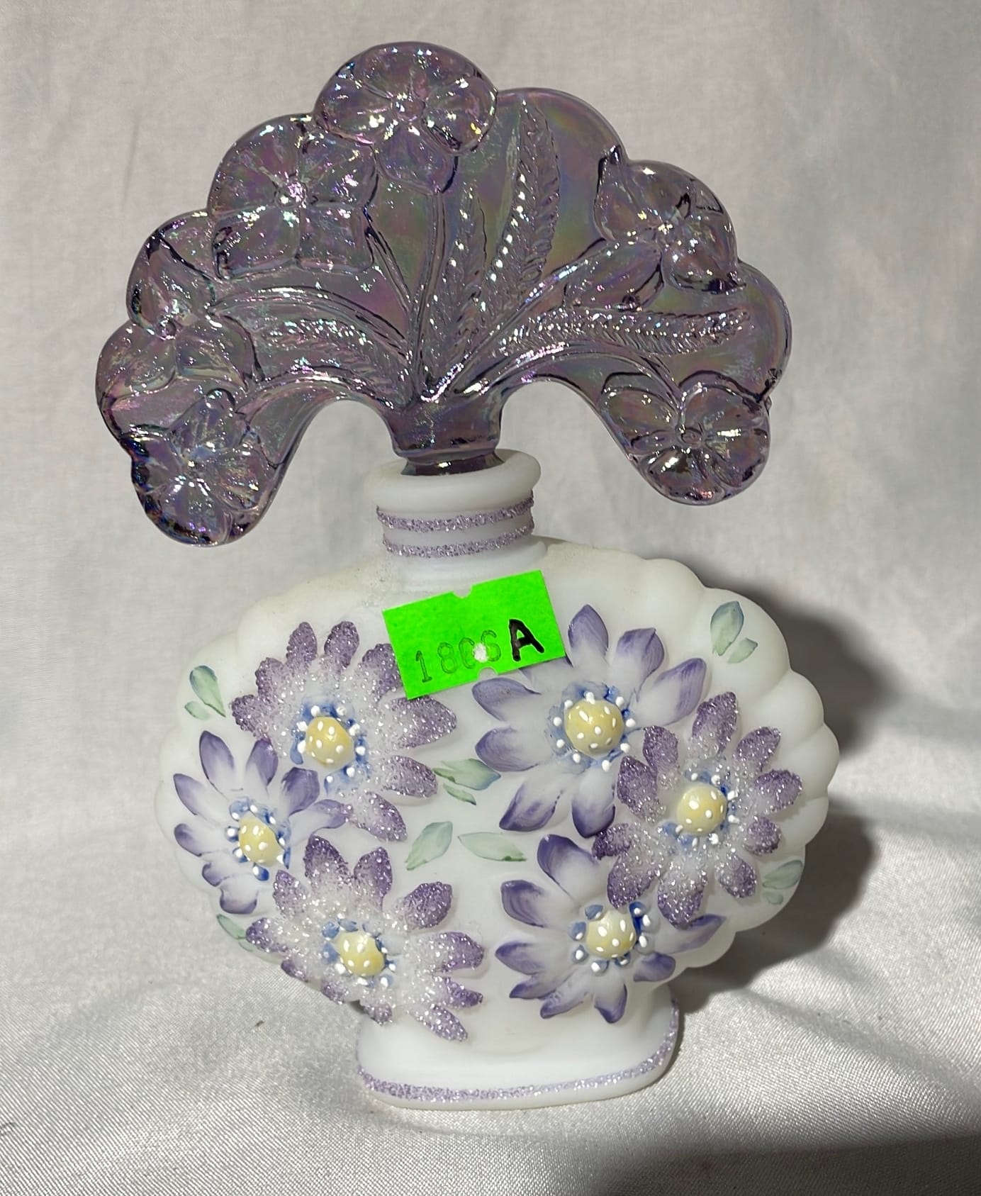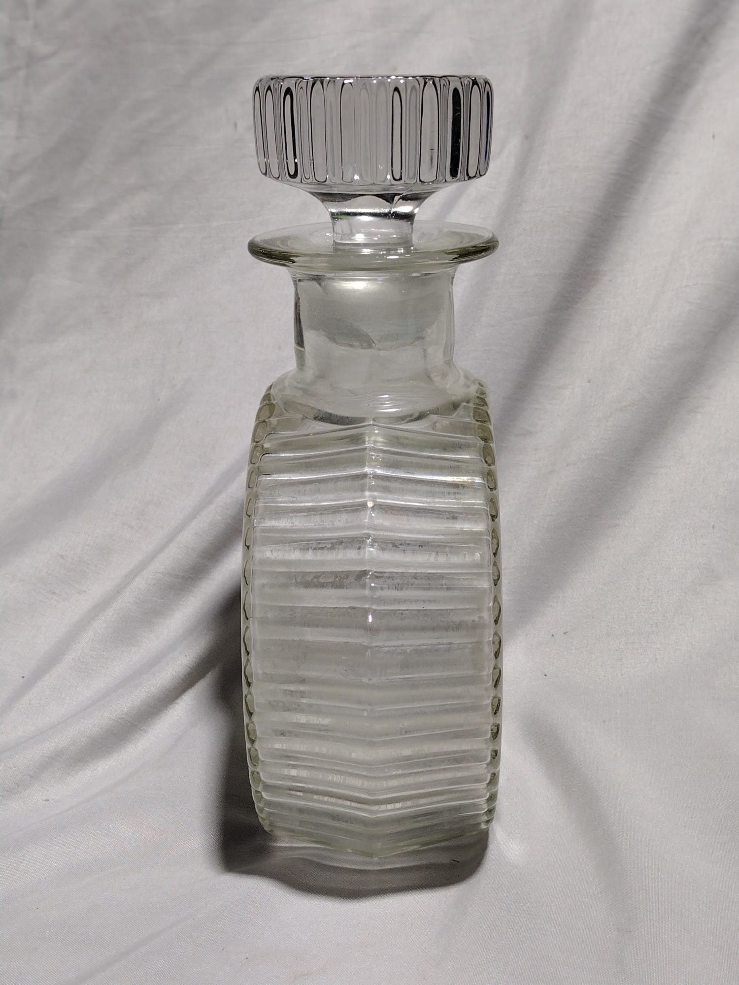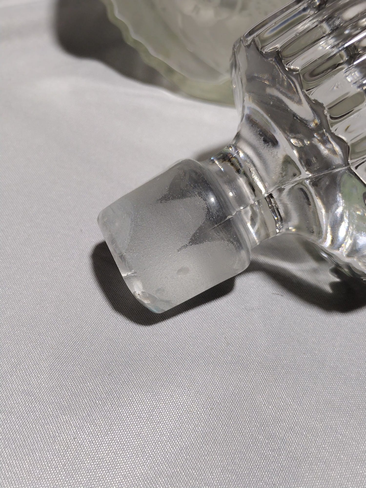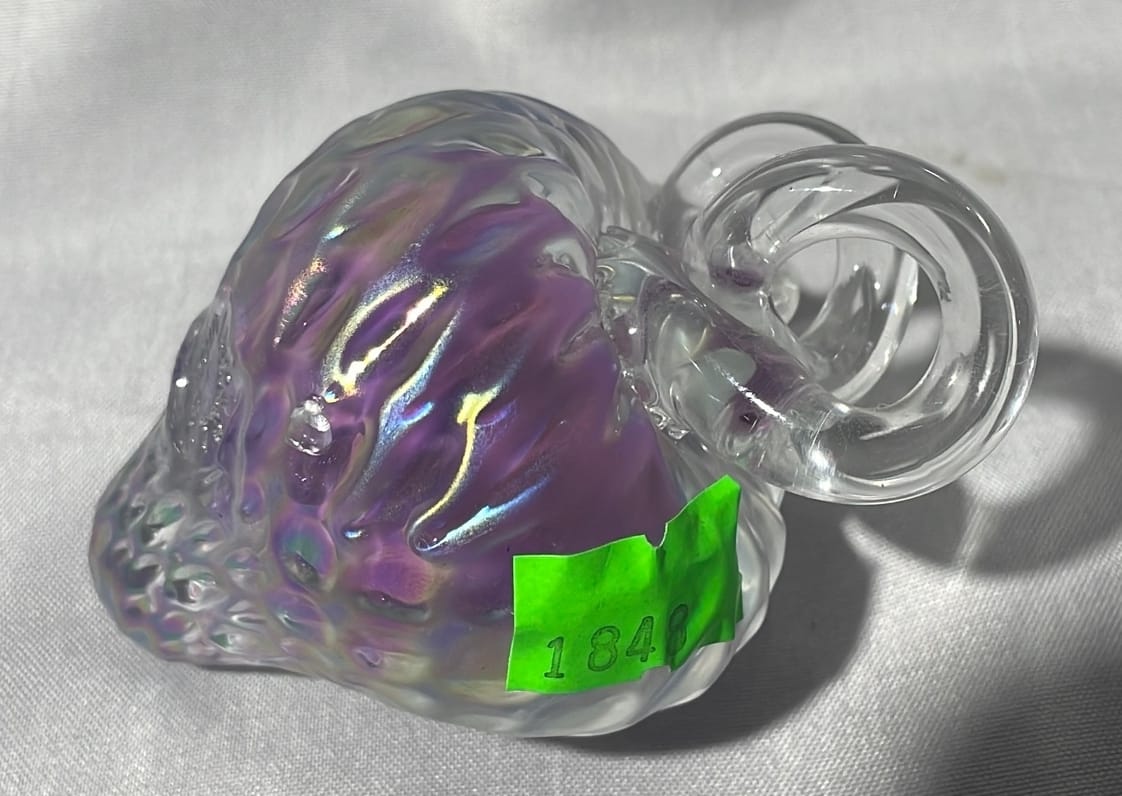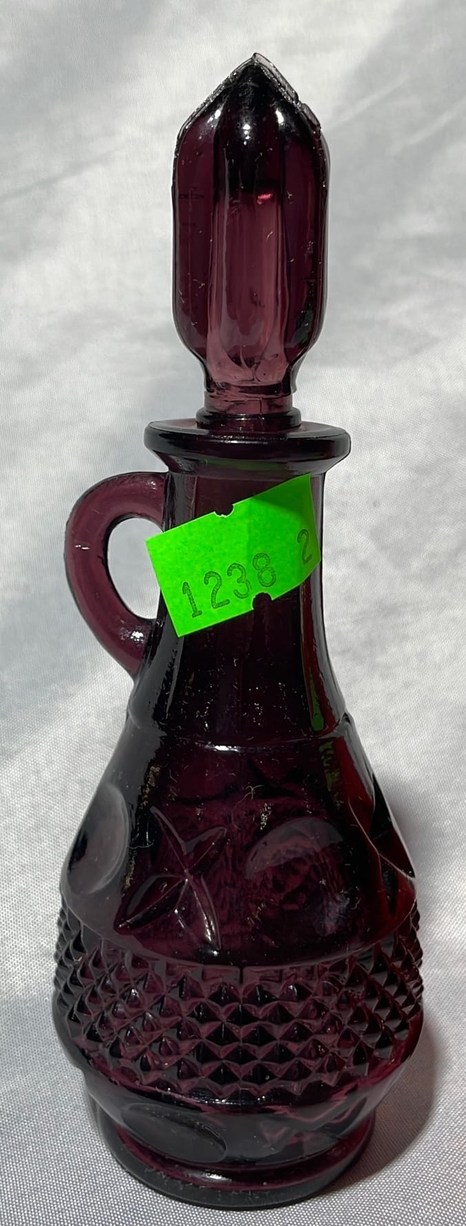 1238 Rainbow crackle glass decanter 7", purple amethyst decanter-stopper is chipped 5"