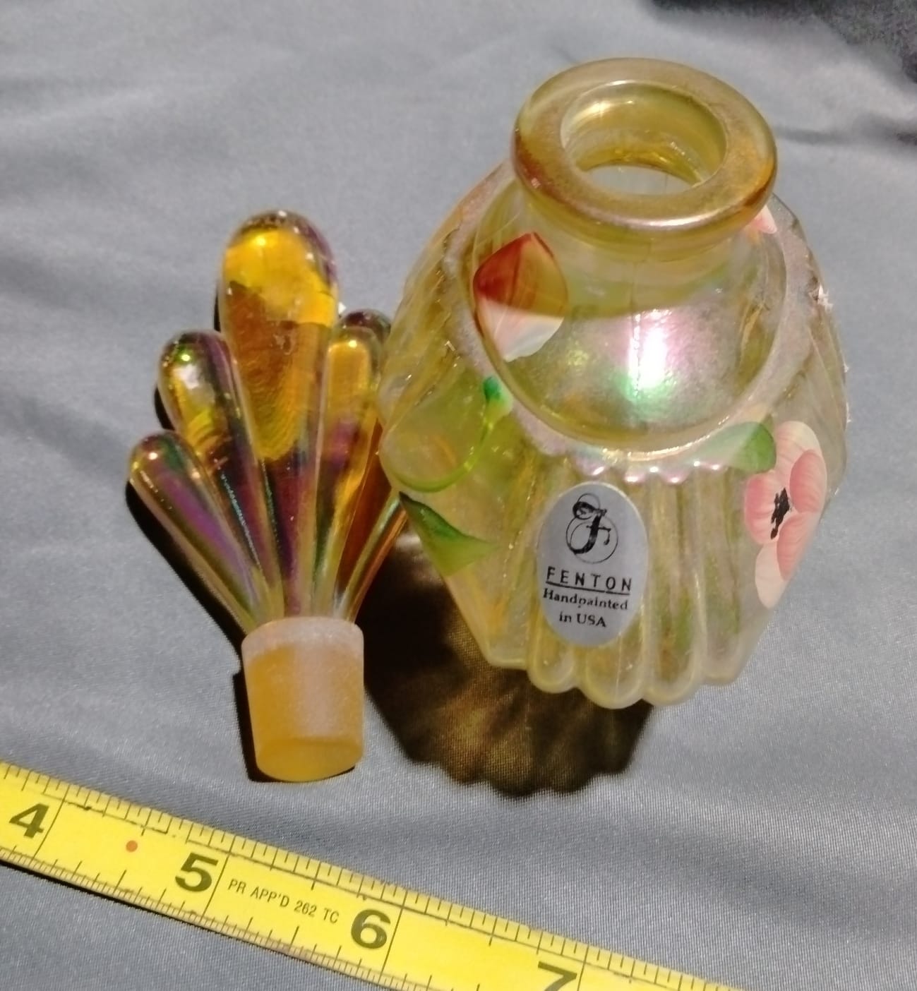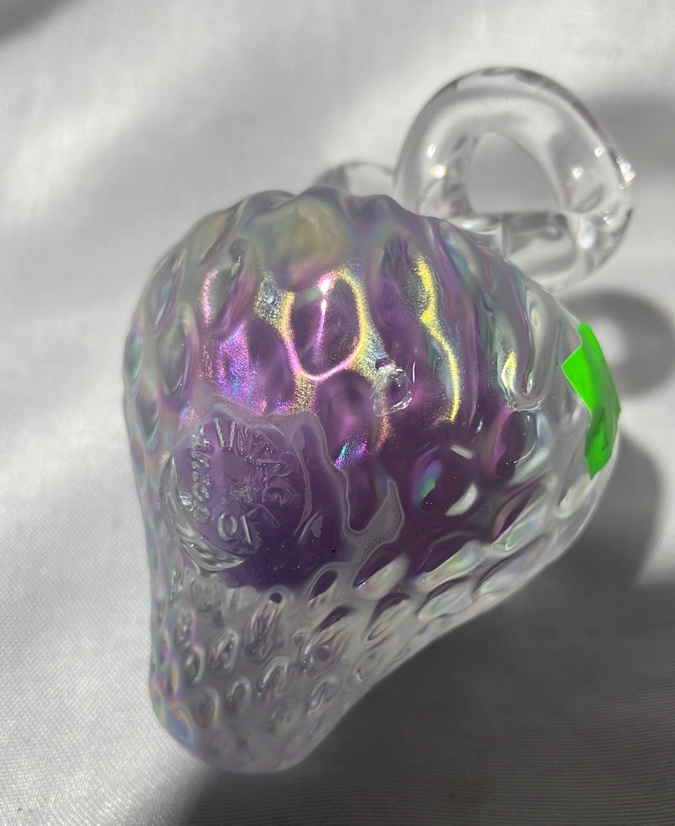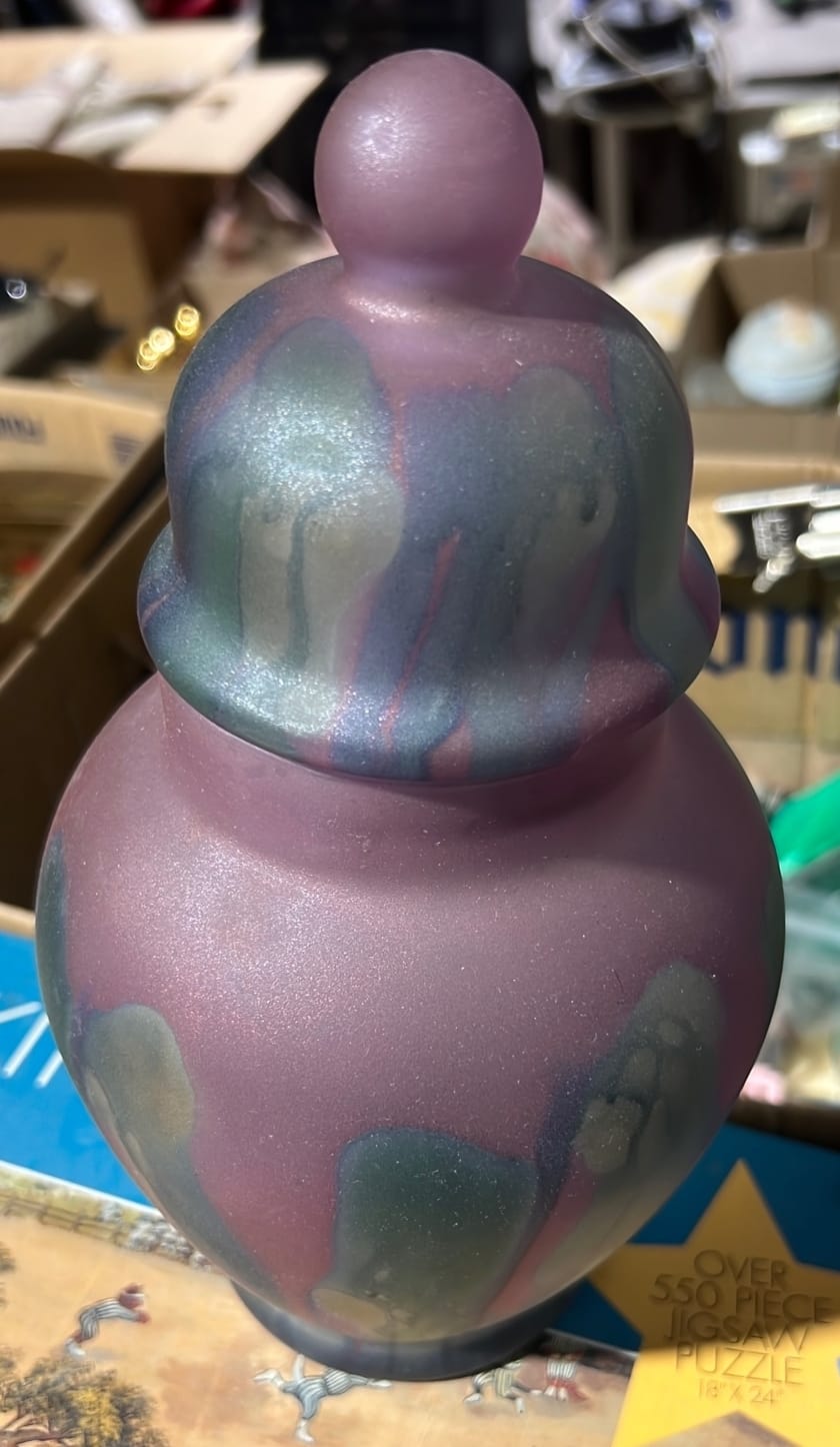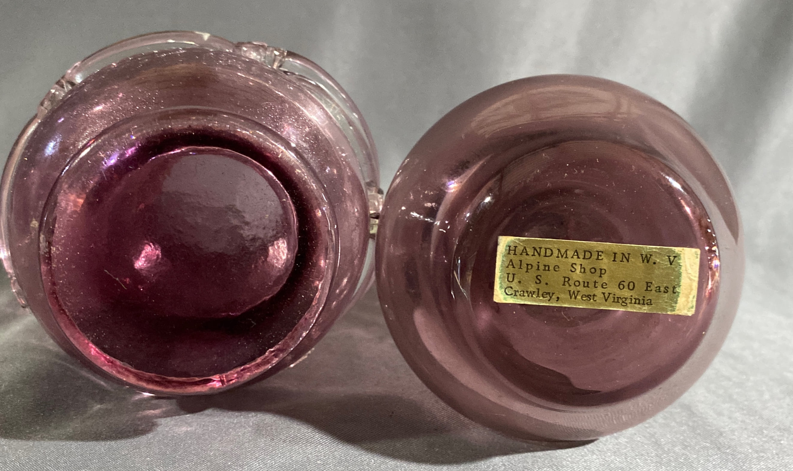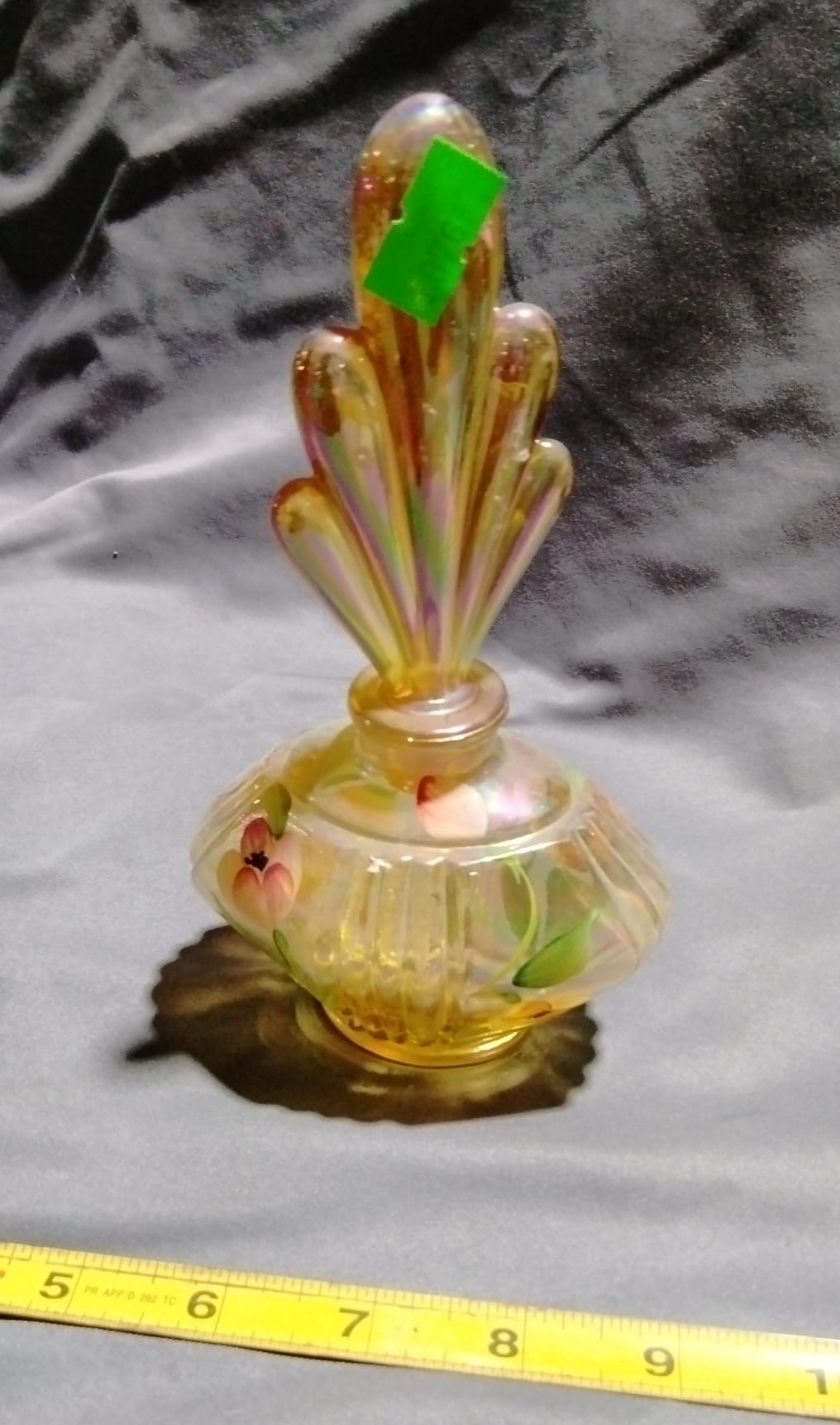 1238 Rainbow crackle glass decanter 7", purple amethyst decanter-stopper is chipped 5"