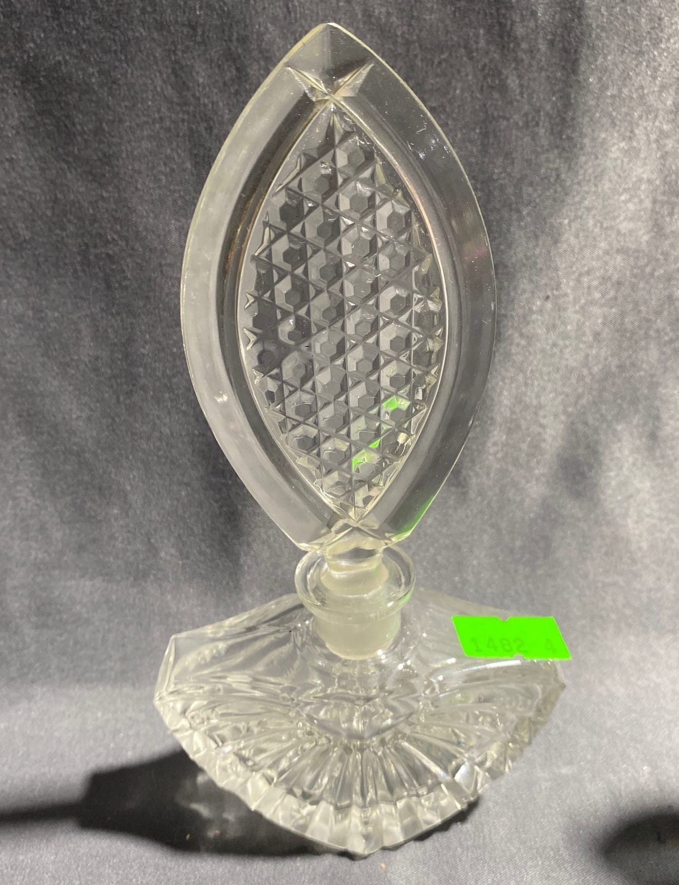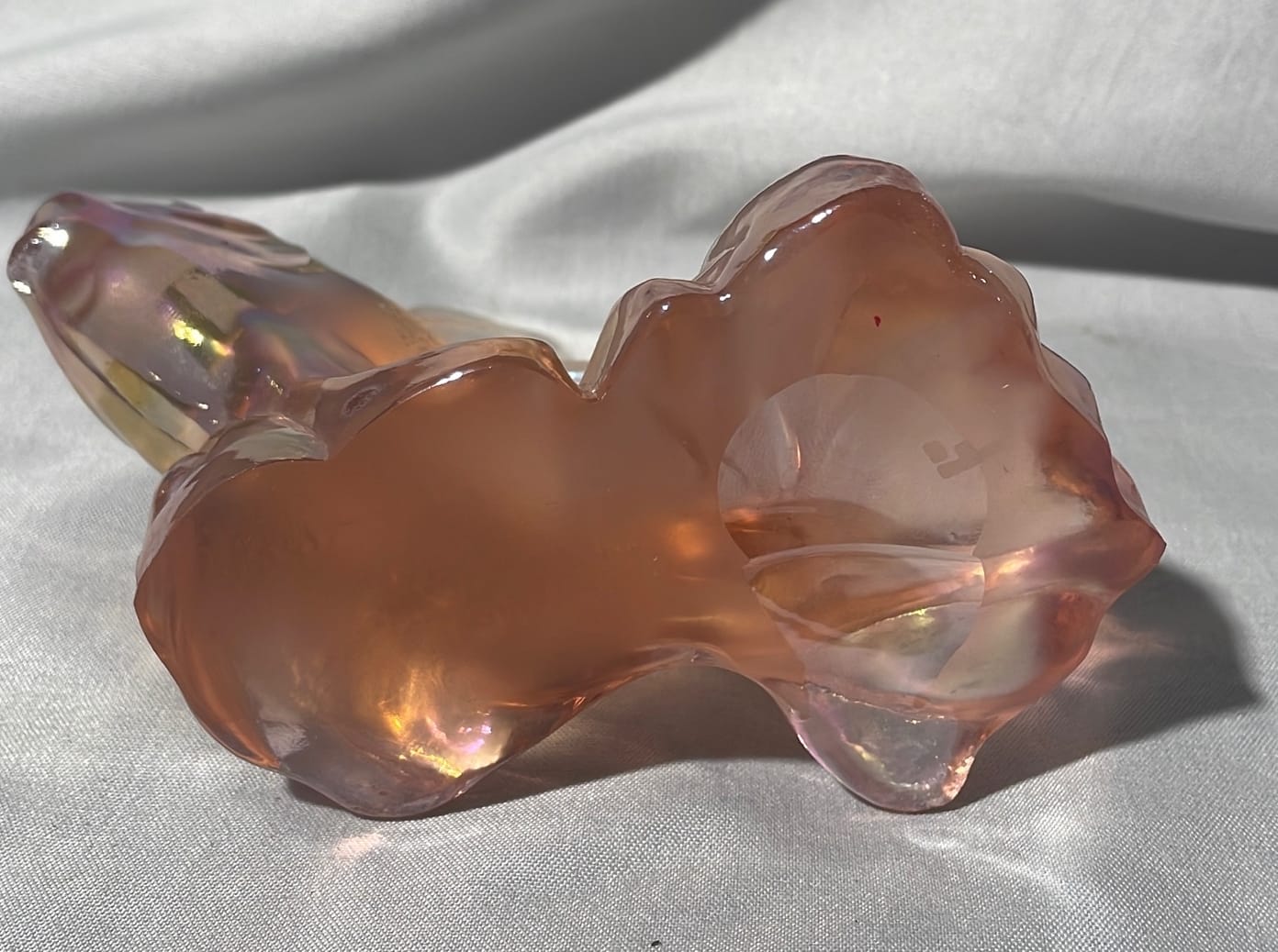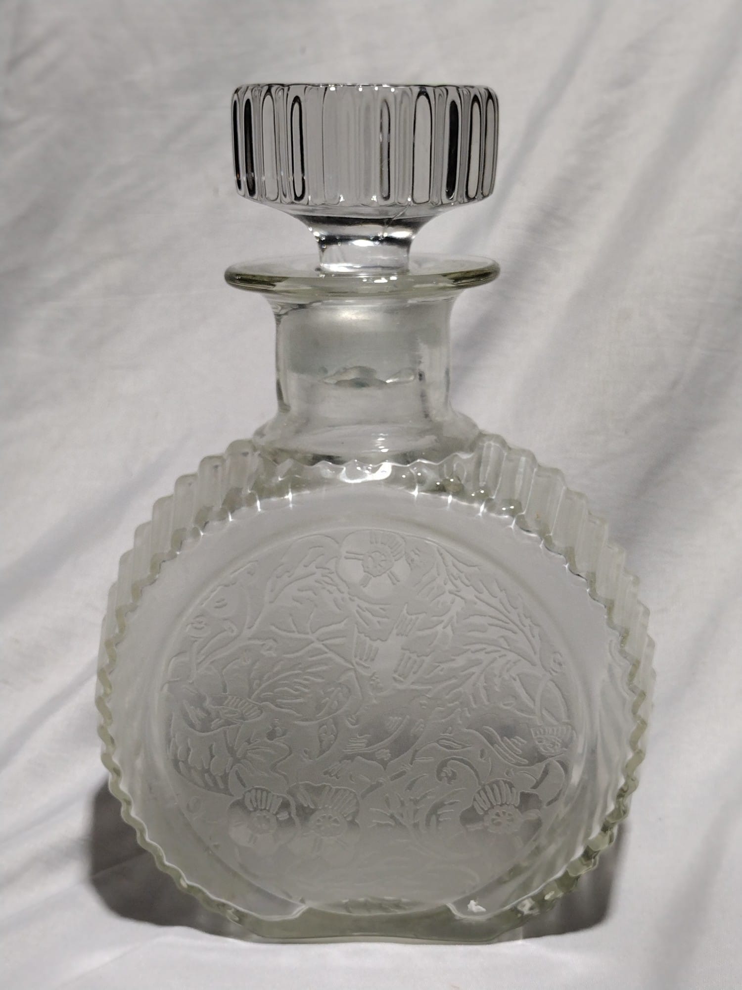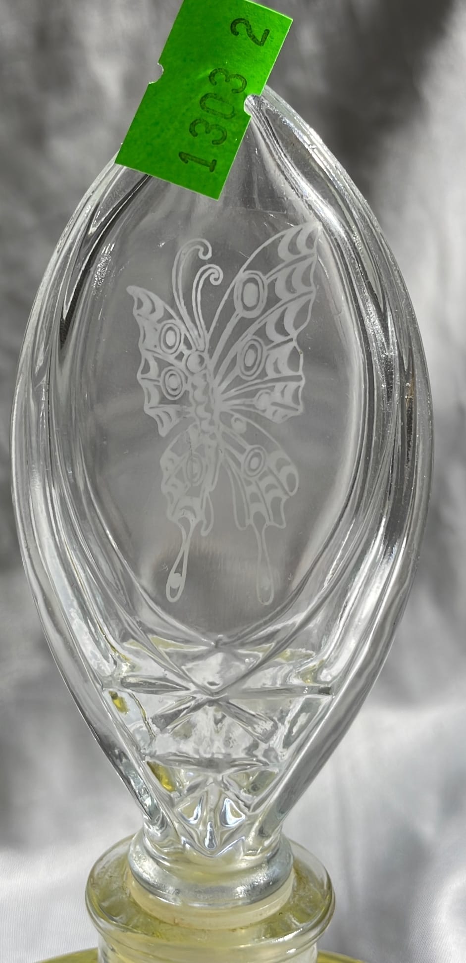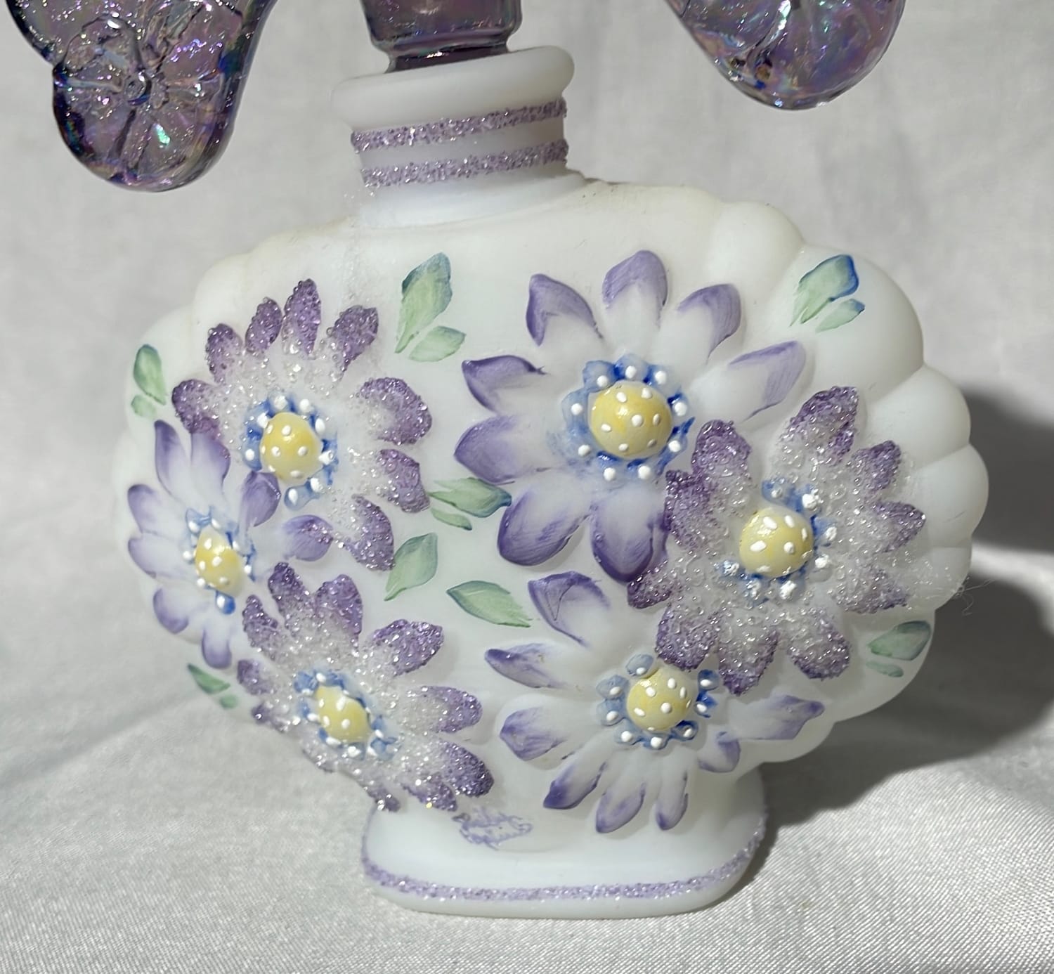 1238 Rainbow crackle glass decanter 7", purple amethyst decanter-stopper is chipped 5"