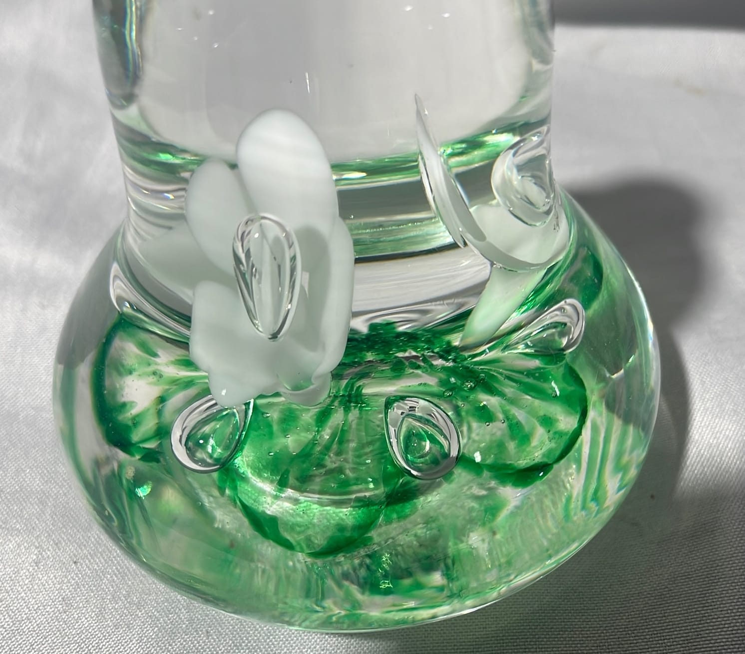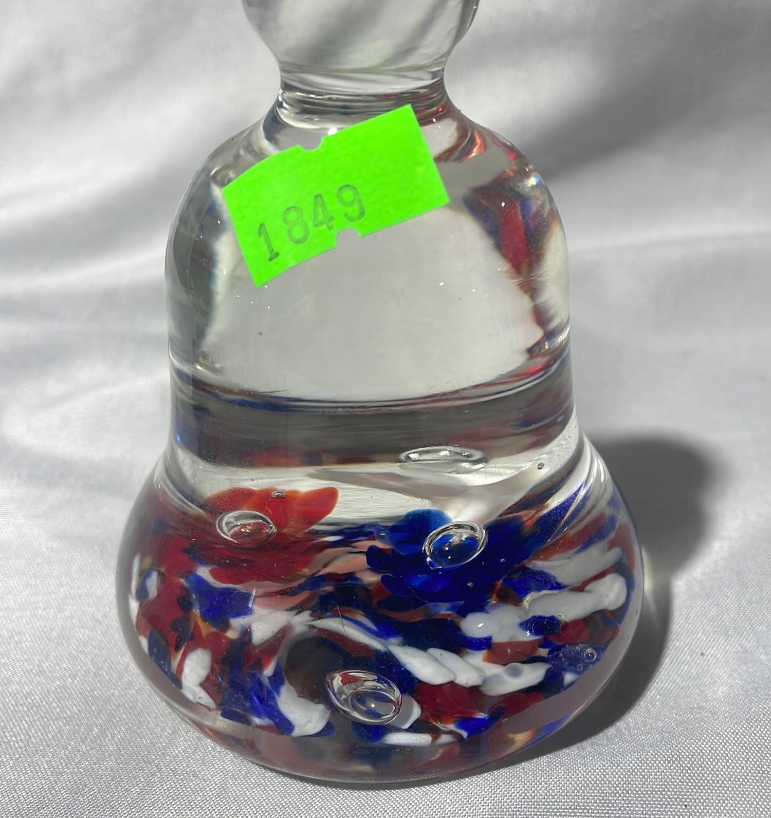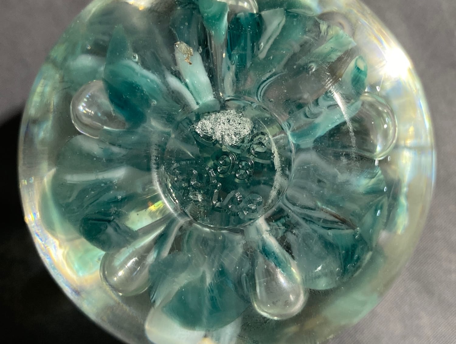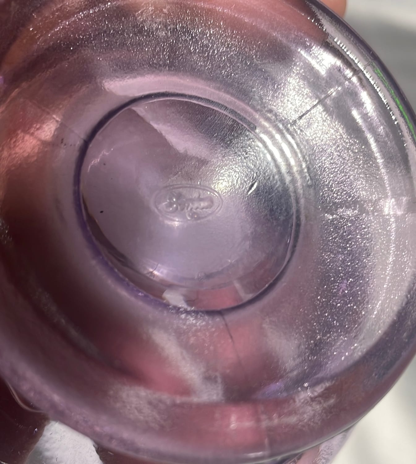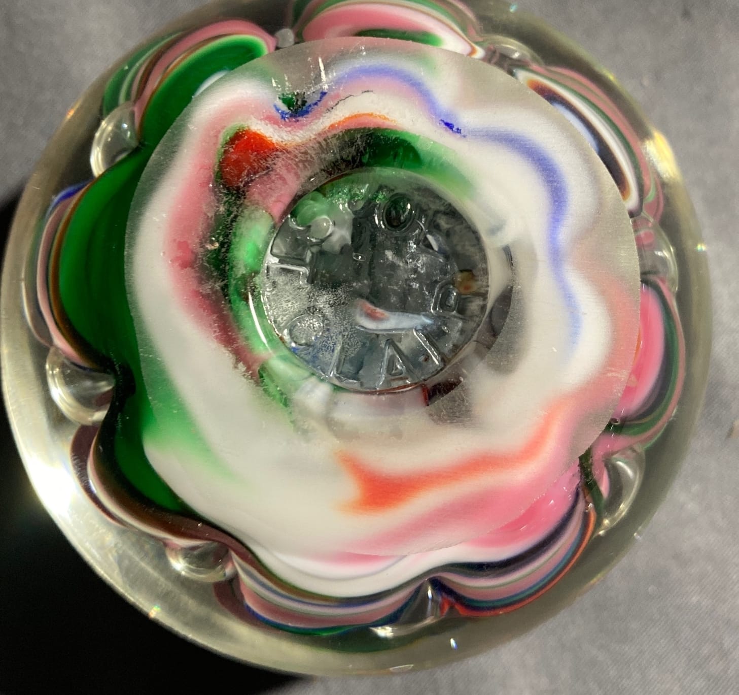1238 Rainbow crackle glass decanter 7", purple amethyst decanter-stopper is chipped 5"