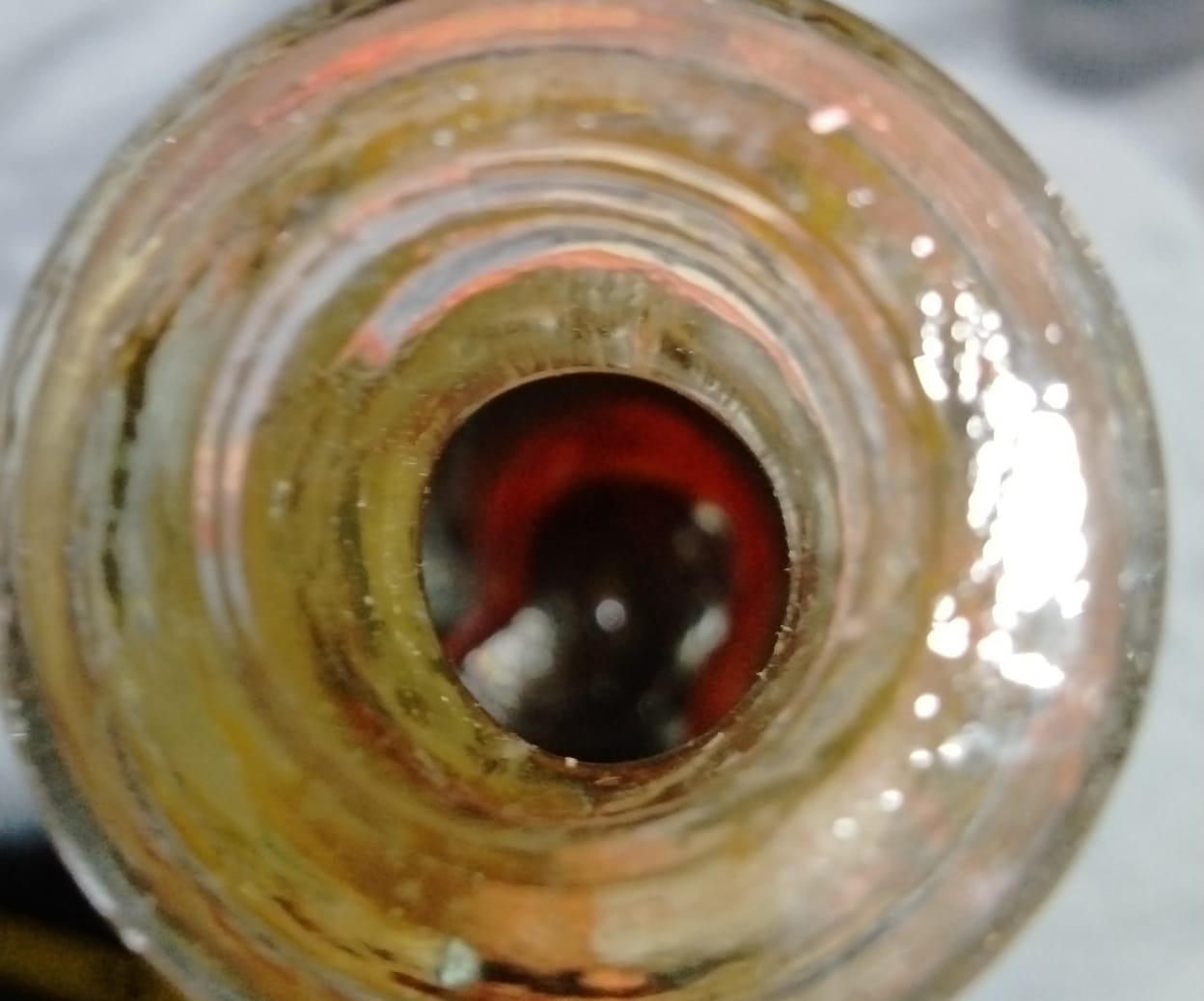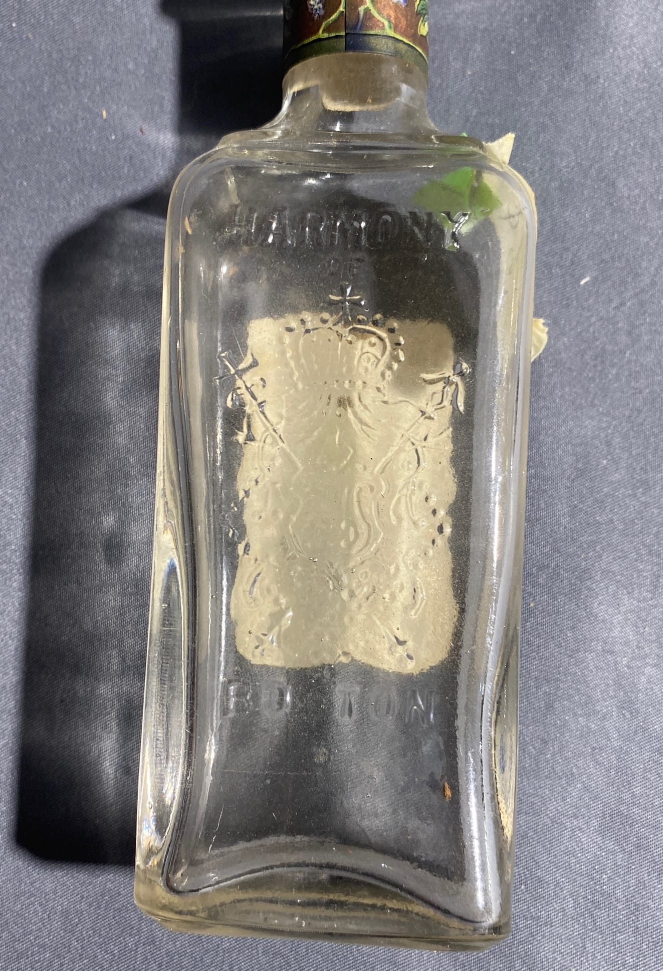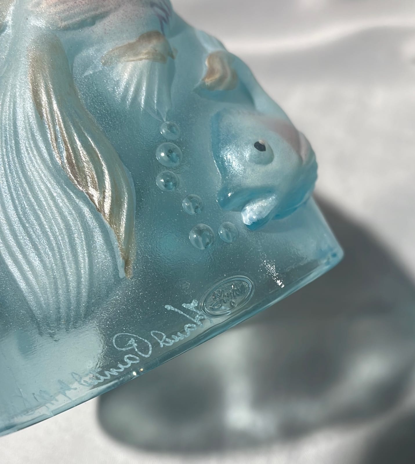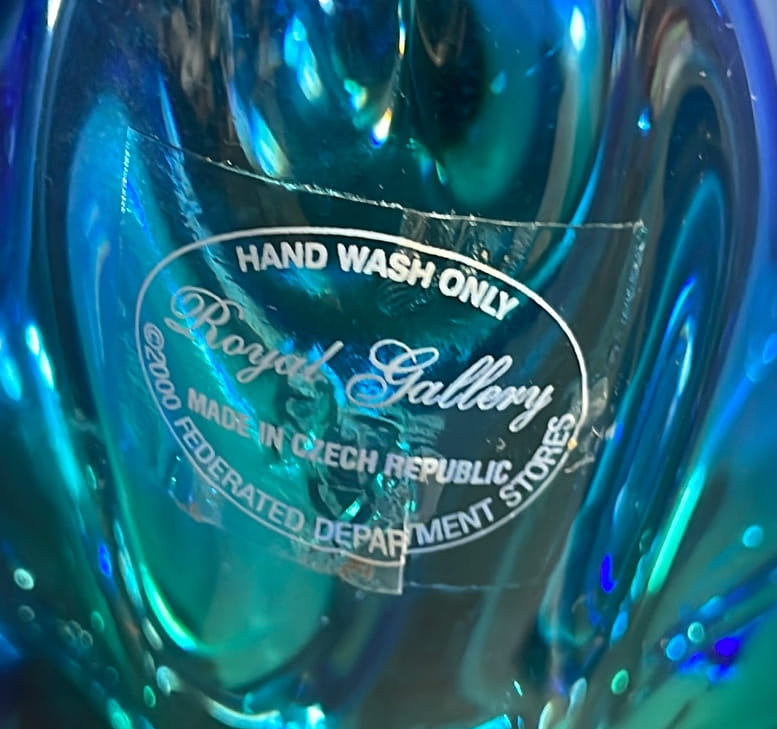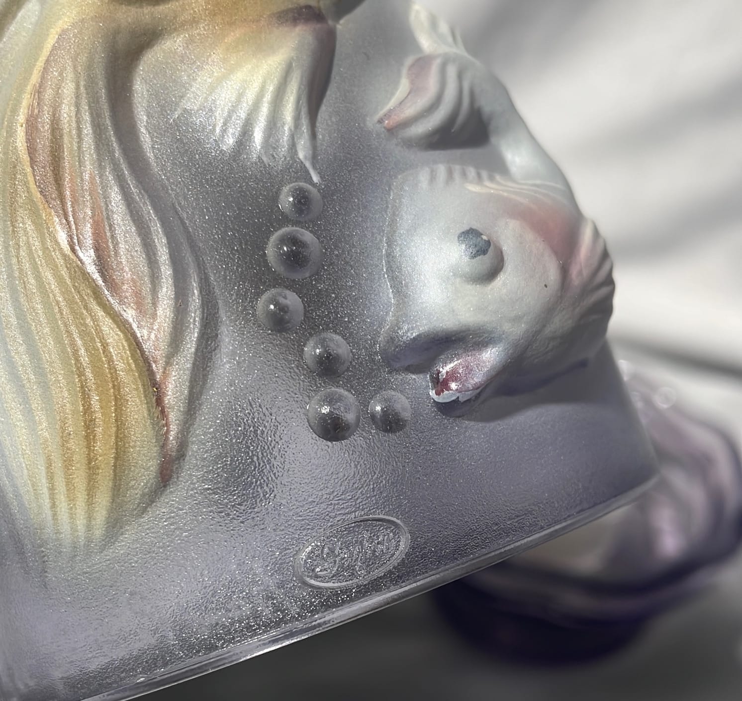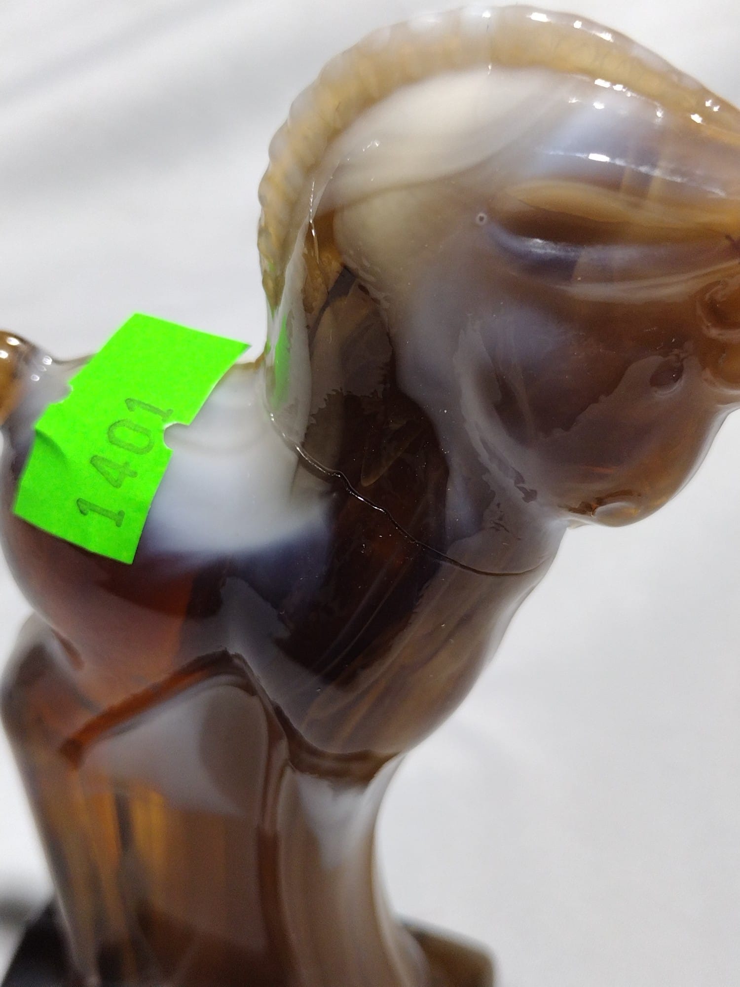 1238 Rainbow crackle glass decanter 7", purple amethyst decanter-stopper is chipped 5"