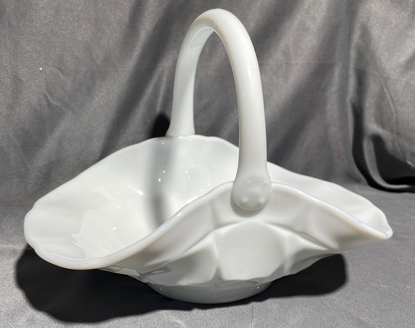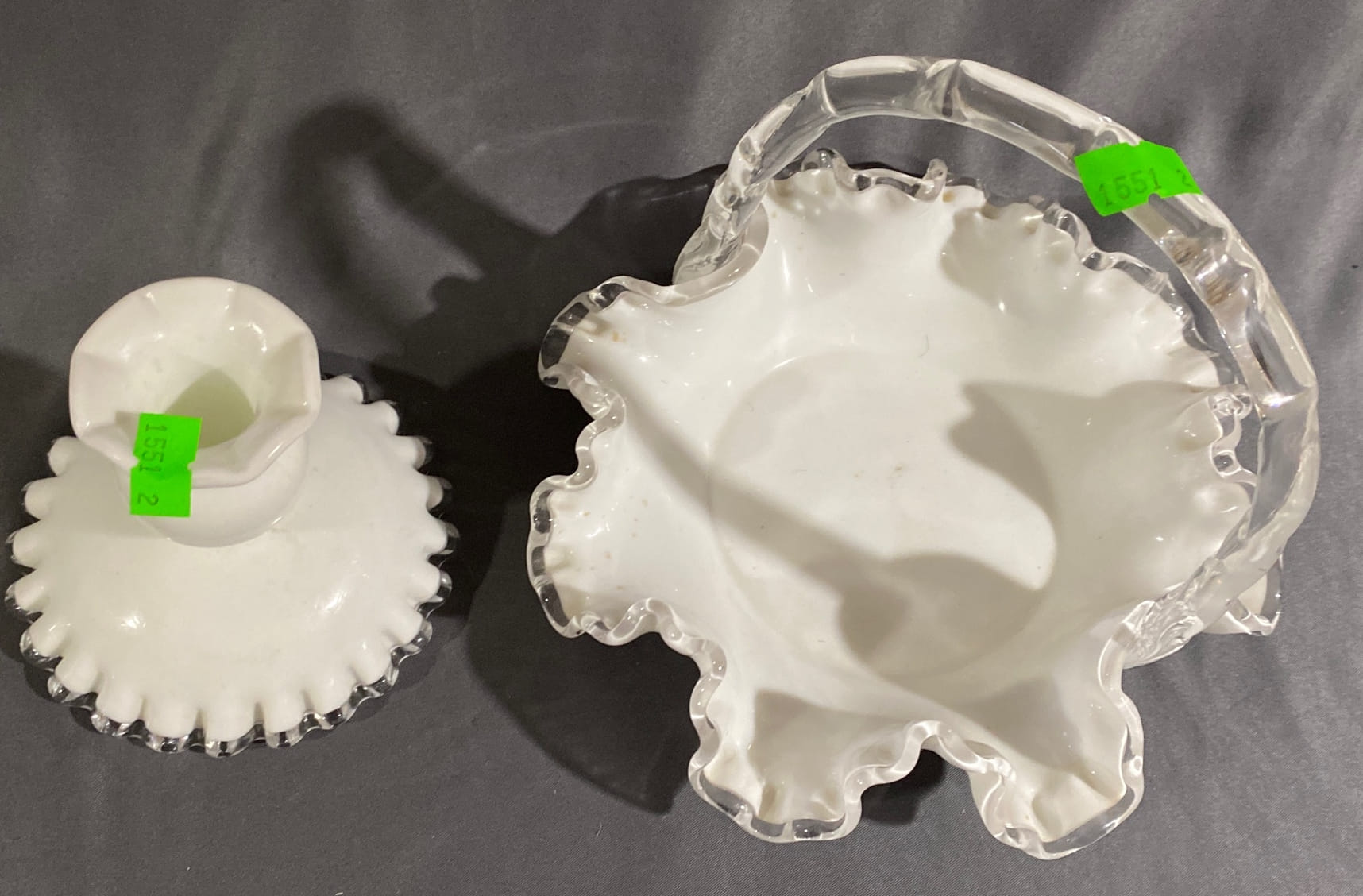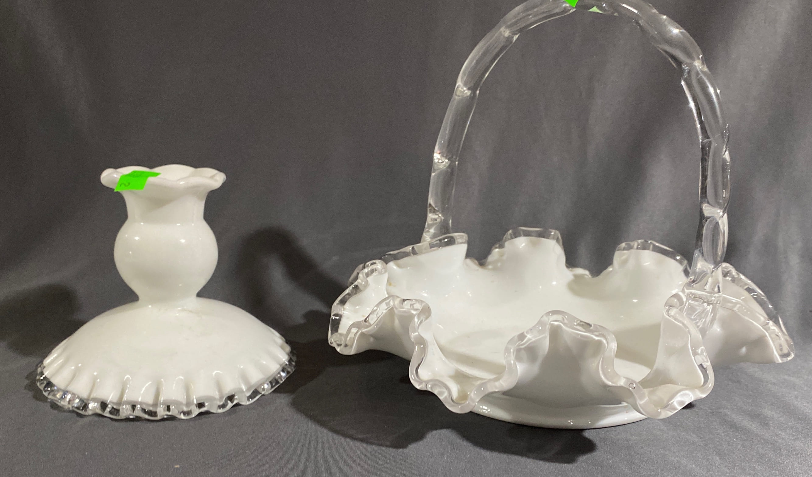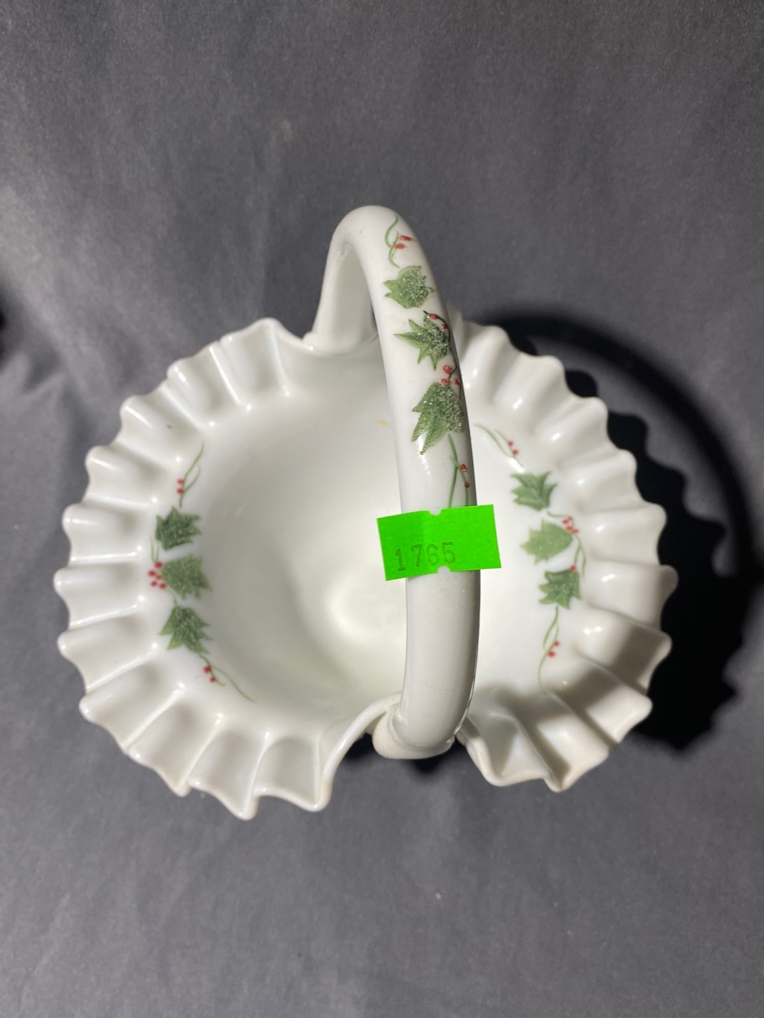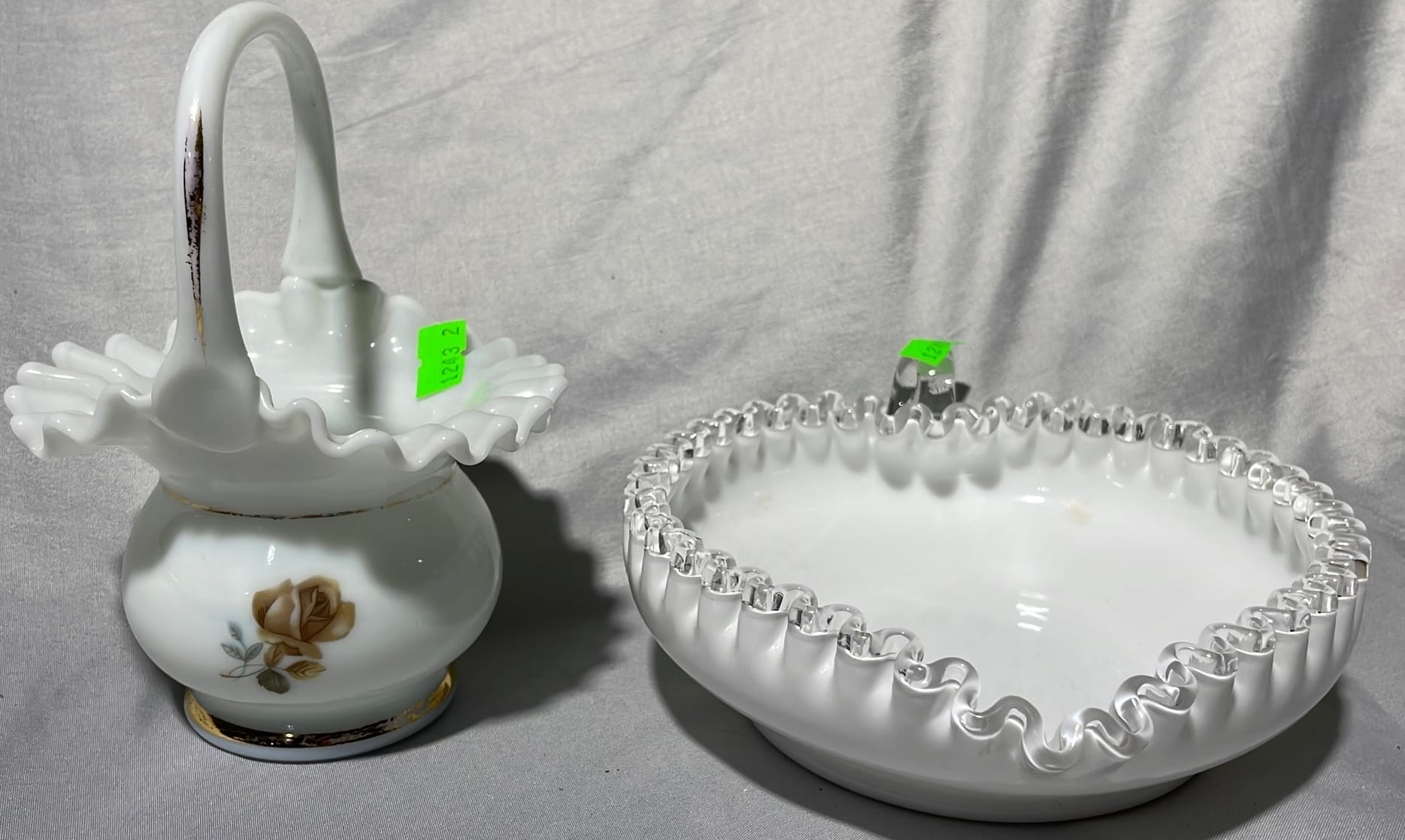 1243 Milk glass basket 4"x7", Fenton silver crest leaf dish 8"