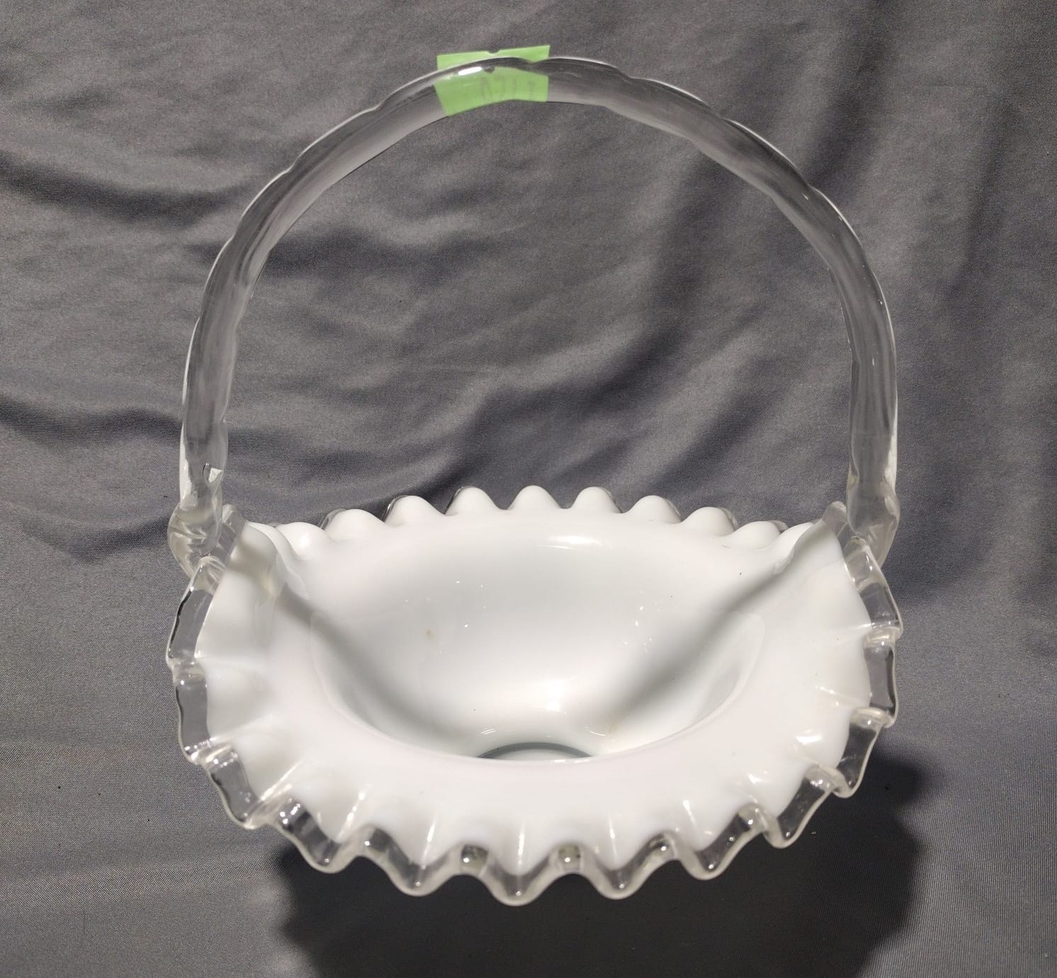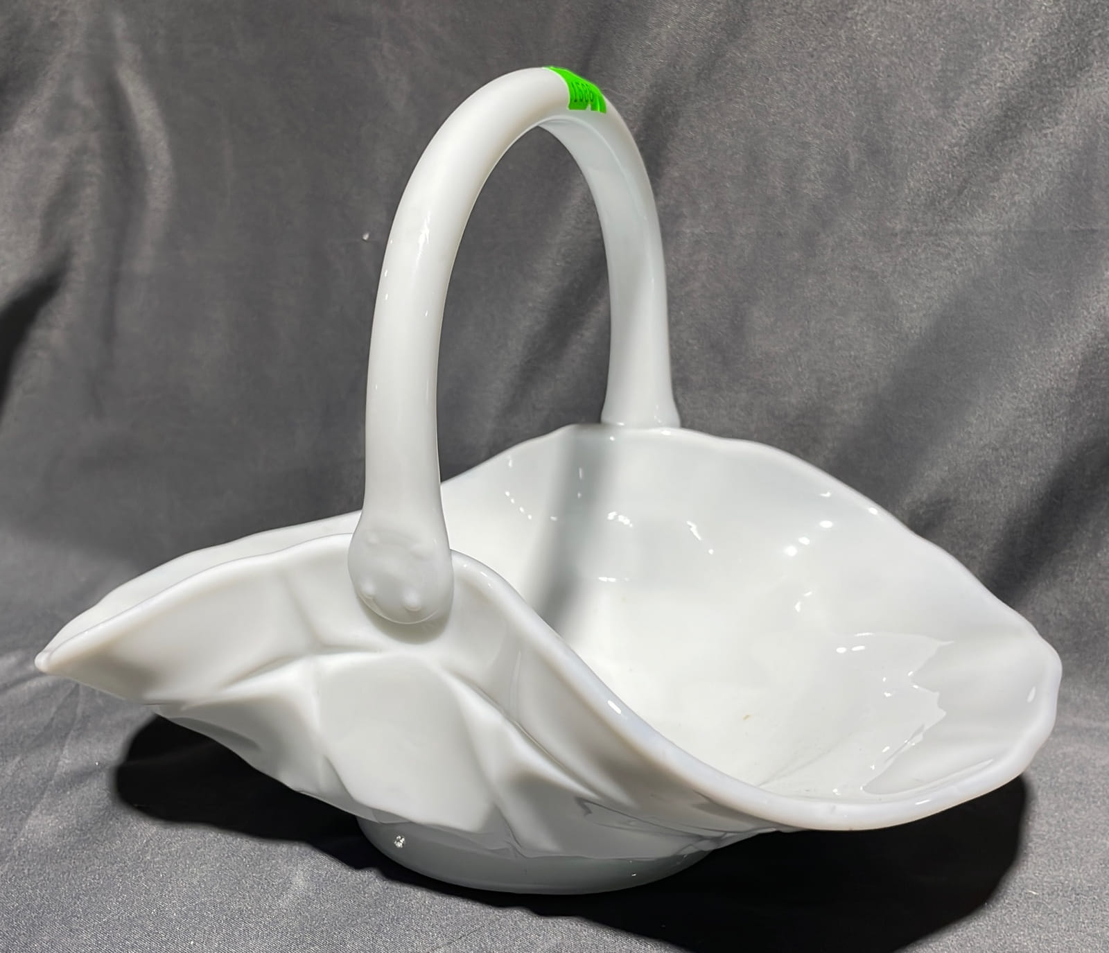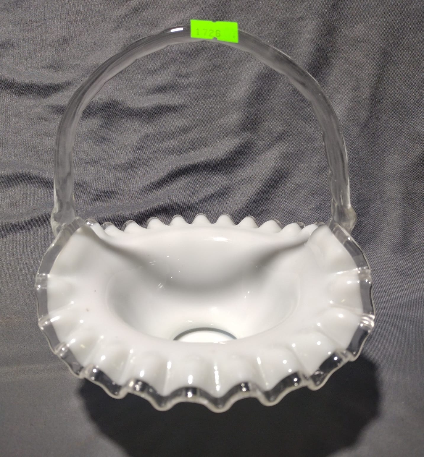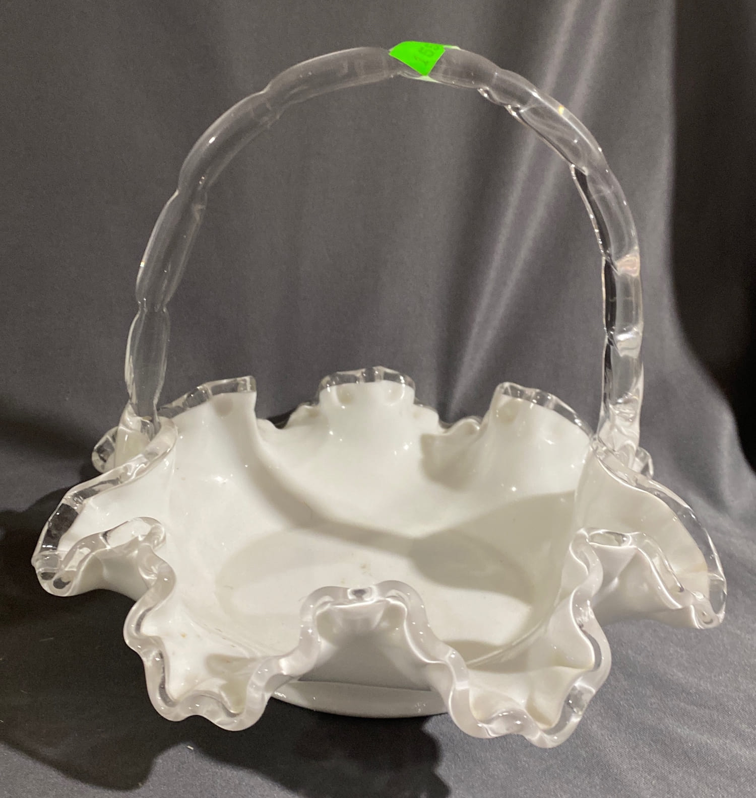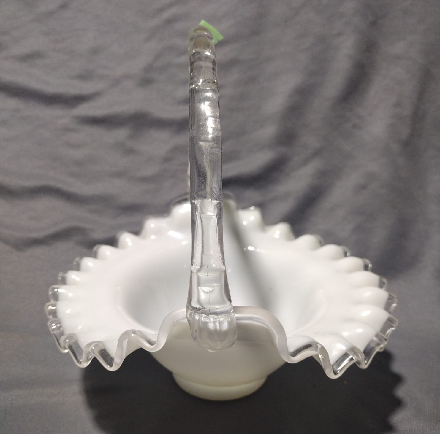 1243 Milk glass basket 4"x7", Fenton silver crest leaf dish 8"