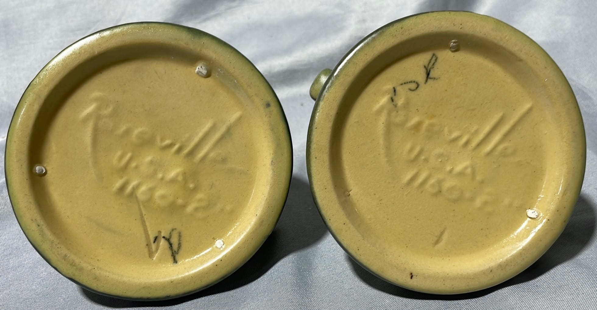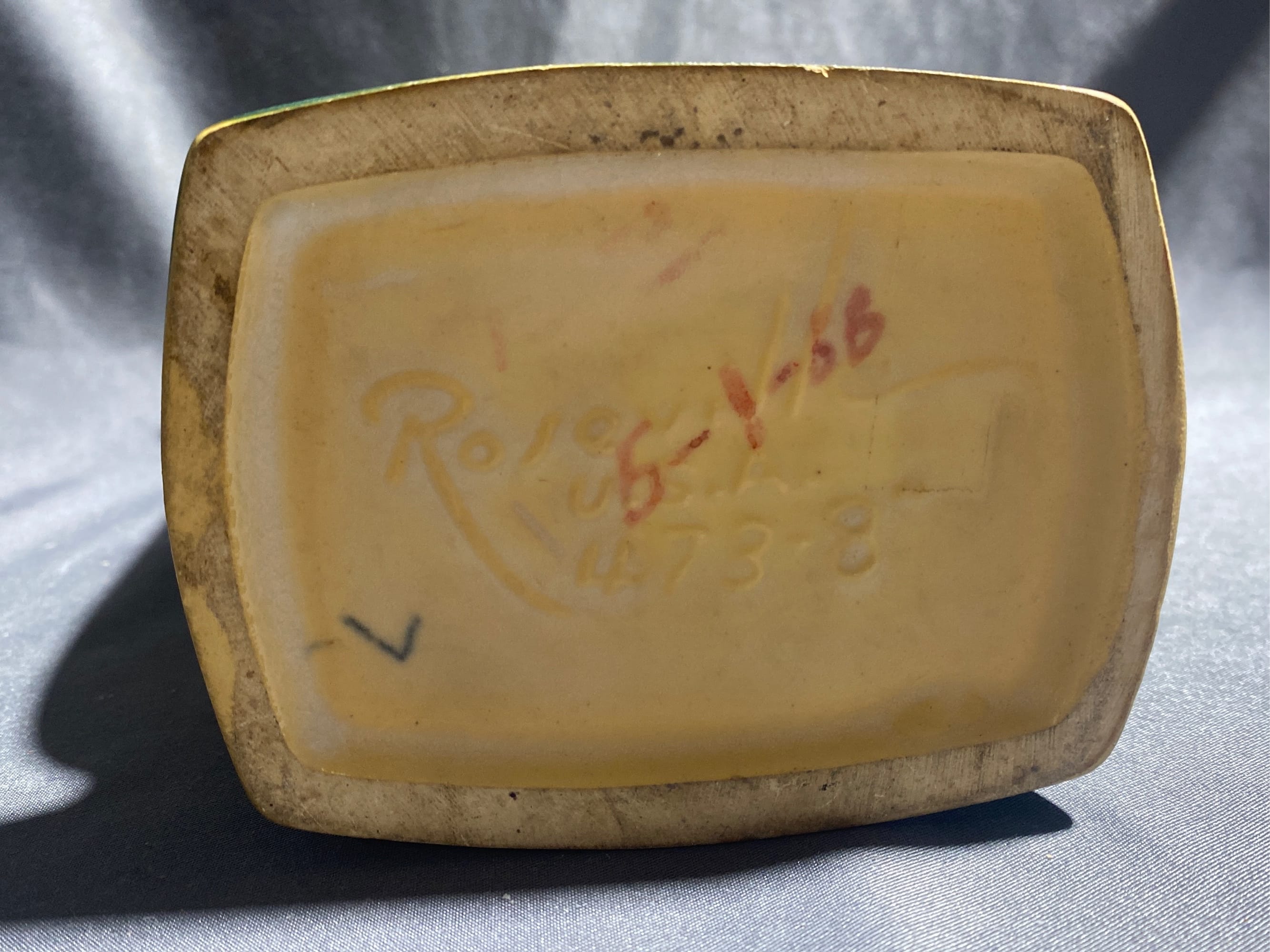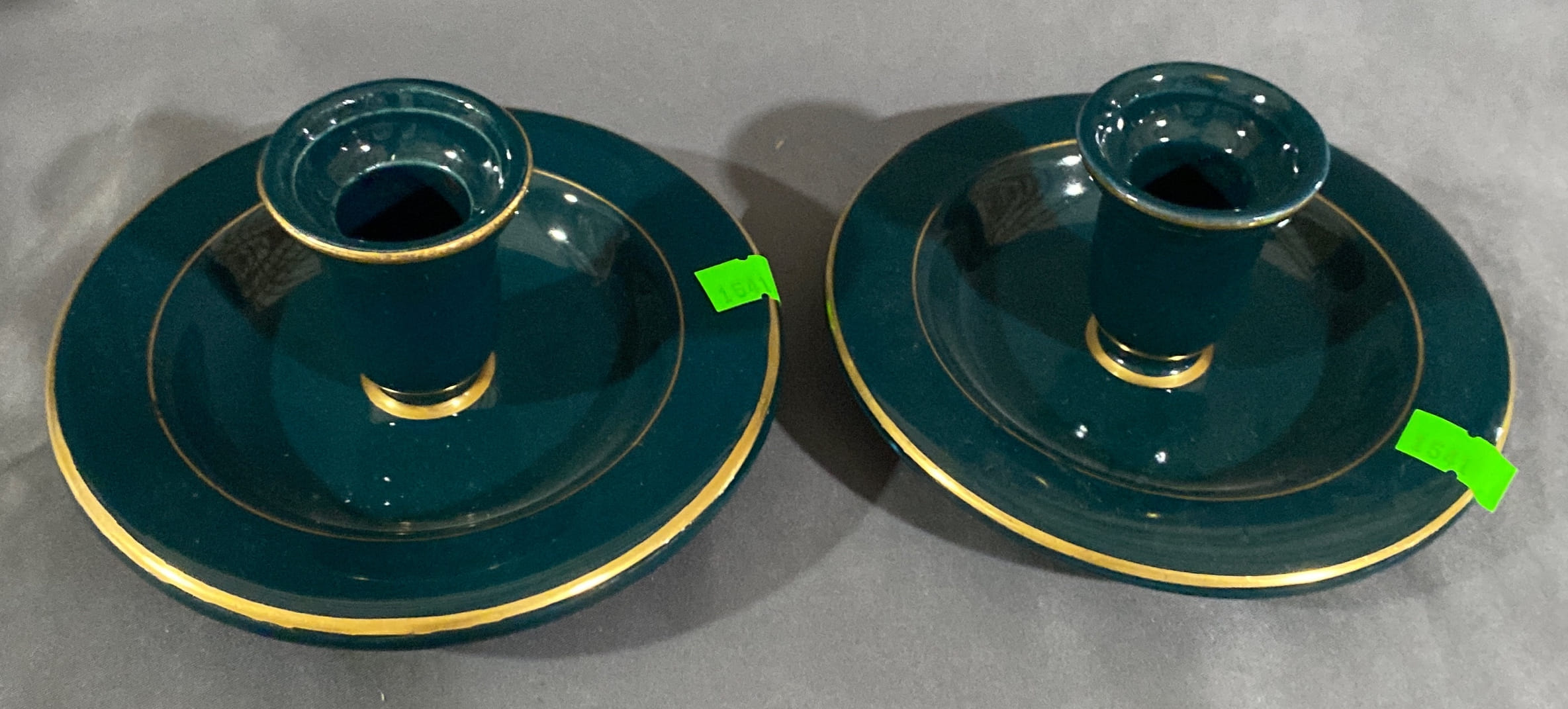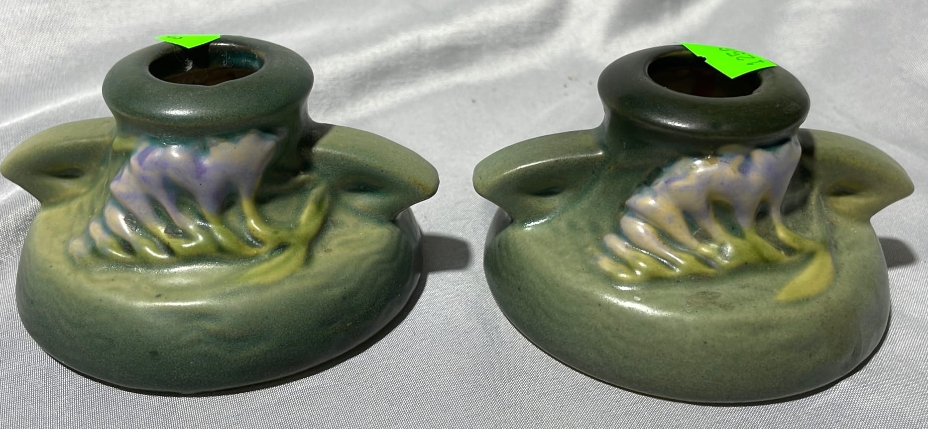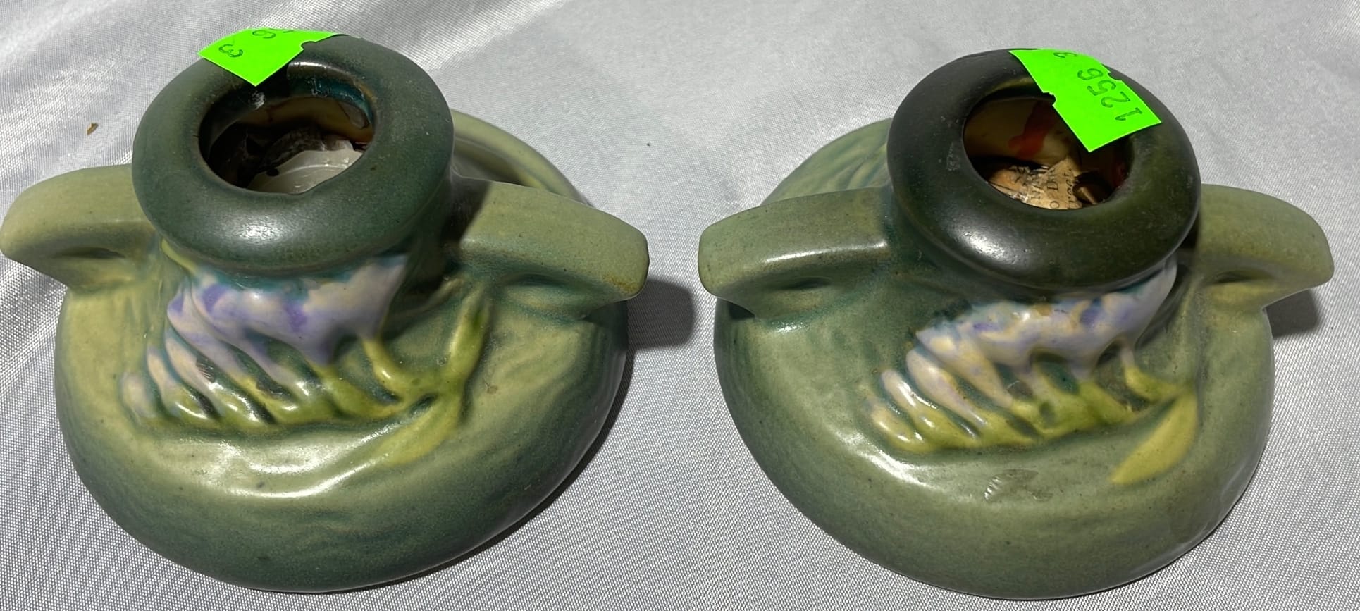 1256 Roseville ceramic candlestick holders 2"x4", Roseville planter 2"x9"