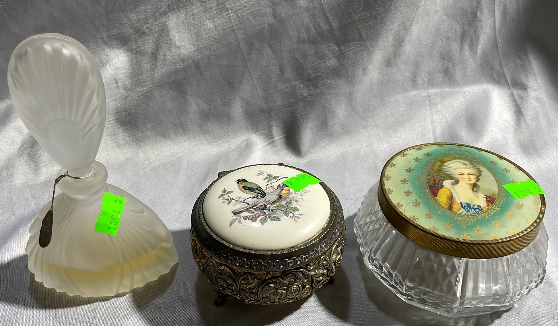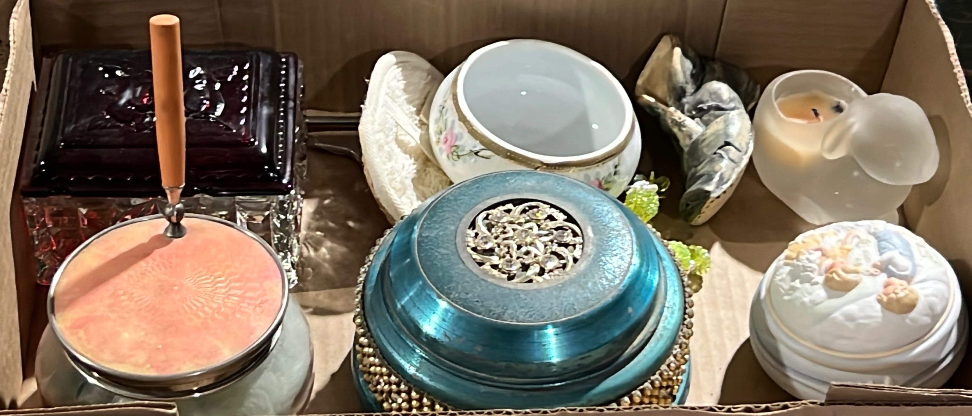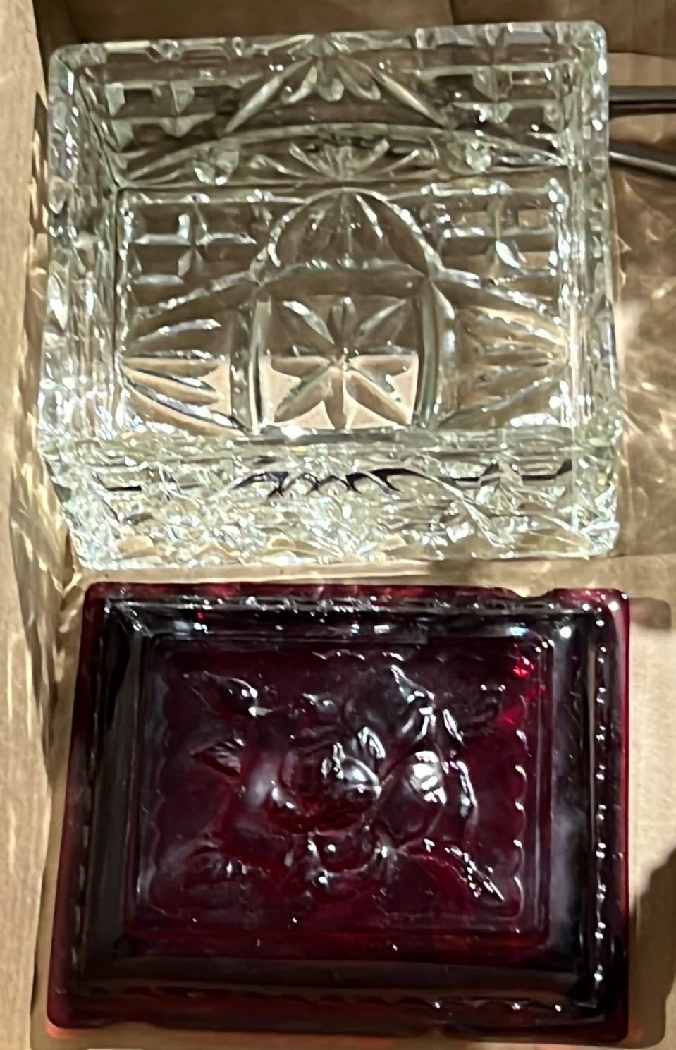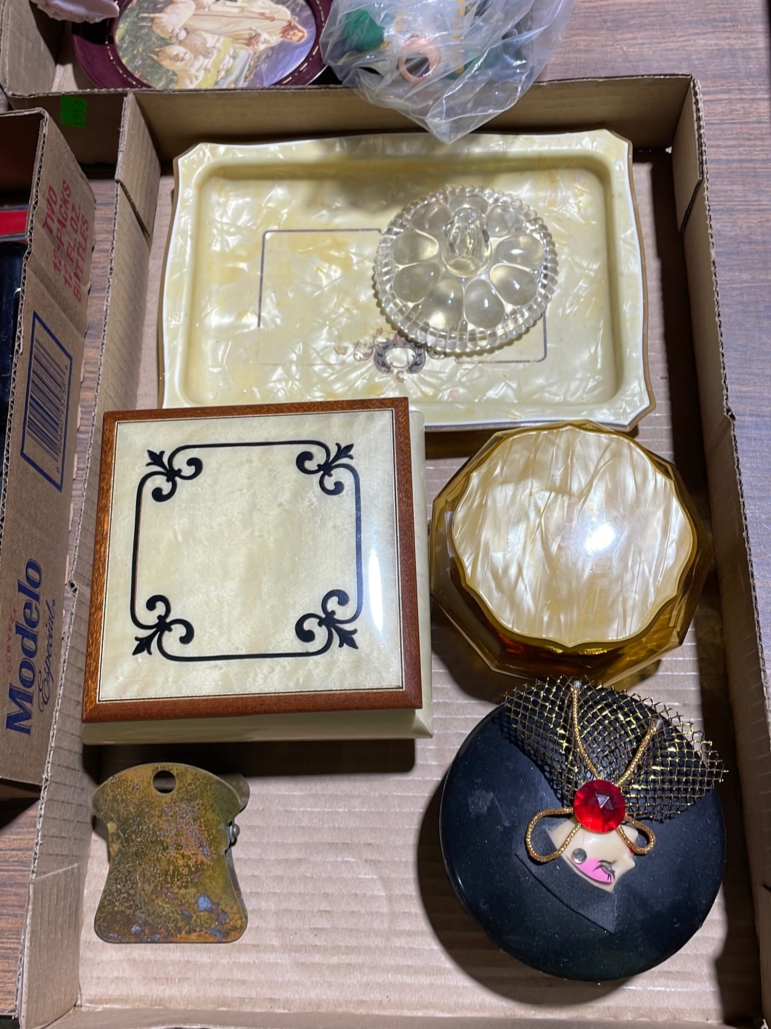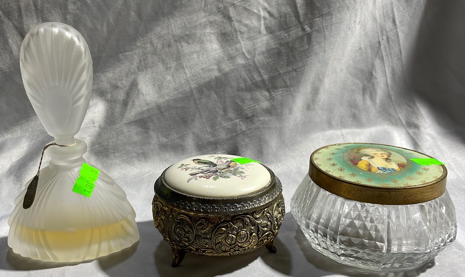 2010 Vintage metal music box ,5.5”, Avon porcelain covered music box , vintage powder jar , clear and ruby glass covered dish , frosted glass rabbit candle holder ,miscellaneous