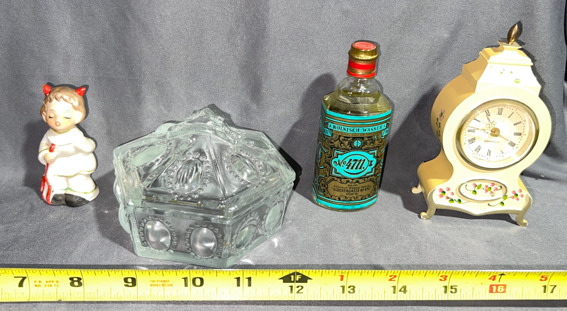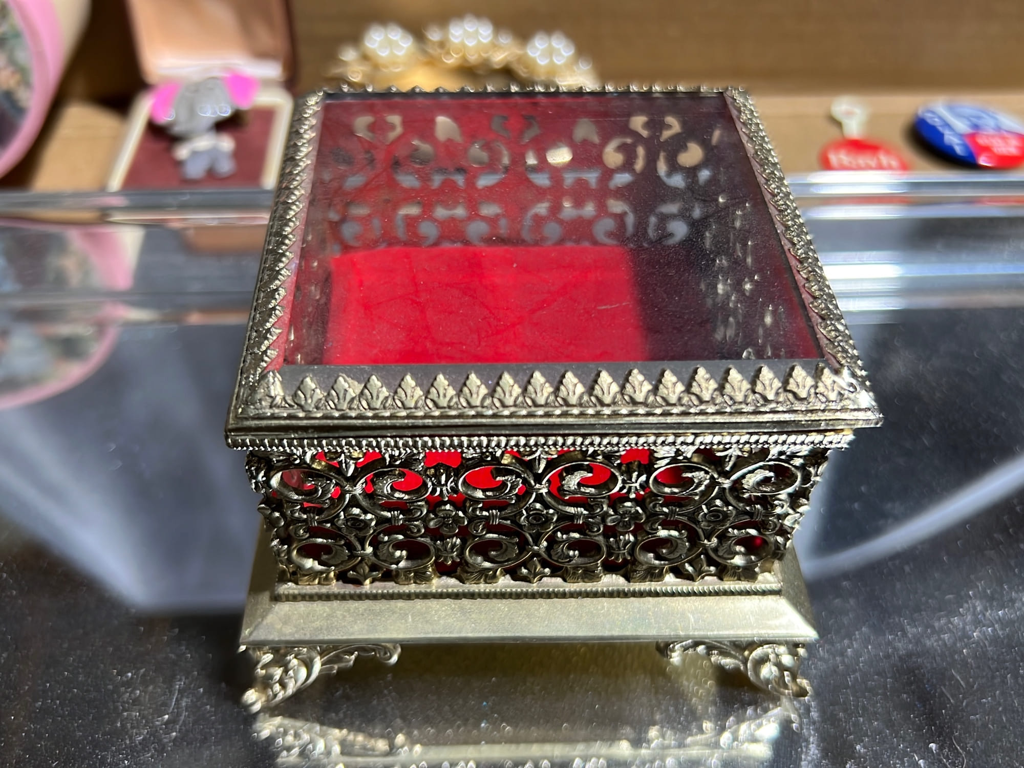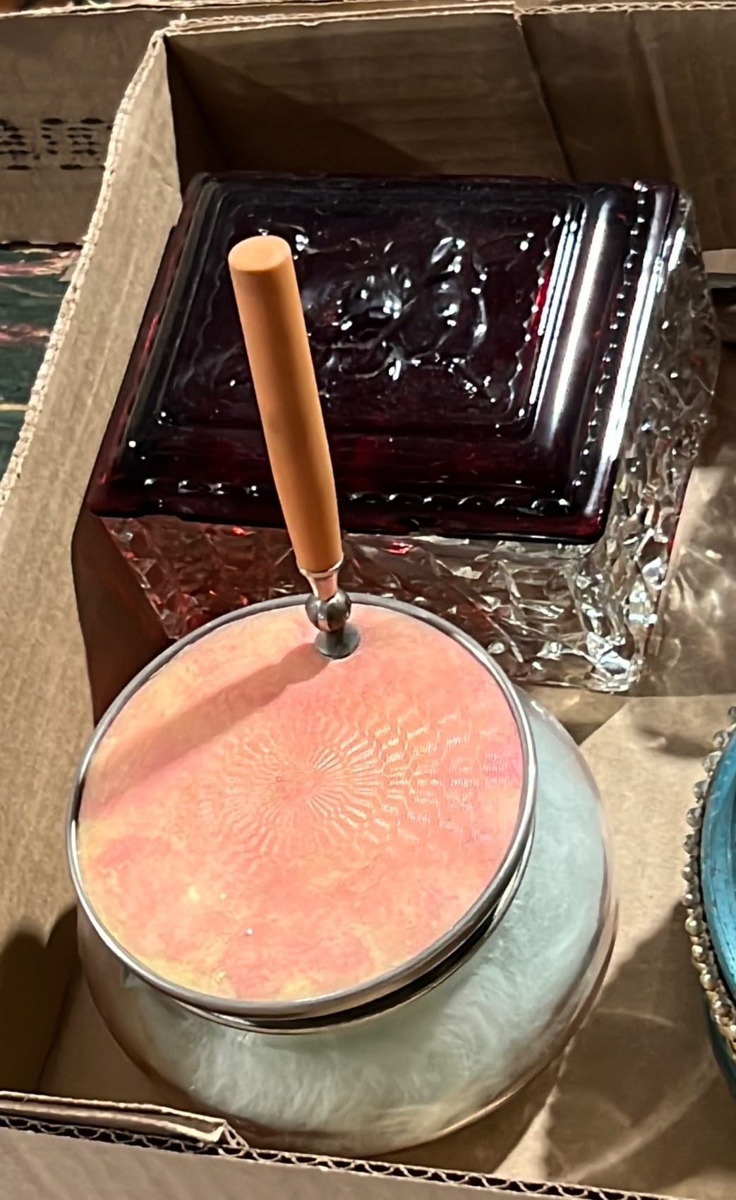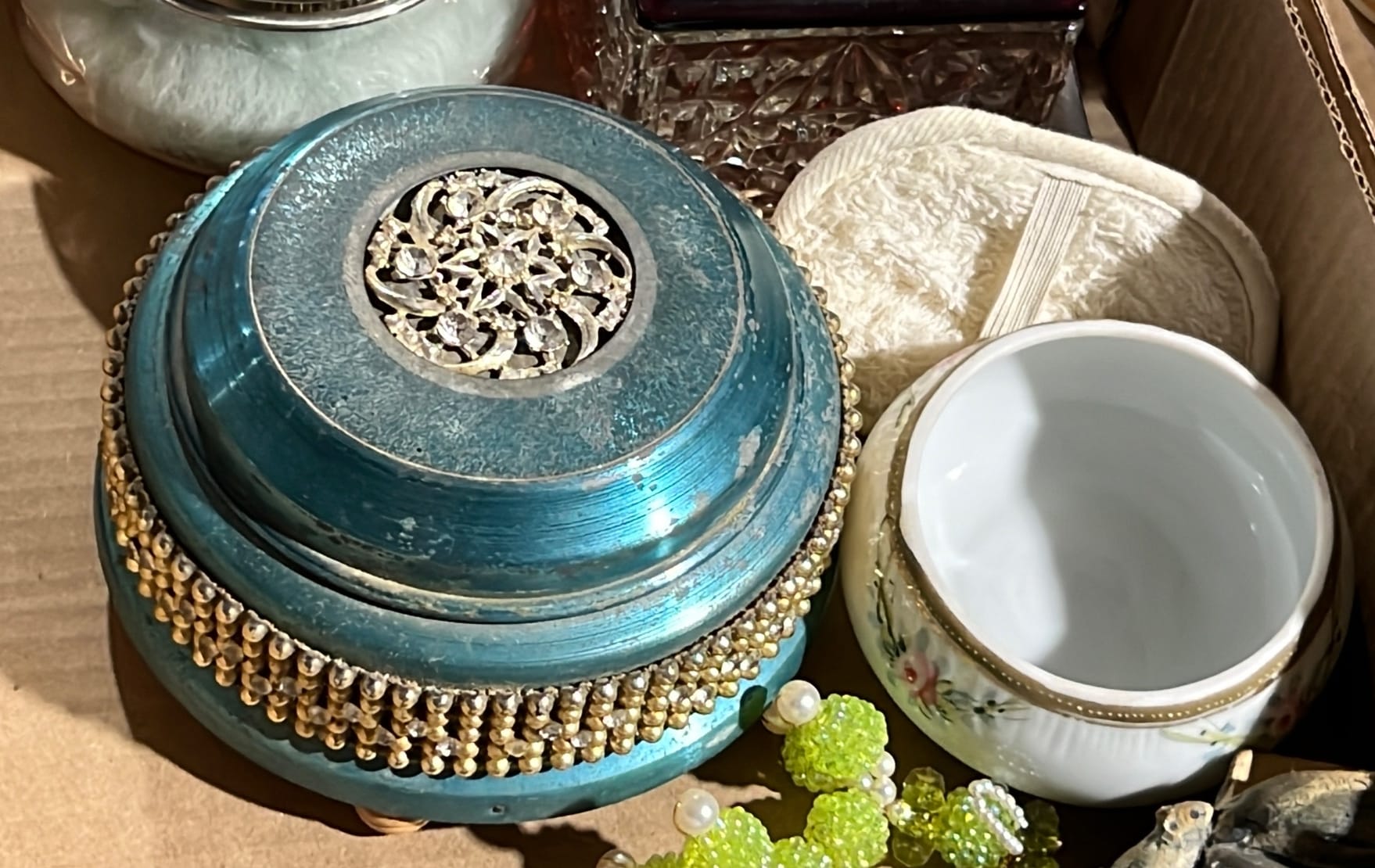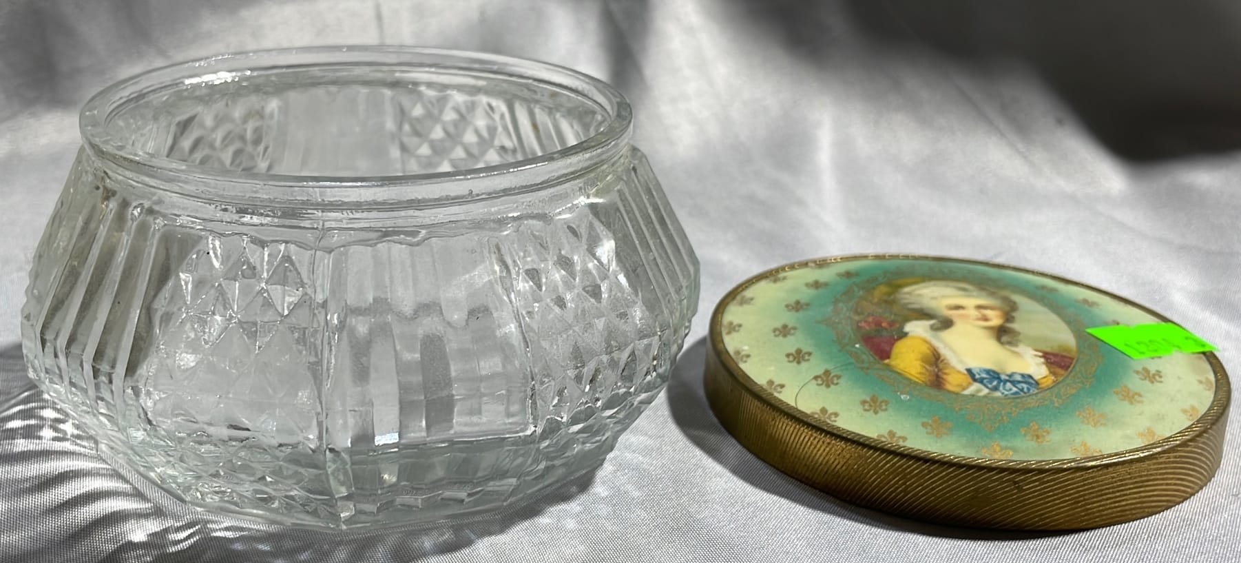 2010 Vintage metal music box ,5.5”, Avon porcelain covered music box , vintage powder jar , clear and ruby glass covered dish , frosted glass rabbit candle holder ,miscellaneous