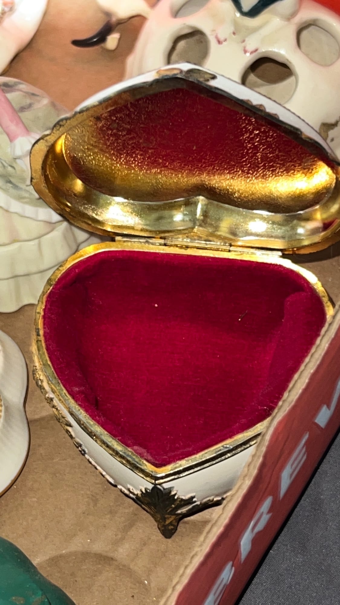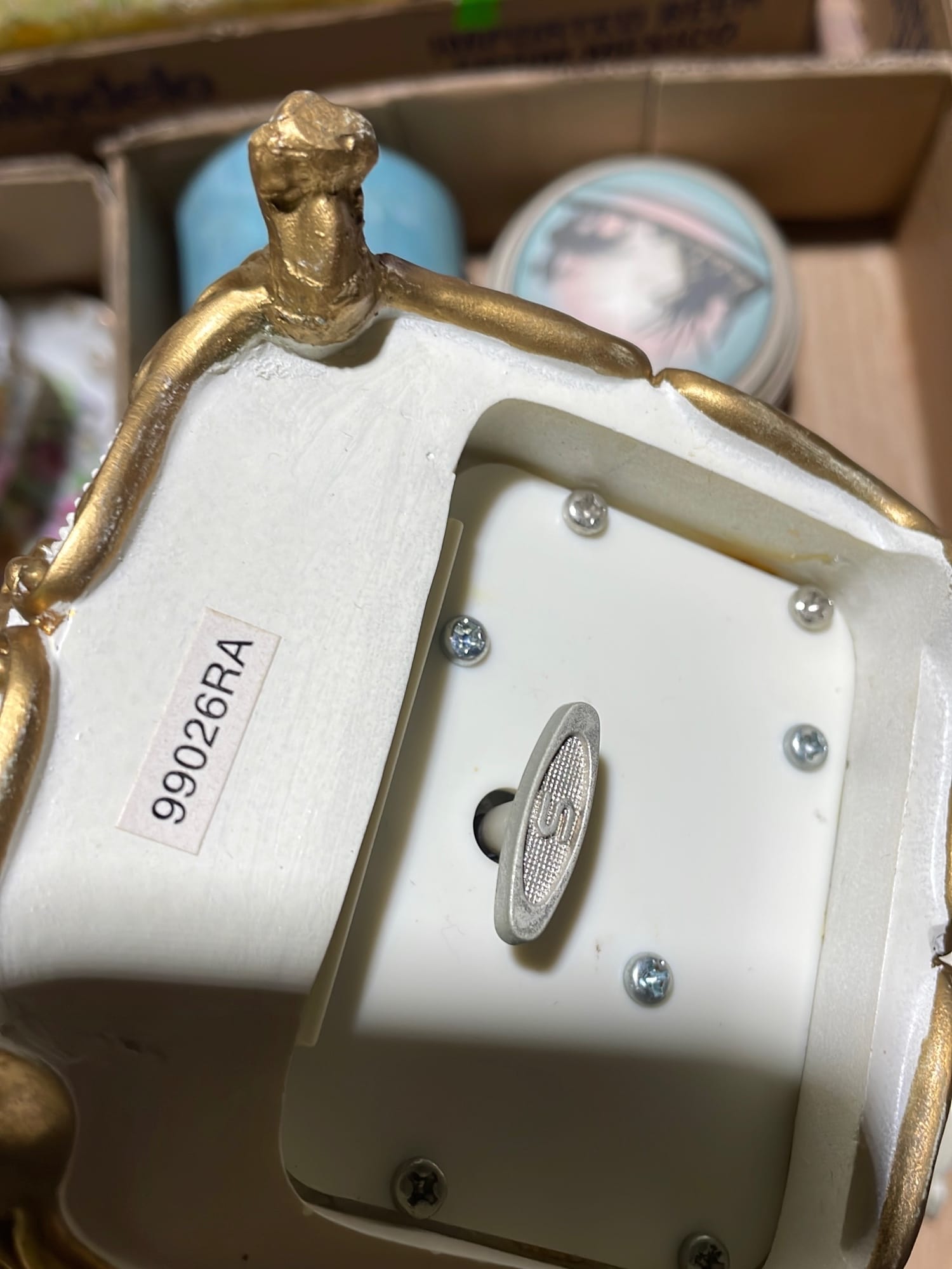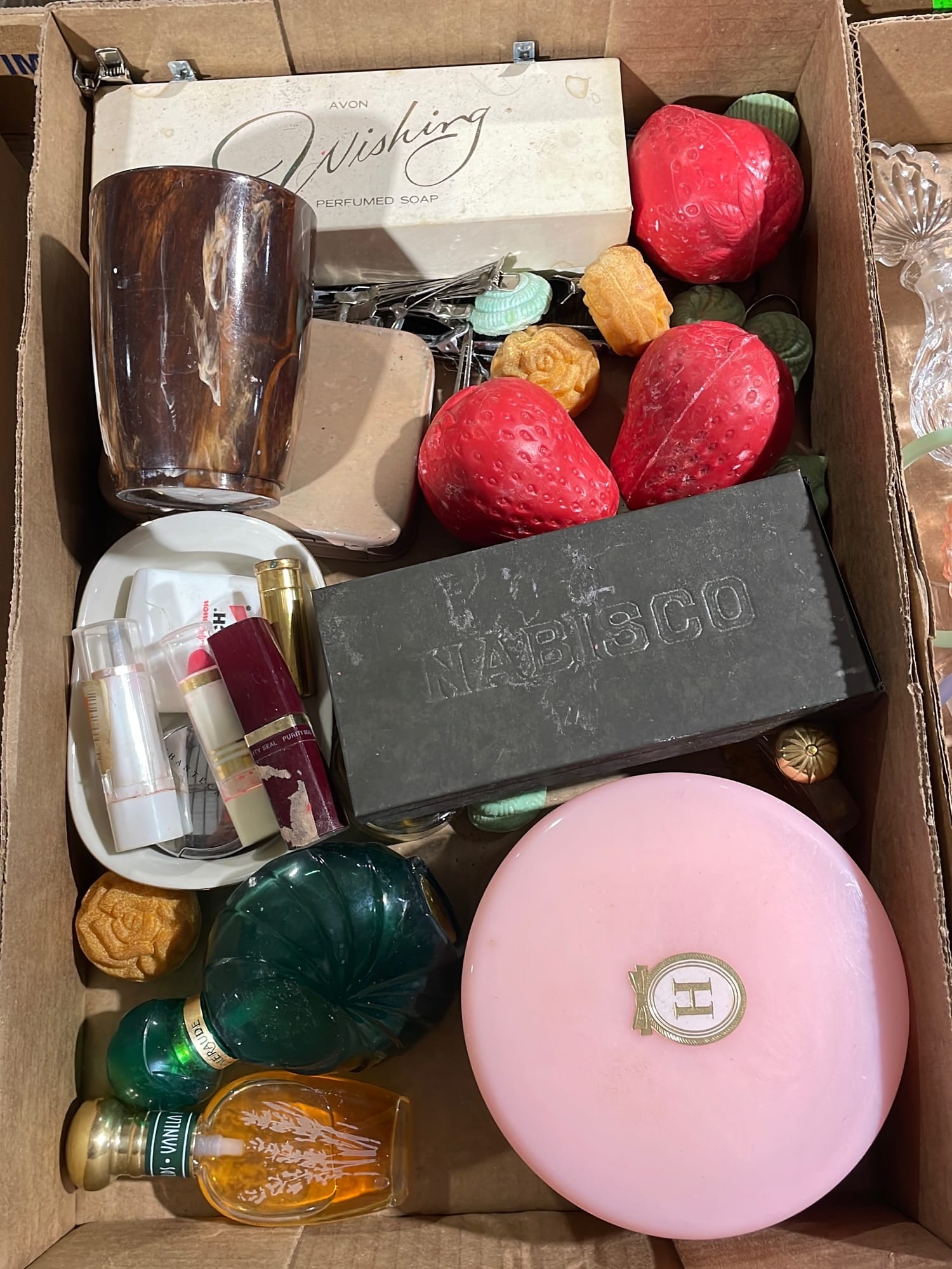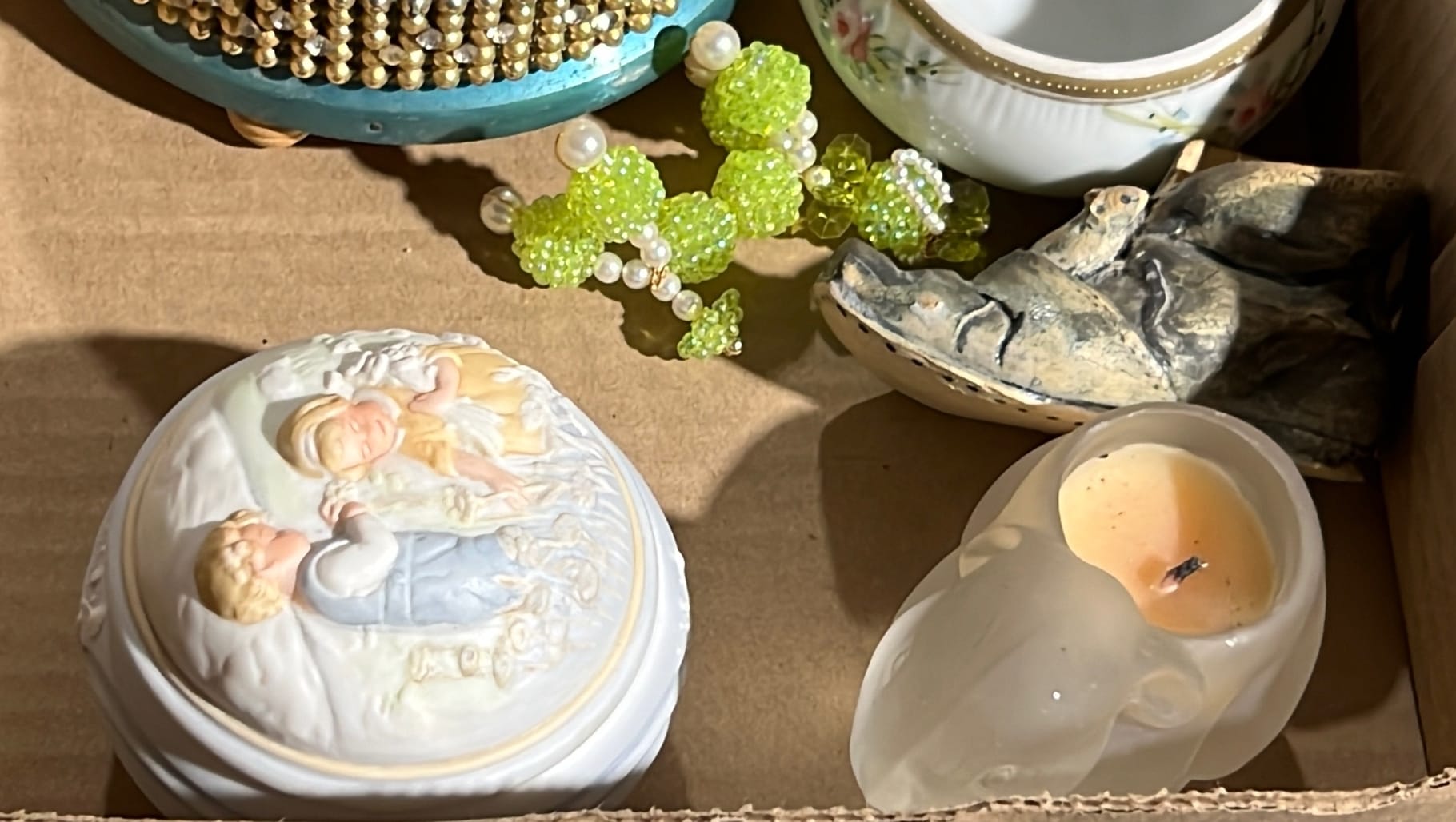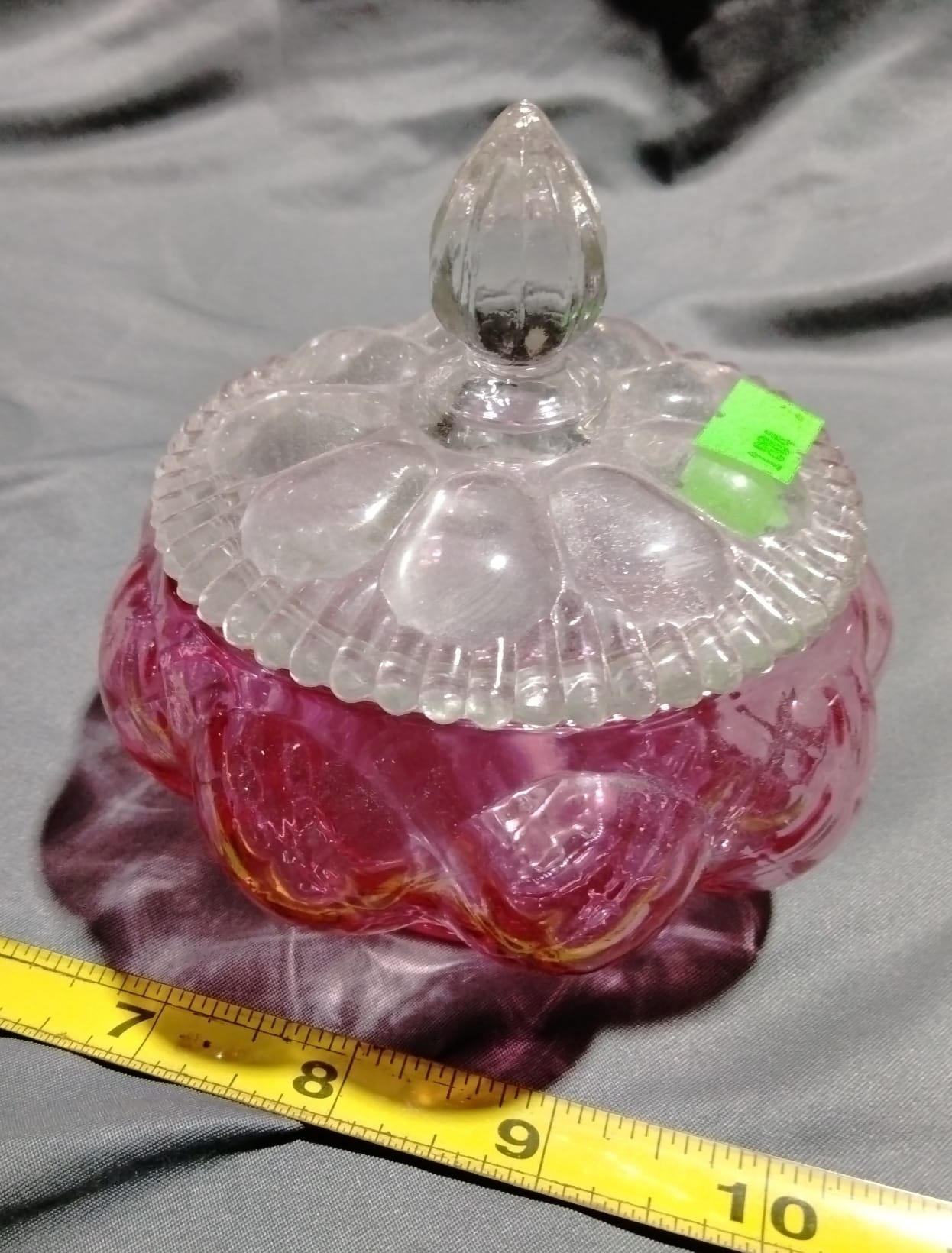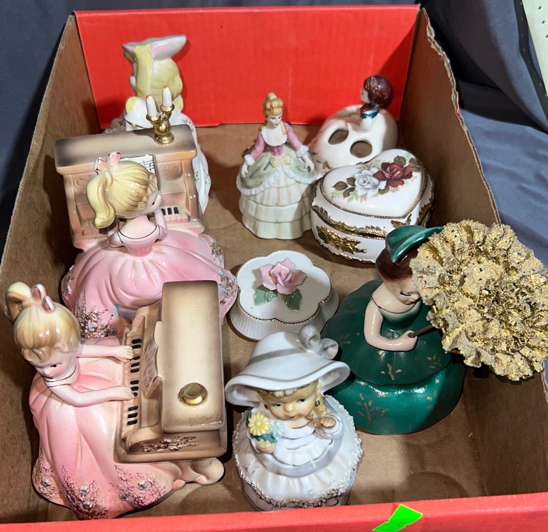 2010 Vintage metal music box ,5.5”, Avon porcelain covered music box , vintage powder jar , clear and ruby glass covered dish , frosted glass rabbit candle holder ,miscellaneous